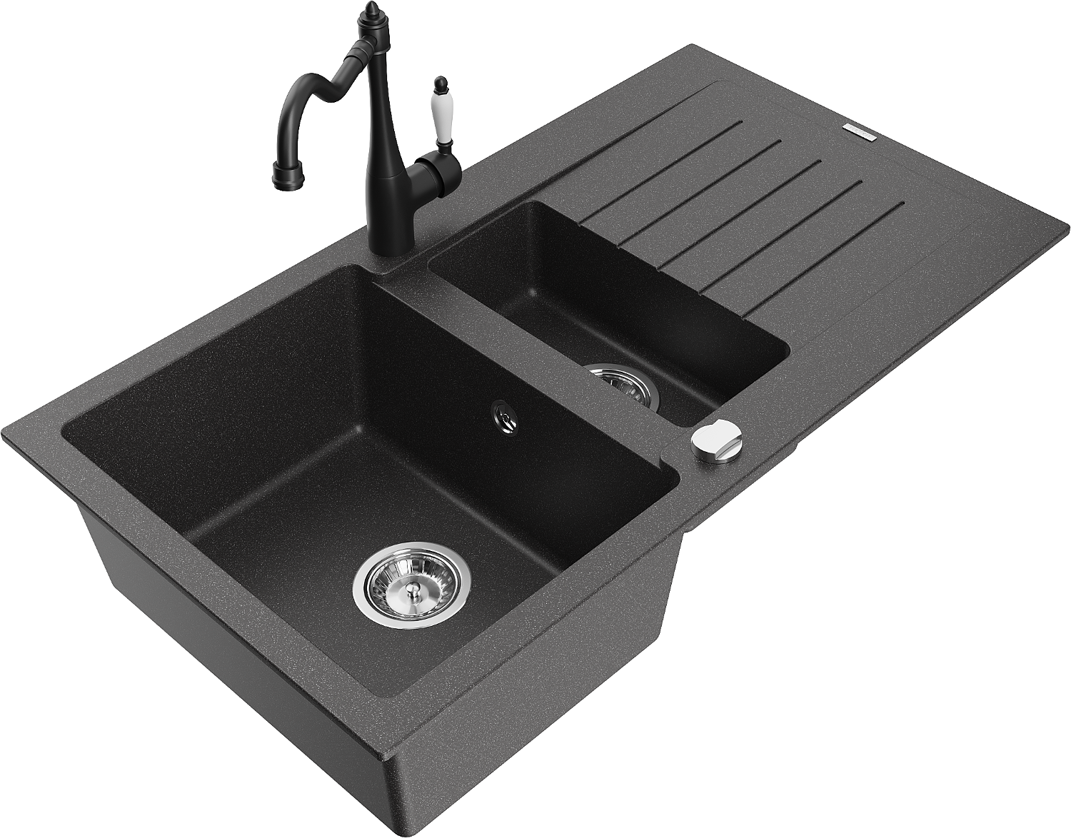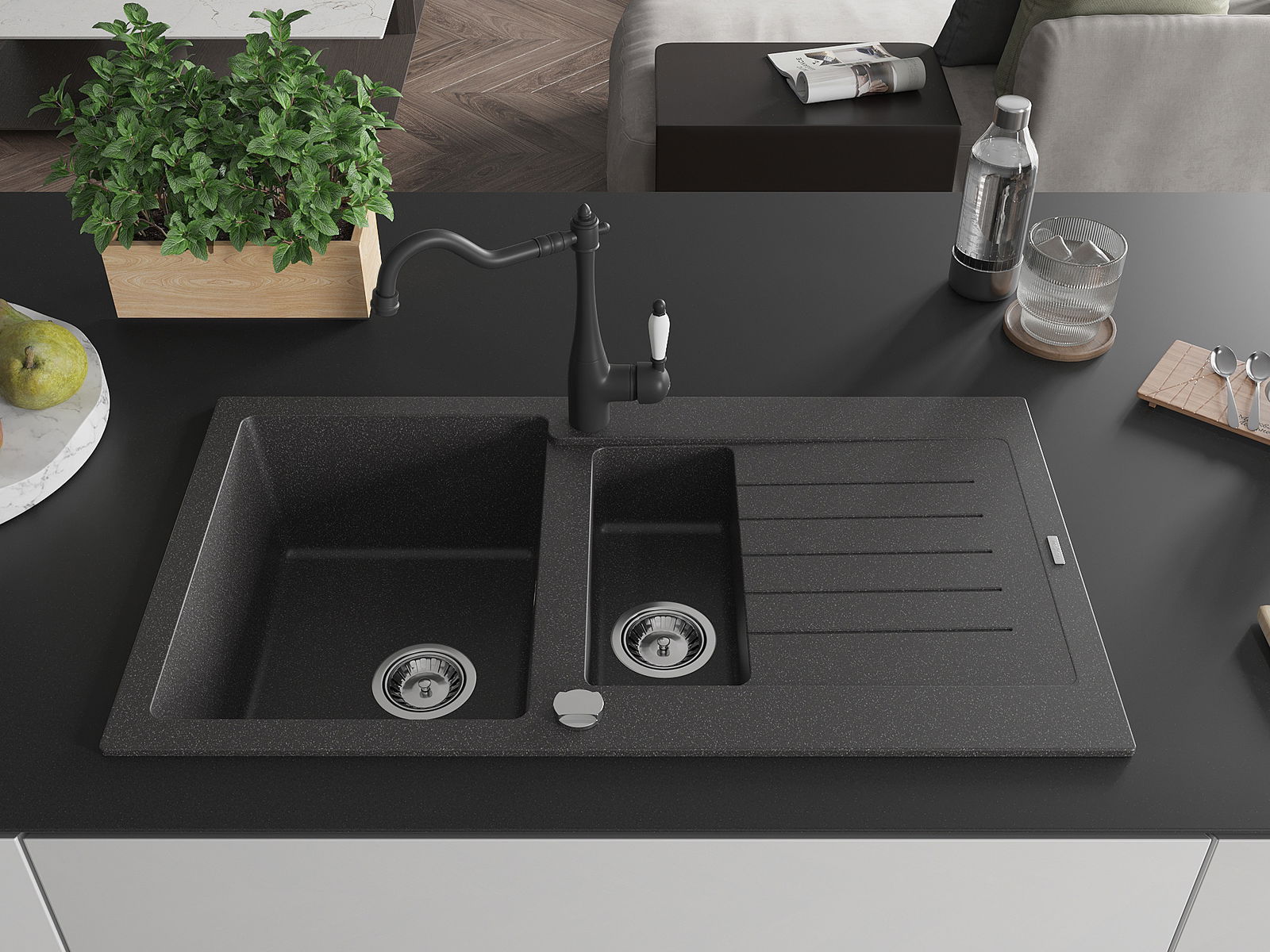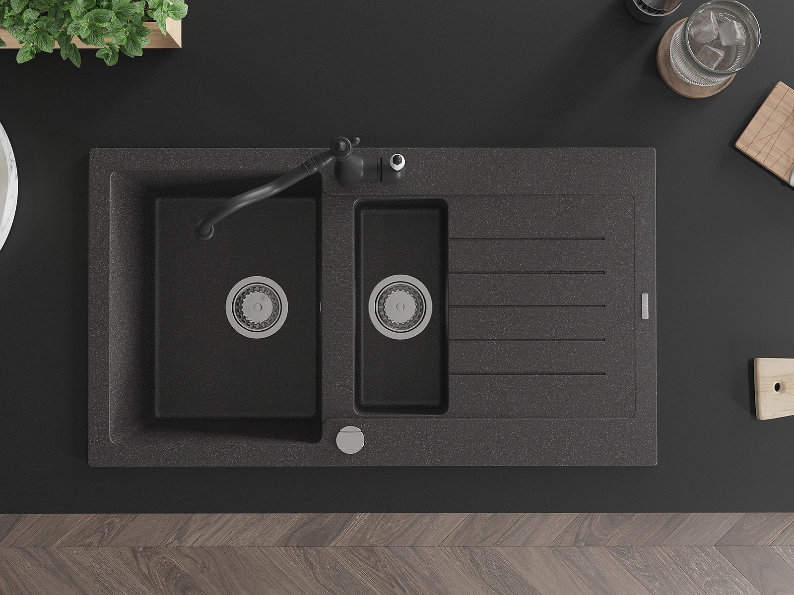 Mexen Matias granitinė plautuvė 1,5 skylių su nutekėjimu ir virtuvės maišytuvu Carla, juodas dėmėtas - 6502-76-670700-70