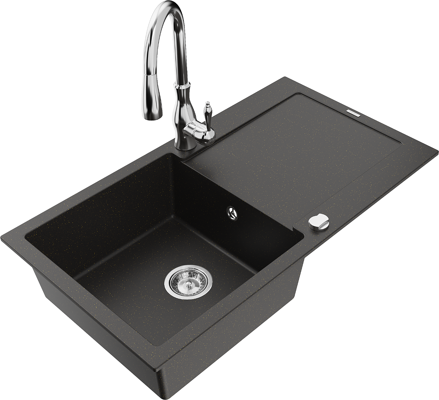 Mexen Leo granitinė vienos kameros plautuvė su nubėgėjančiu paviršiumi ir Savita virtuviniu maišytuvu, juoda/auksinis