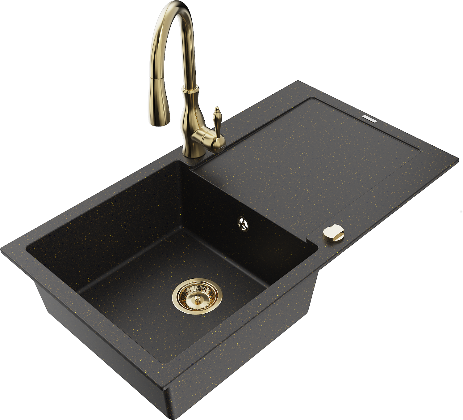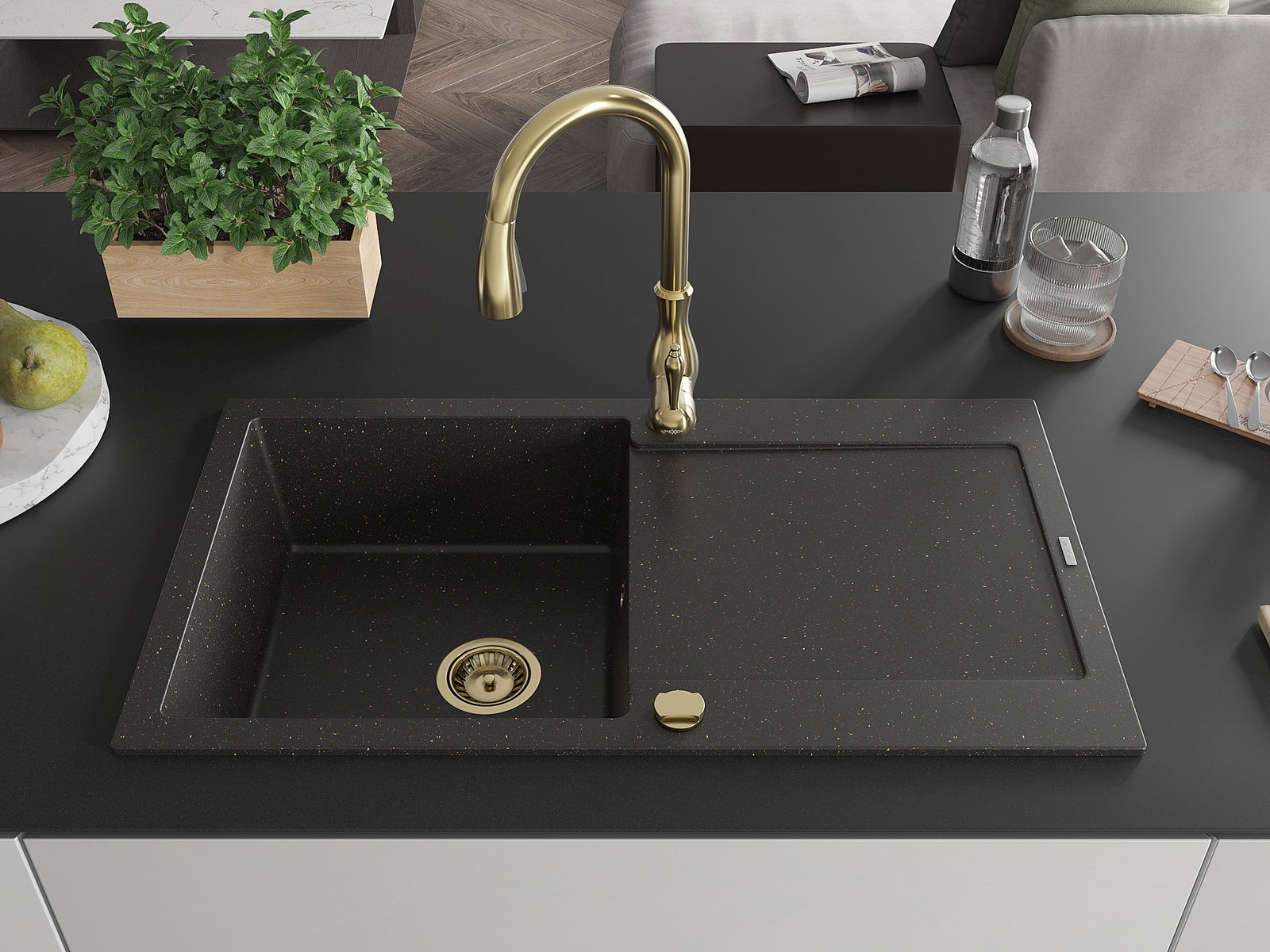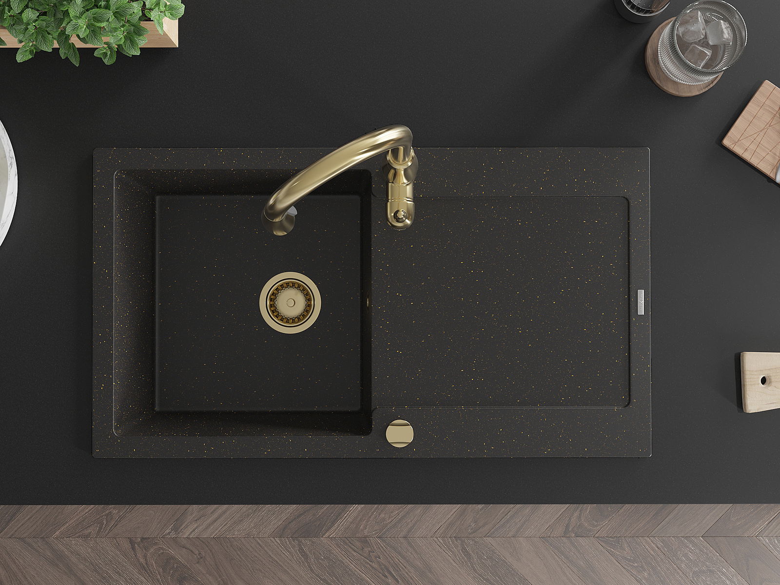 Mexen Leo 1-skylių granito plautuvė su nutekamąja lėkšte ir virtuviniu maišytuvu Savita, juoda/auksinė metalo