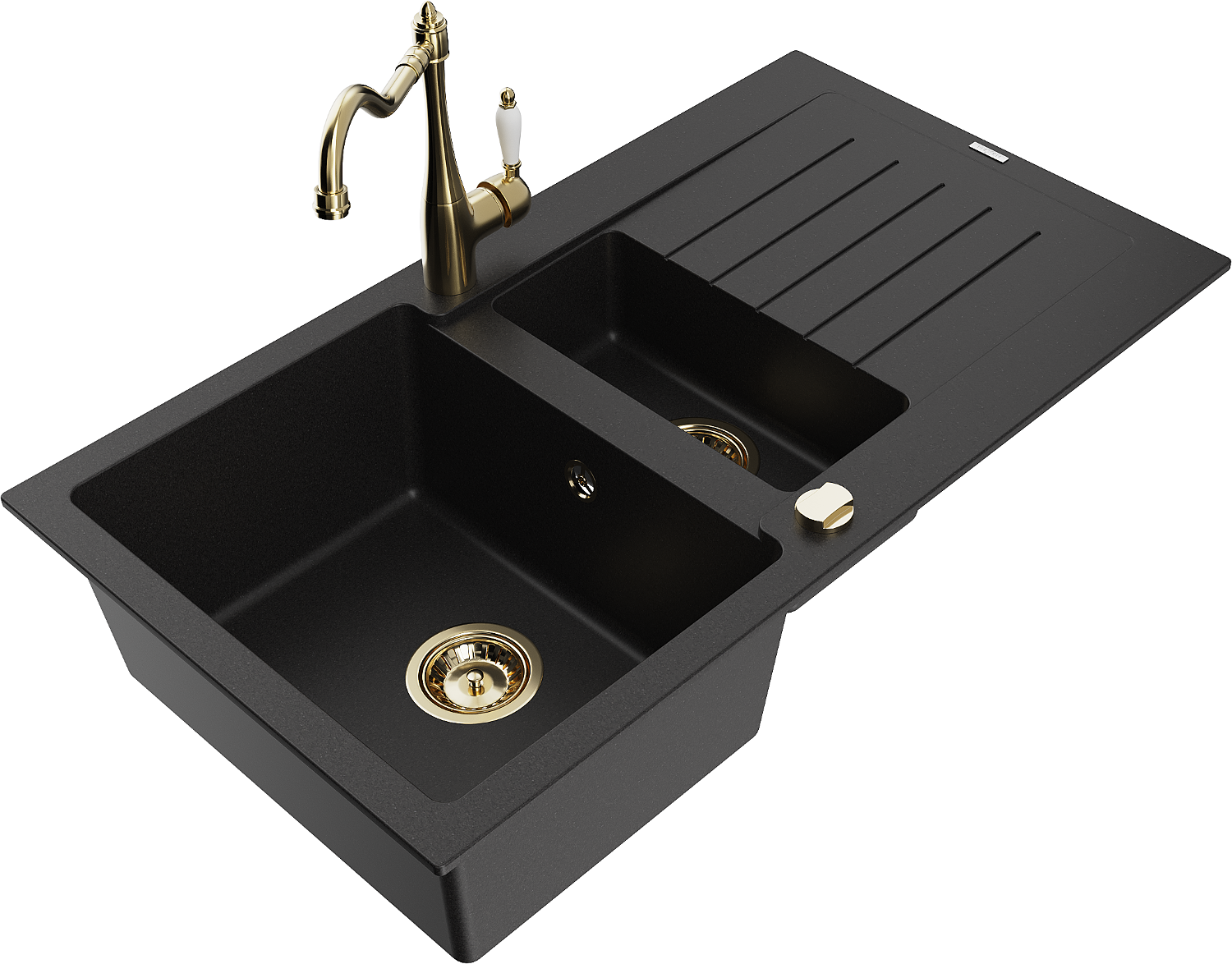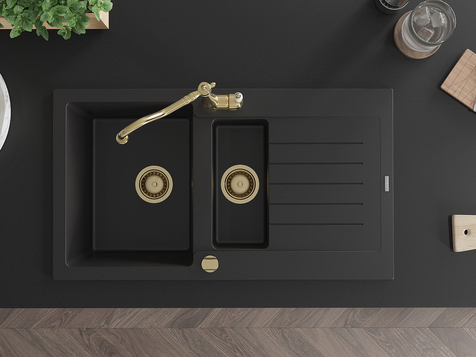 Mexen Matias granitinė plautuvė 1,5 skyrių su nuteka ir virtuvės maišytuvu Carla, juoda - 6502-77-670700-50