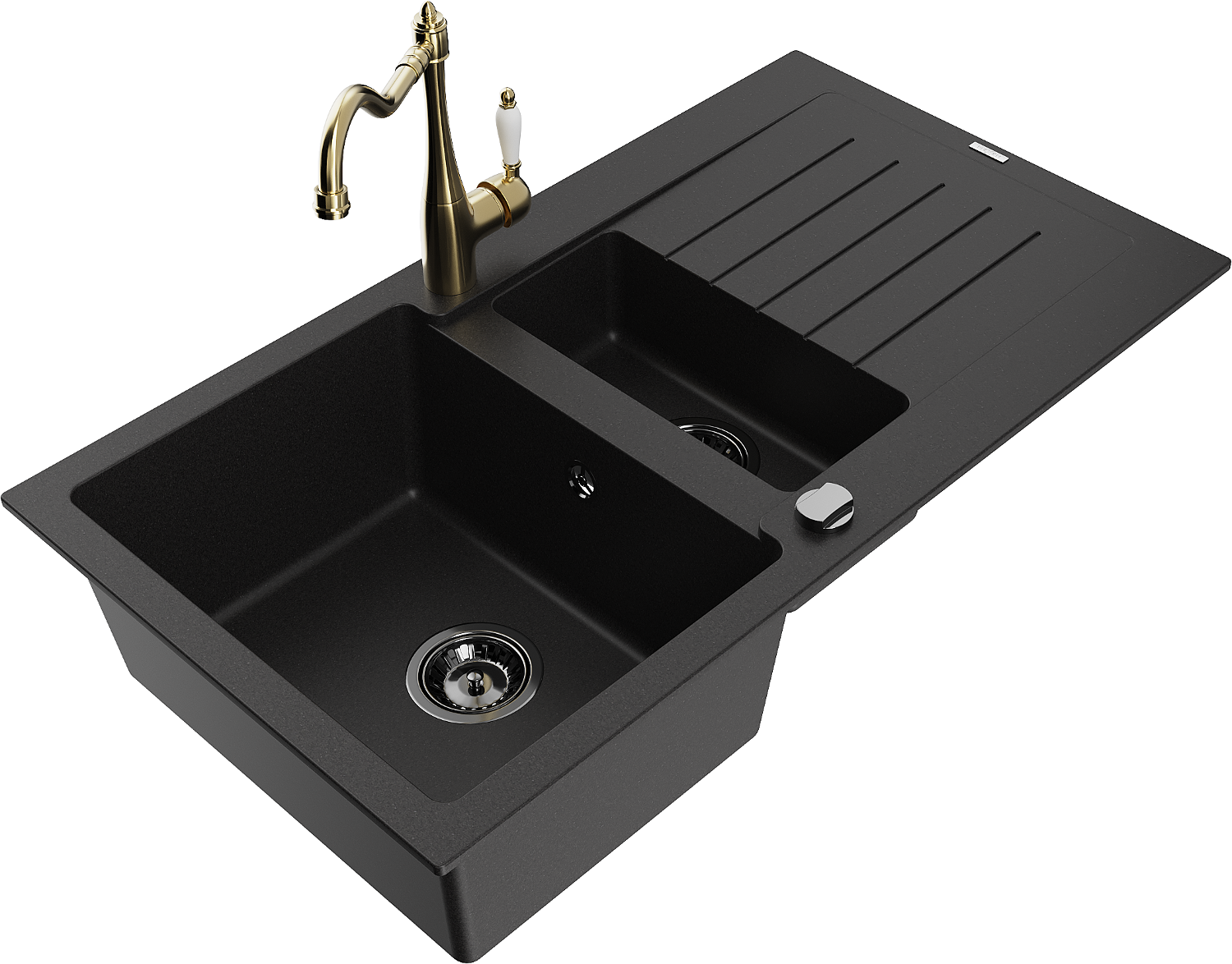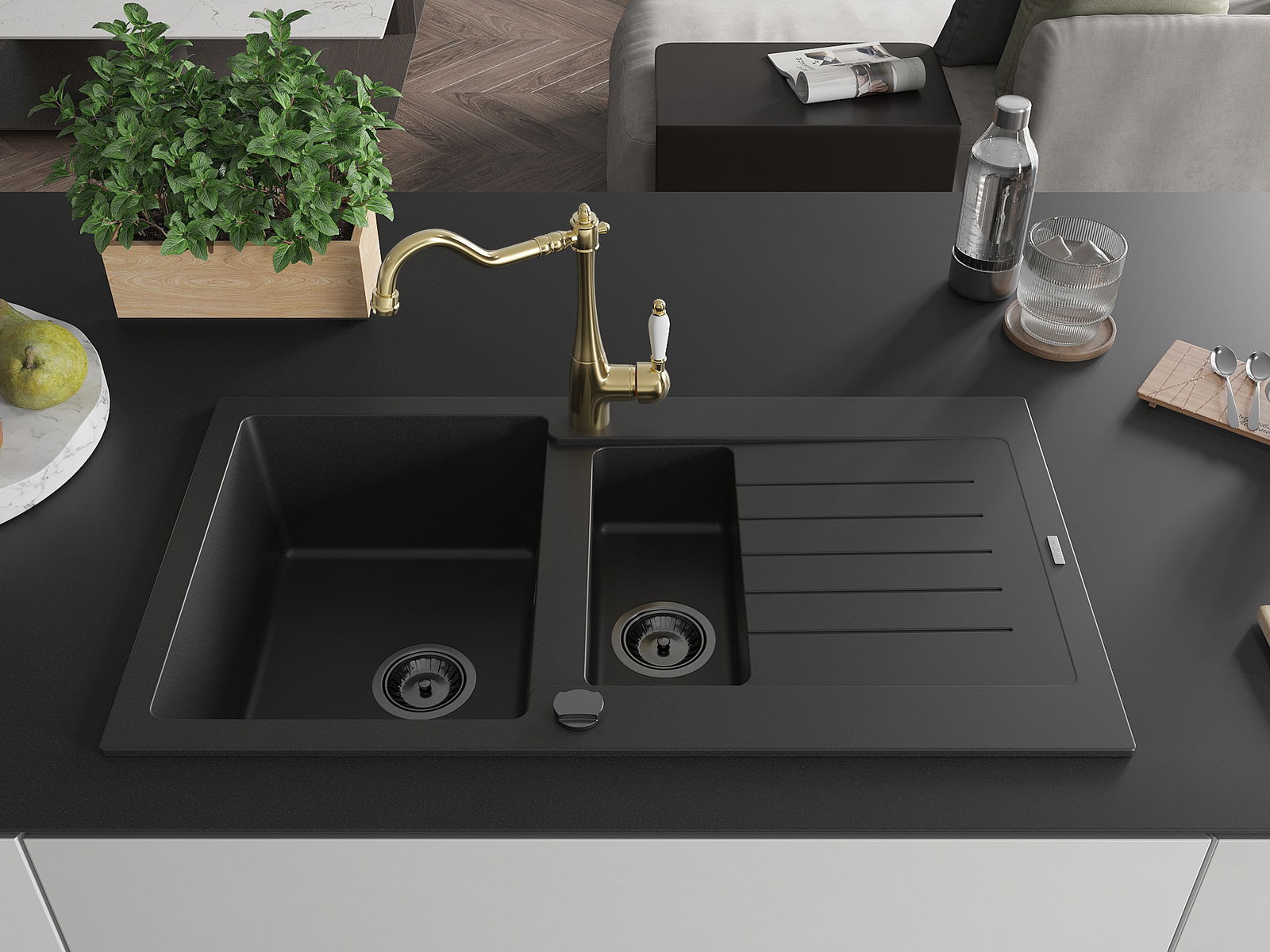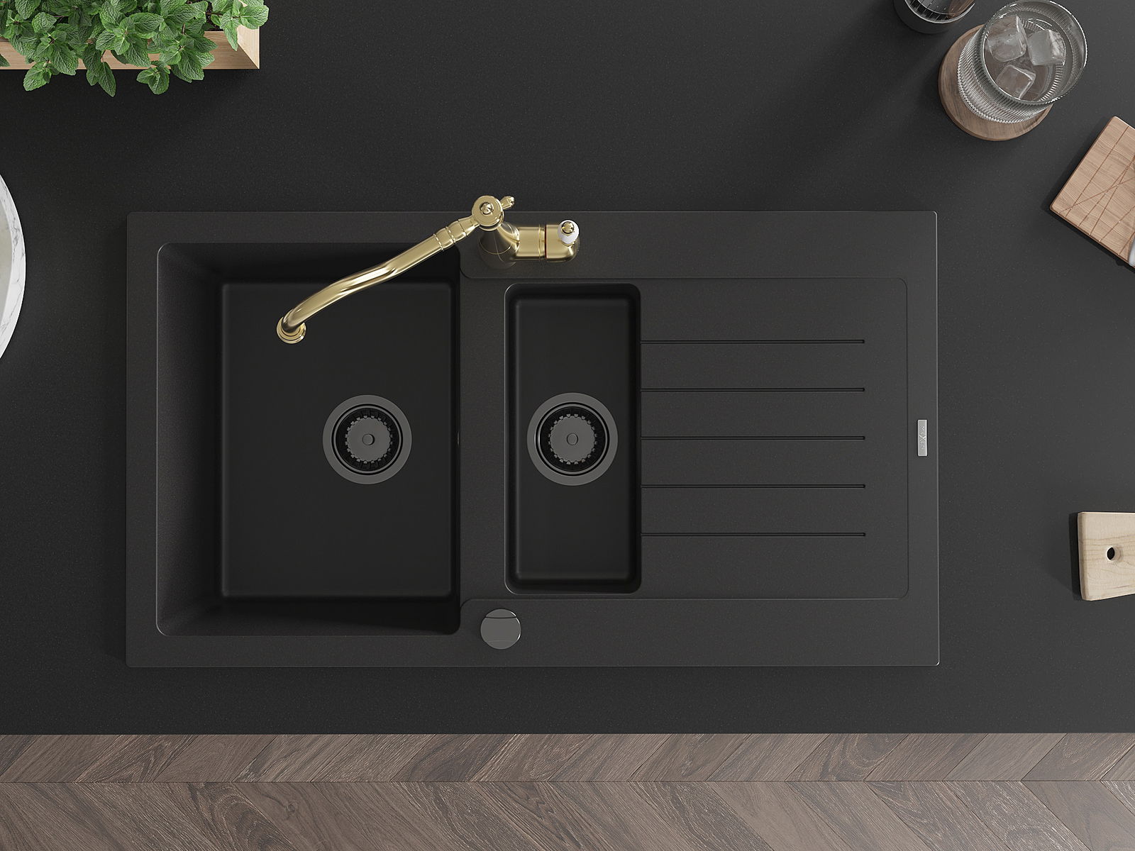Mexen Matias granito plautuvė 1,5 kameros su nuotekomis ir virtuvės maišytuvu Carla, juoda - 6502-77-670700-50-B