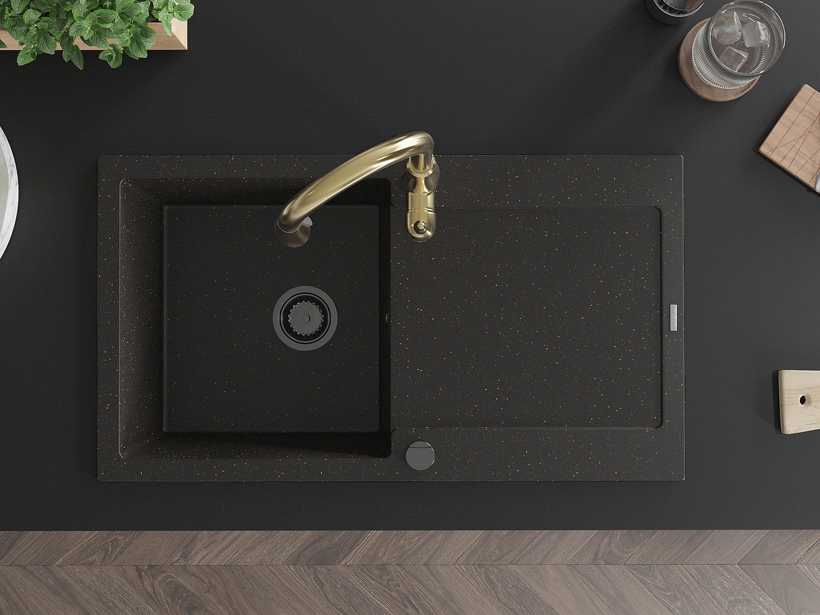 Mexen Leo granitinis virtuvės kriauklė 1 skyrelis su nusausinimo lentynėle ir virtuvės maišytuvu Savita, juoda/auksinė metalik ?