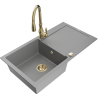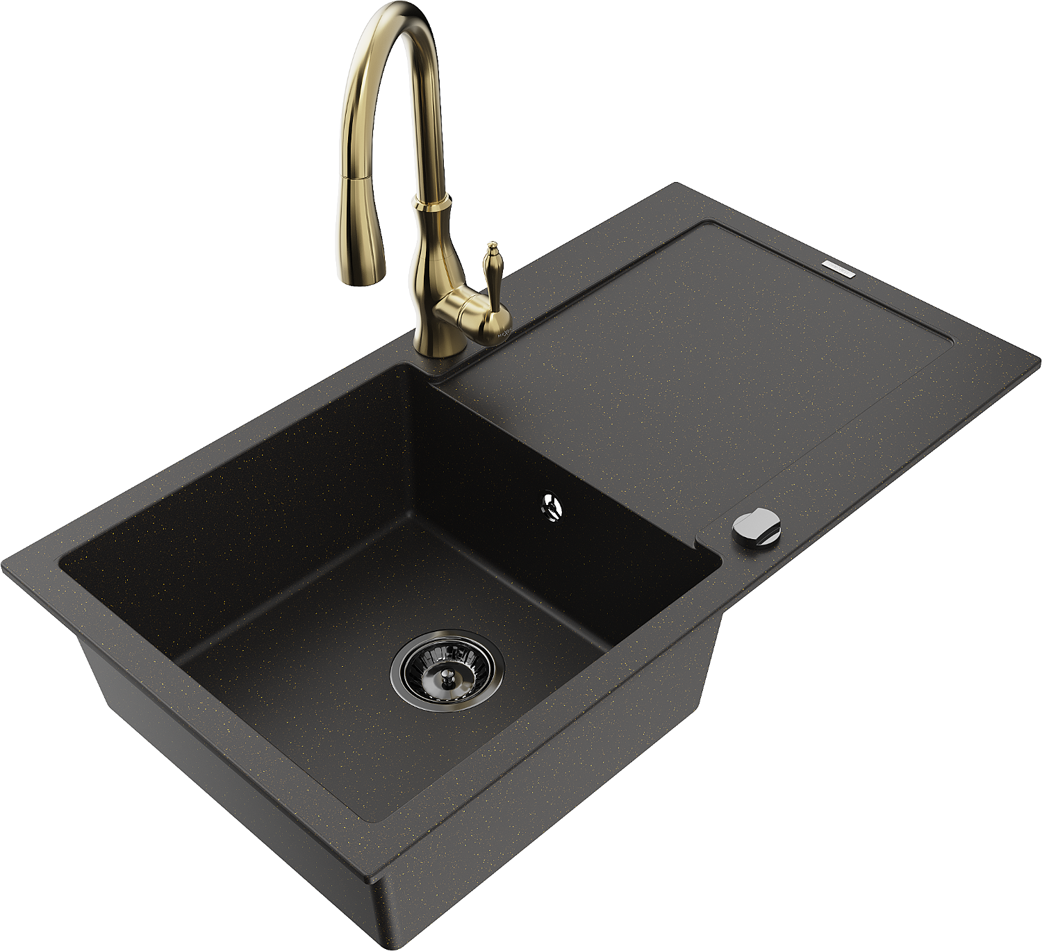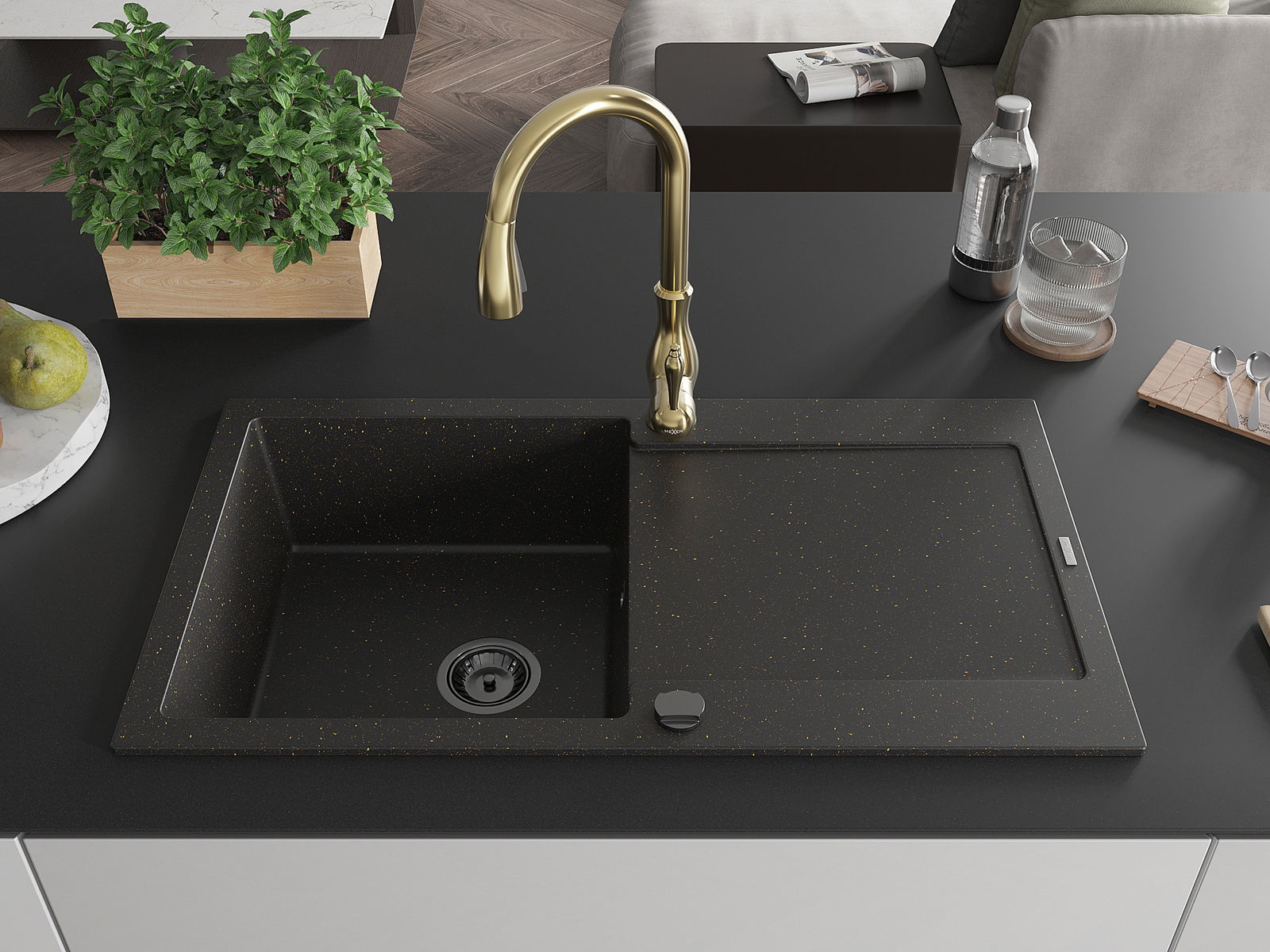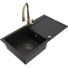 Mexen Leo grindinis virtuvės kriauklė su viena kamera, su nutekėjimo sistema ir virtuvės maišytuvu 'Savita', juoda/aukso