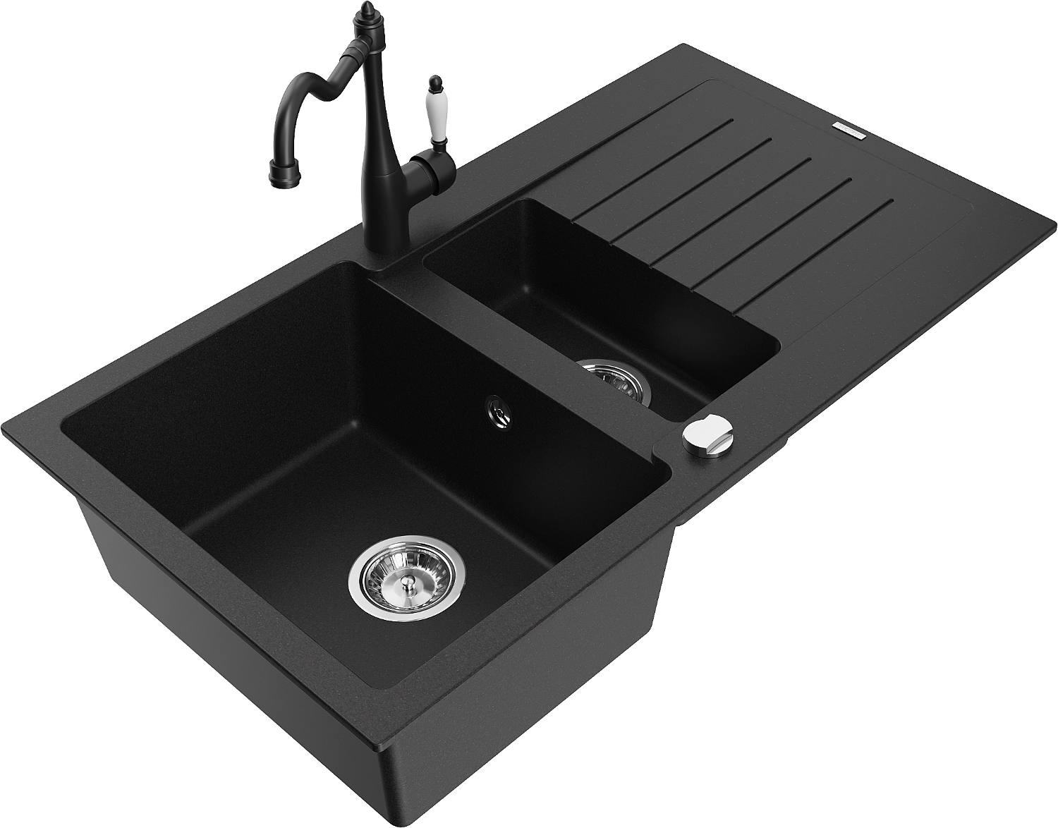 Mexen Matias granito kriauklė 1,5 kamerų su nutekėjimu ir virtuvės maišytuvu Carla, juoda - 6502-77-670700-70