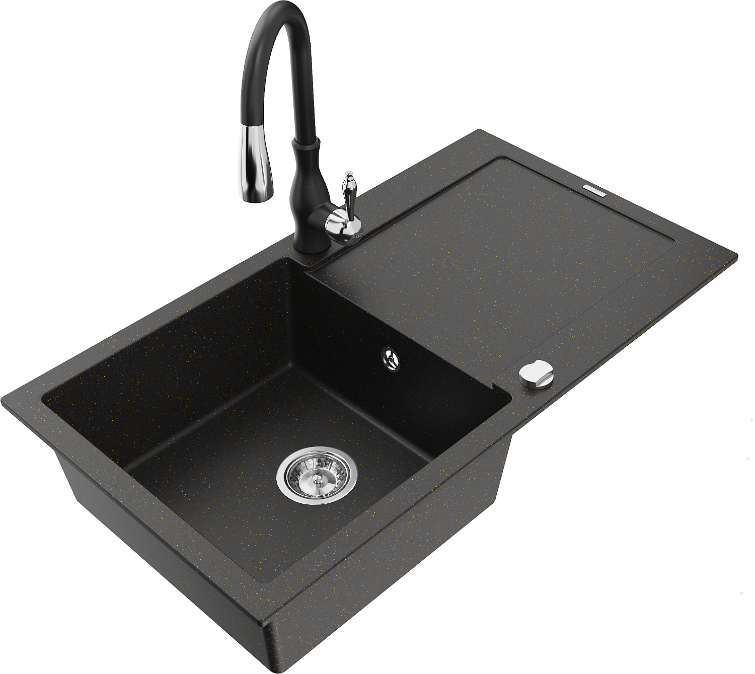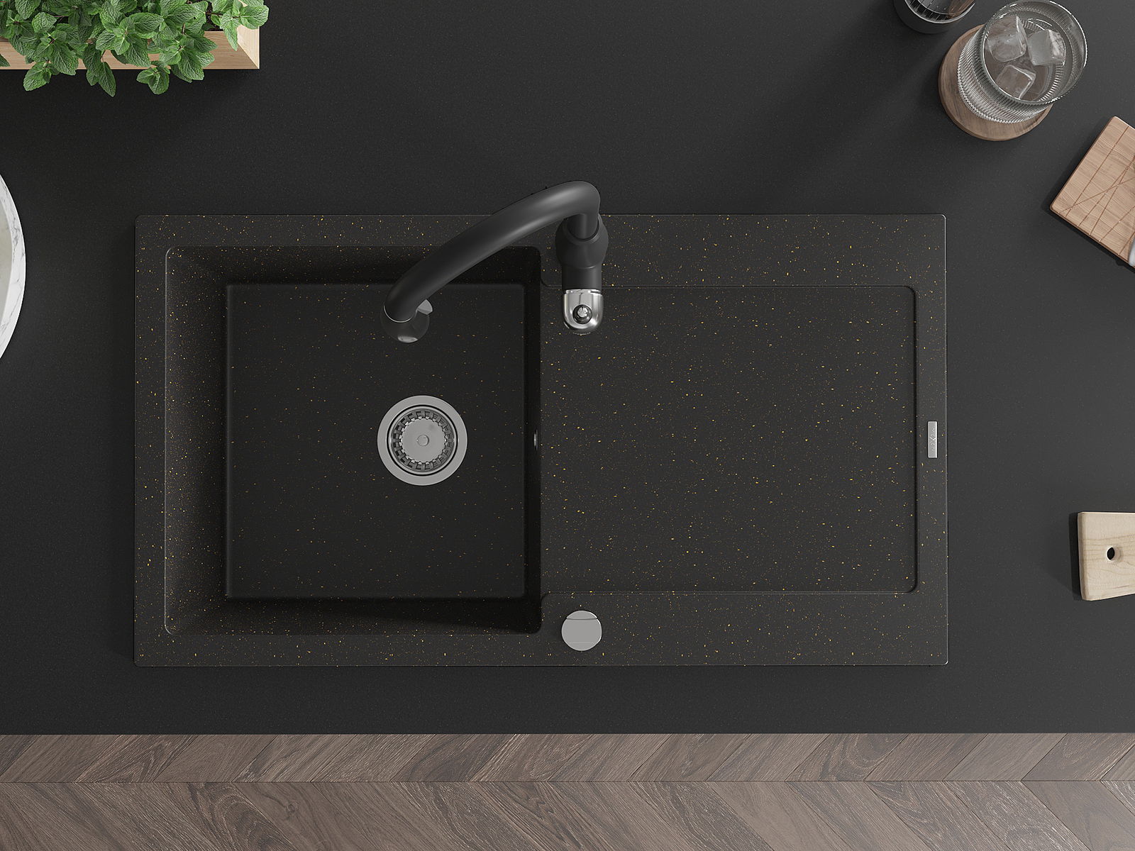 Mexen Leo granitinė vienos kameros kriauklė su nutekėjimu ir virtuviniu maišytuvu "Savita", juoda/auksinė metalo spalva