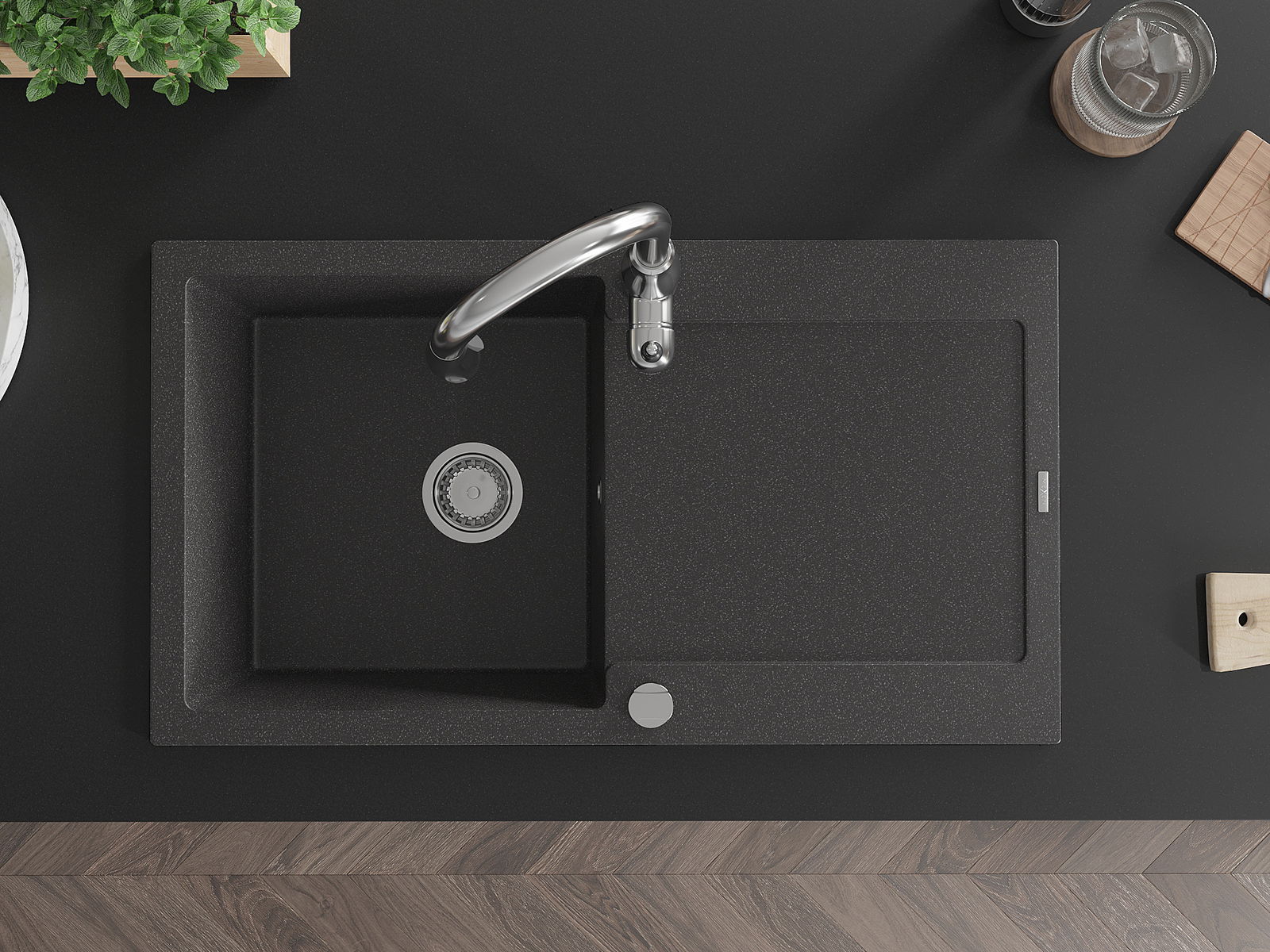 Mexen Leo granitinė vieno dubens plautuvė su nusausintuvu ir virtuviniu maišytuvu Savita, juodos spalvos su taškeliais