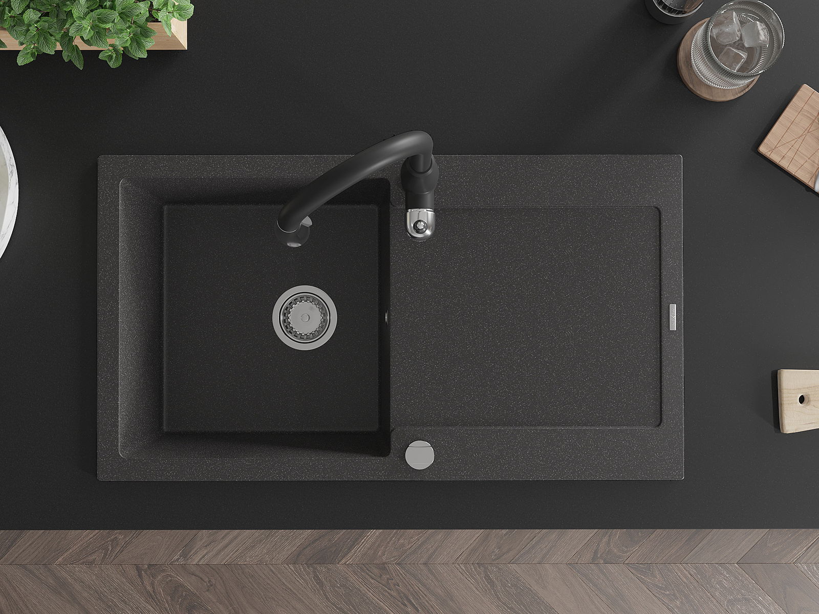 Mexen Leo vienos kameros granito kriauklė su lašintuvu ir virtuviniu maišytuvu Savita, juodas taškuotas - 6501-76-672601-70
