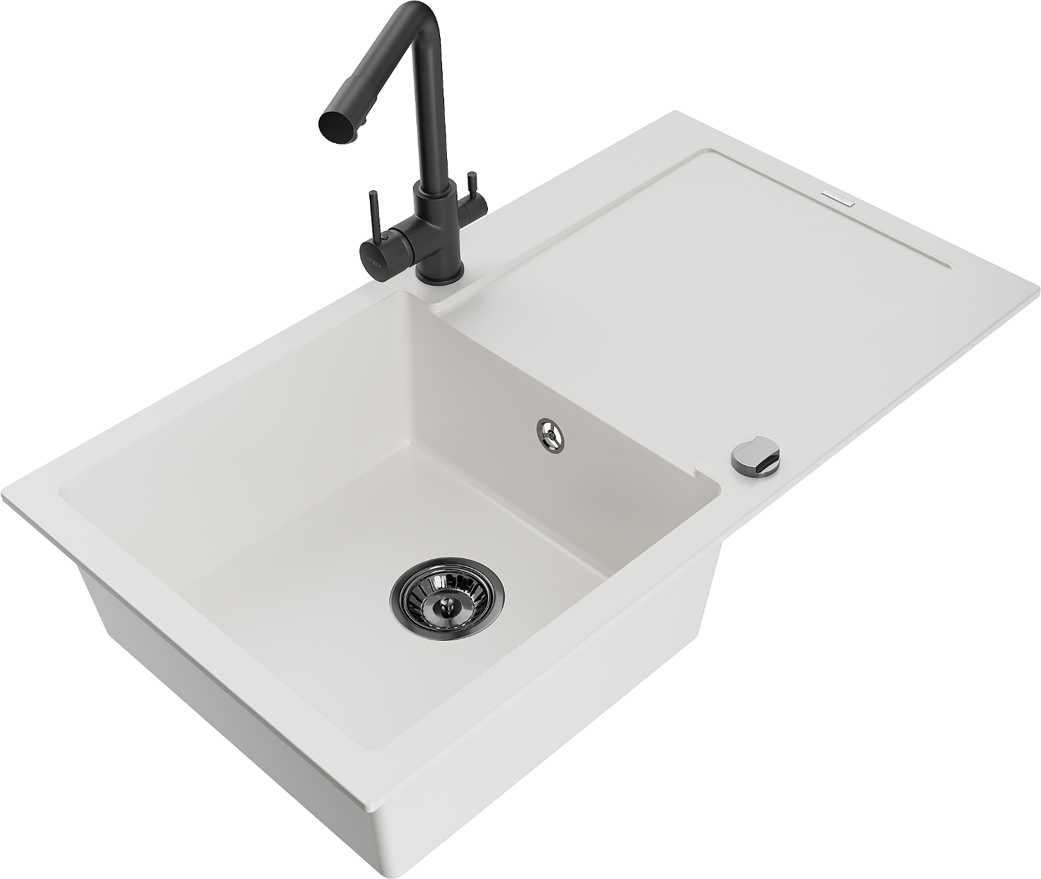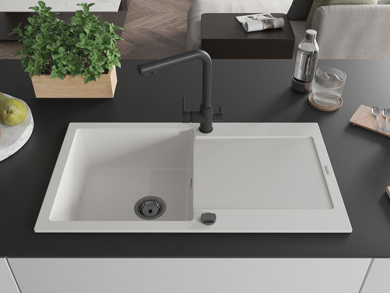 Mexen Leo granitinis vienos kameros plautuvė su nusausinimo zona ir virtuviniu maišytuvu Duero, baltas - 6501-20-671600-70