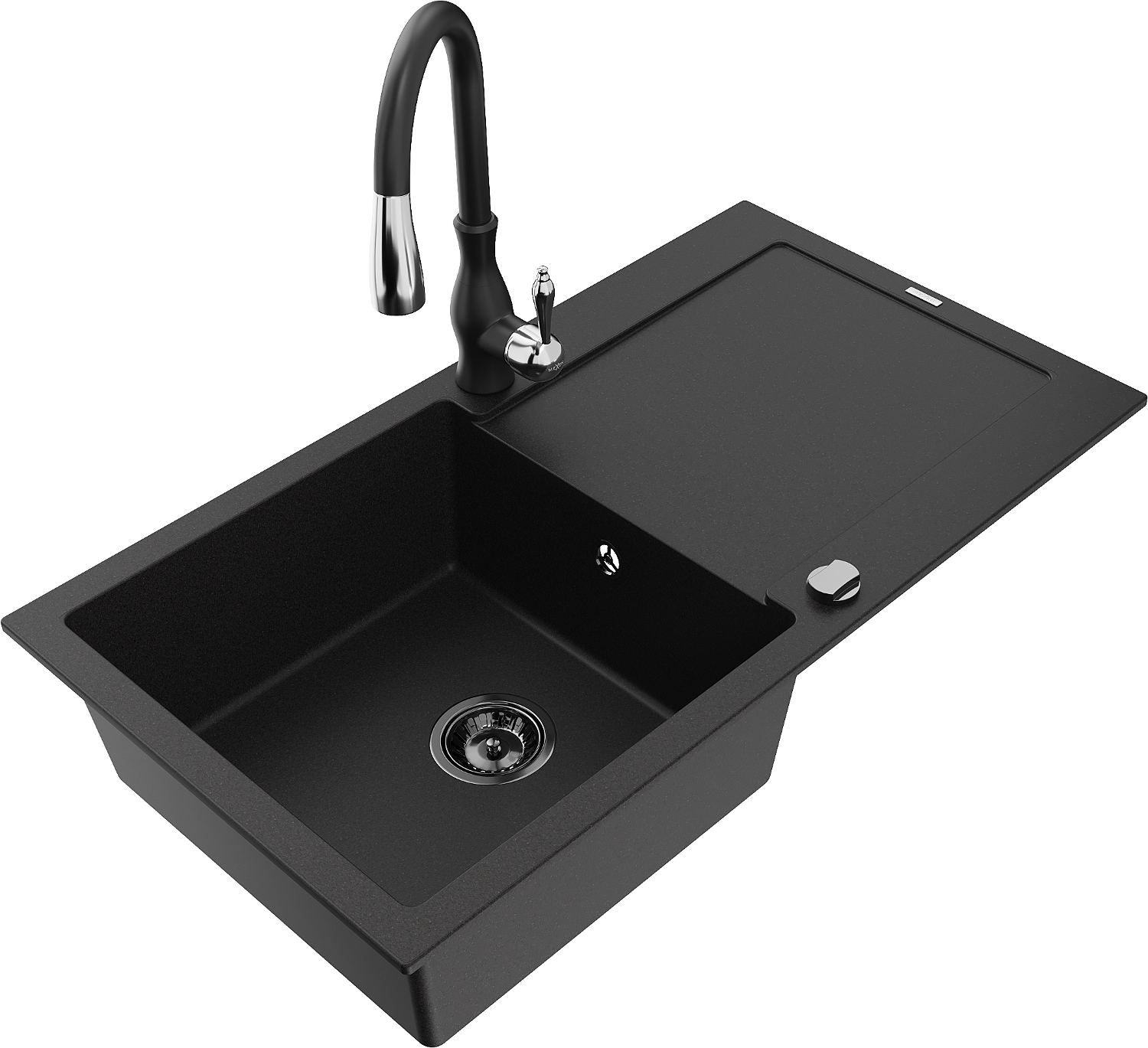 Mexen Leo granitinis vienos kameros plautuvė su nuvarvėtu ir virtuviniu maišytuvu Savita, juodas - 6501-77-672601-70-B