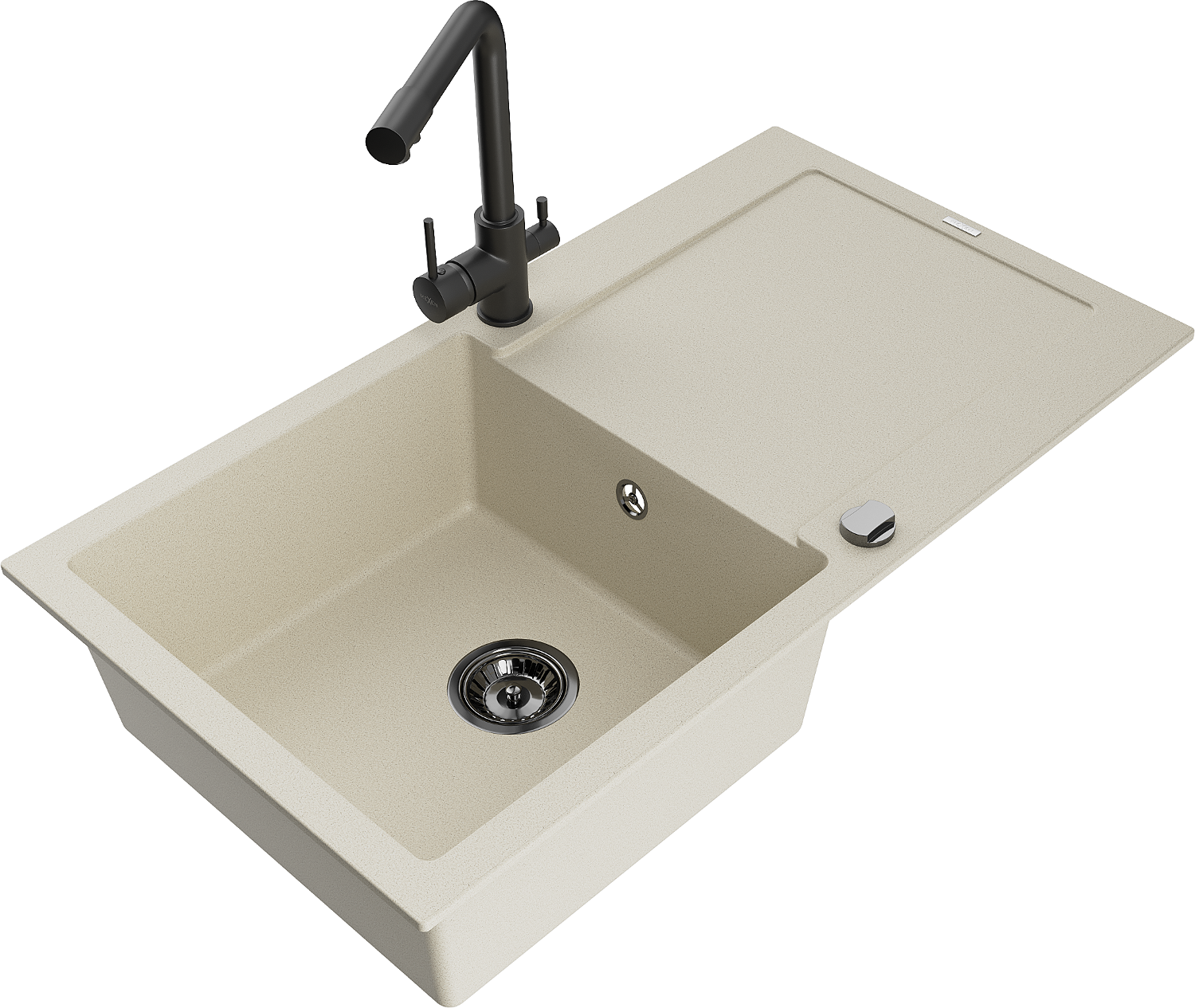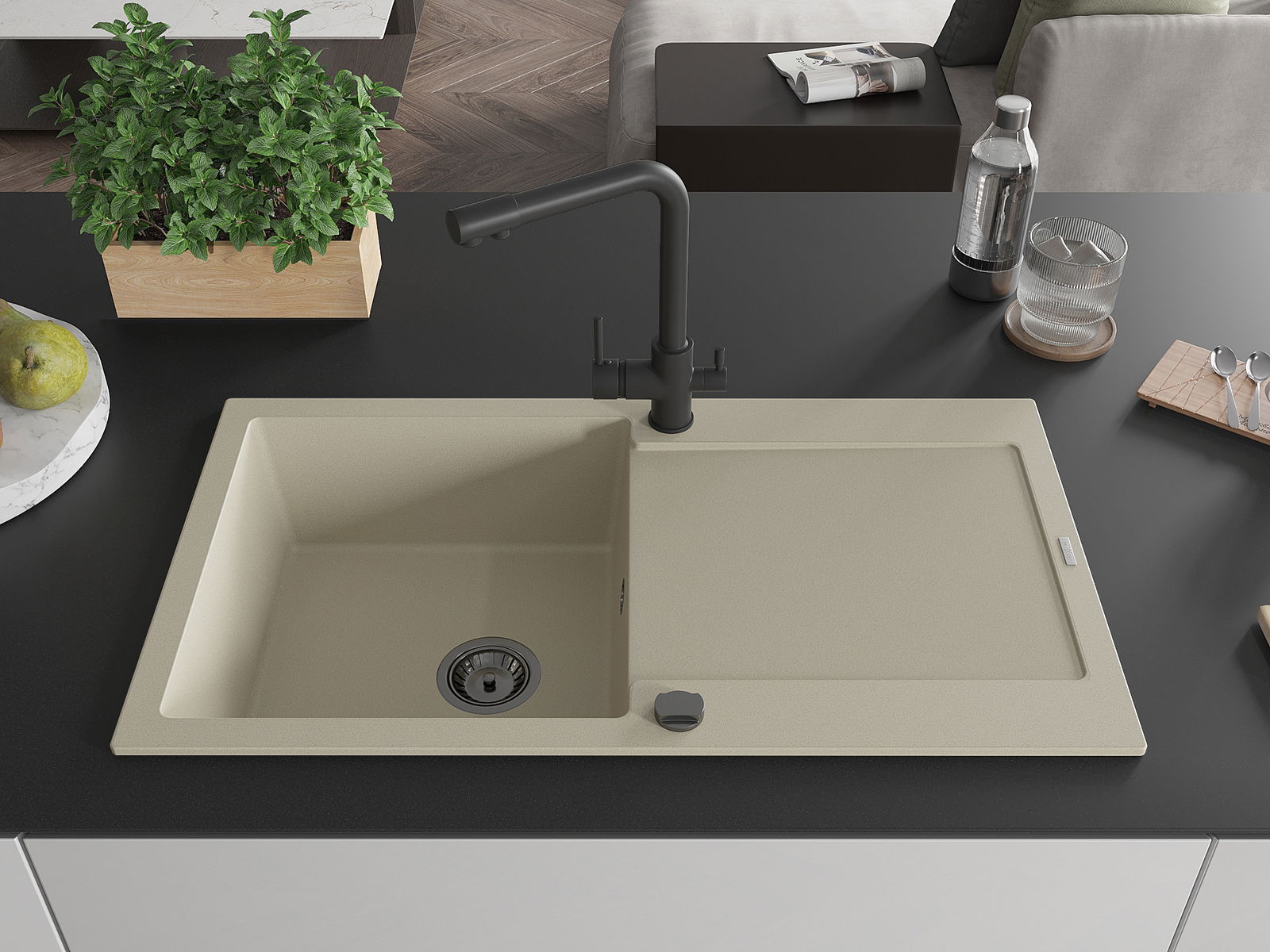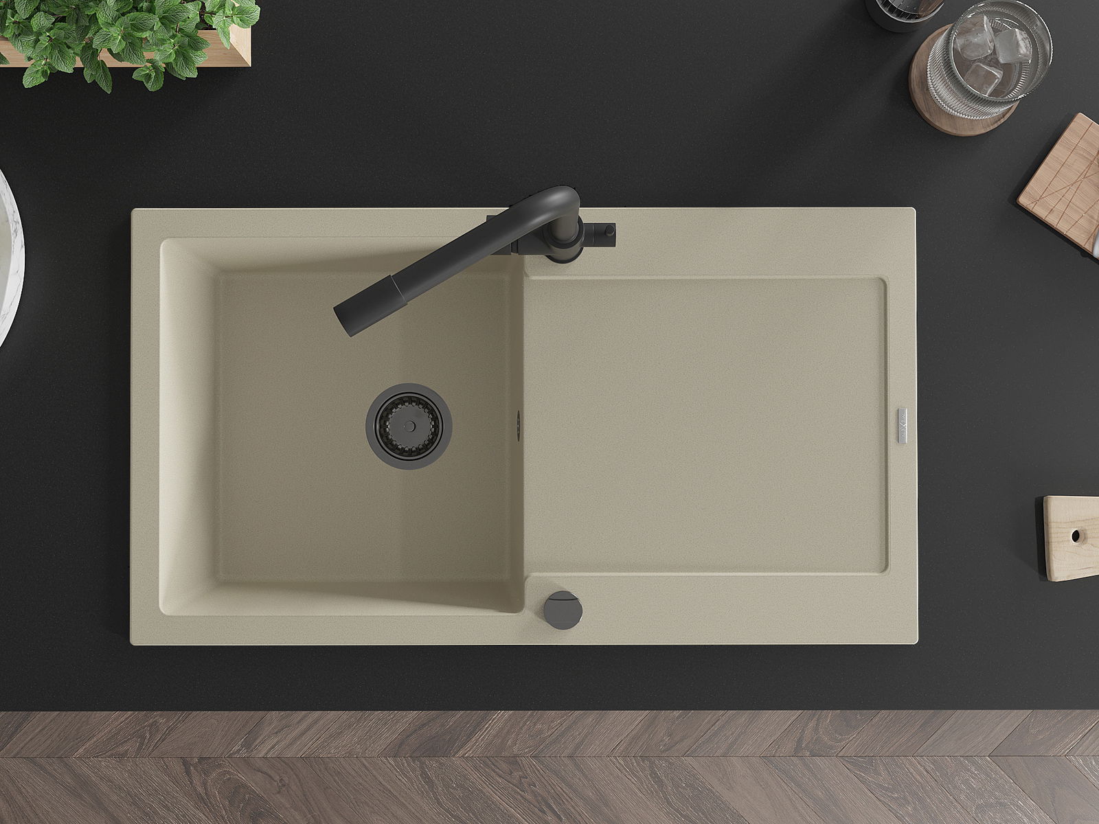 Mexen Leo granitinis vienos kameros kriauklė su nutekėjimu ir virtuviniu maišytuvu Duero, smėlio spalvos- 6501-69-671600-70