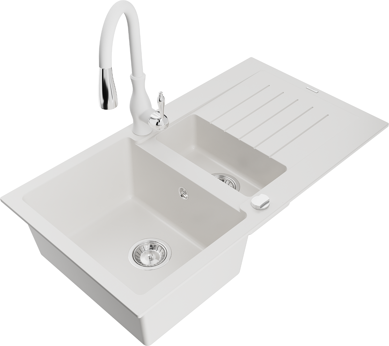 Mexen Matias granitinė 1,5 kamerų plautuvė su nuolaidžiu stalviršiu ir virtuviniu maišytuvu Savita, balta - 6502-20-672601-20