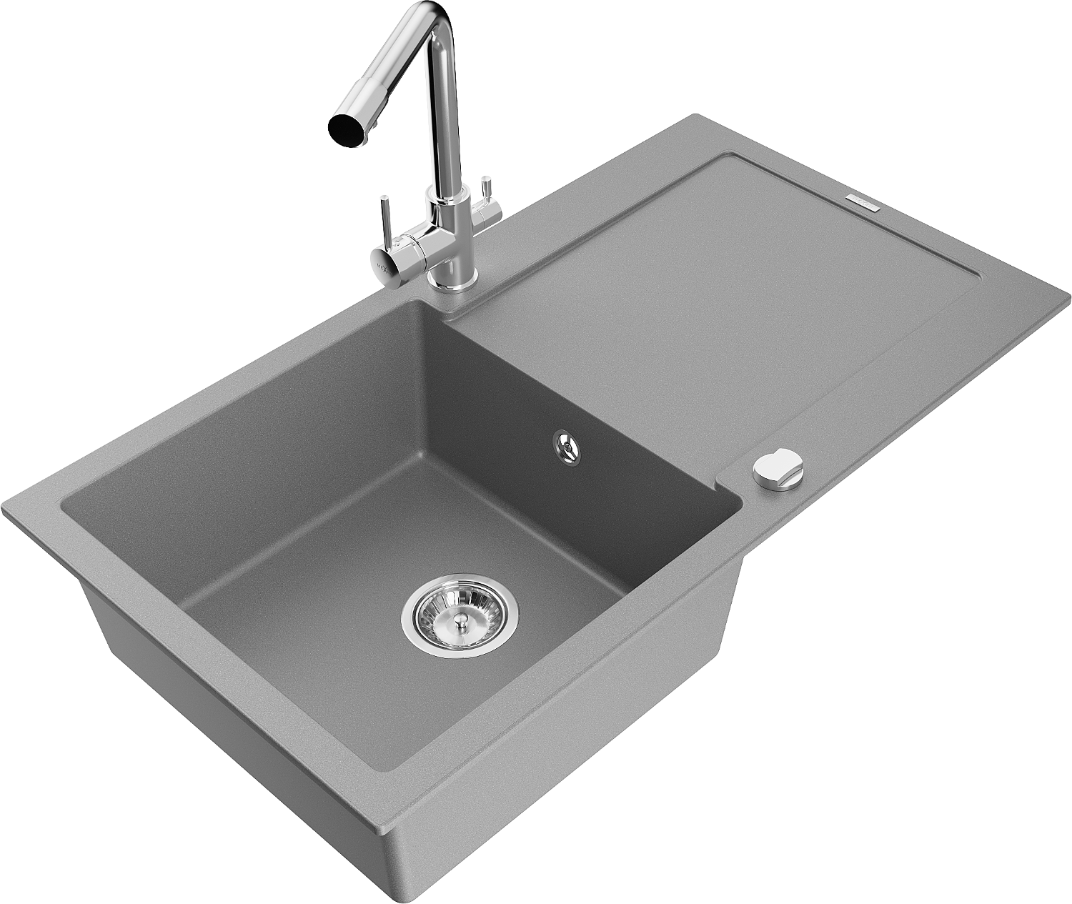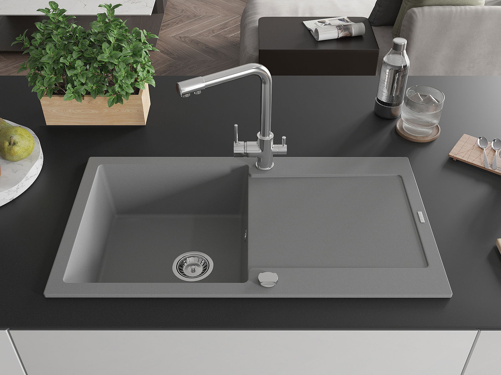 Mexen Leo granito plautuvė 1 skyrius su lašėjimo padėklu ir virtuviniu maišytuvu Duero, pilkas - 6501-71-671600-00