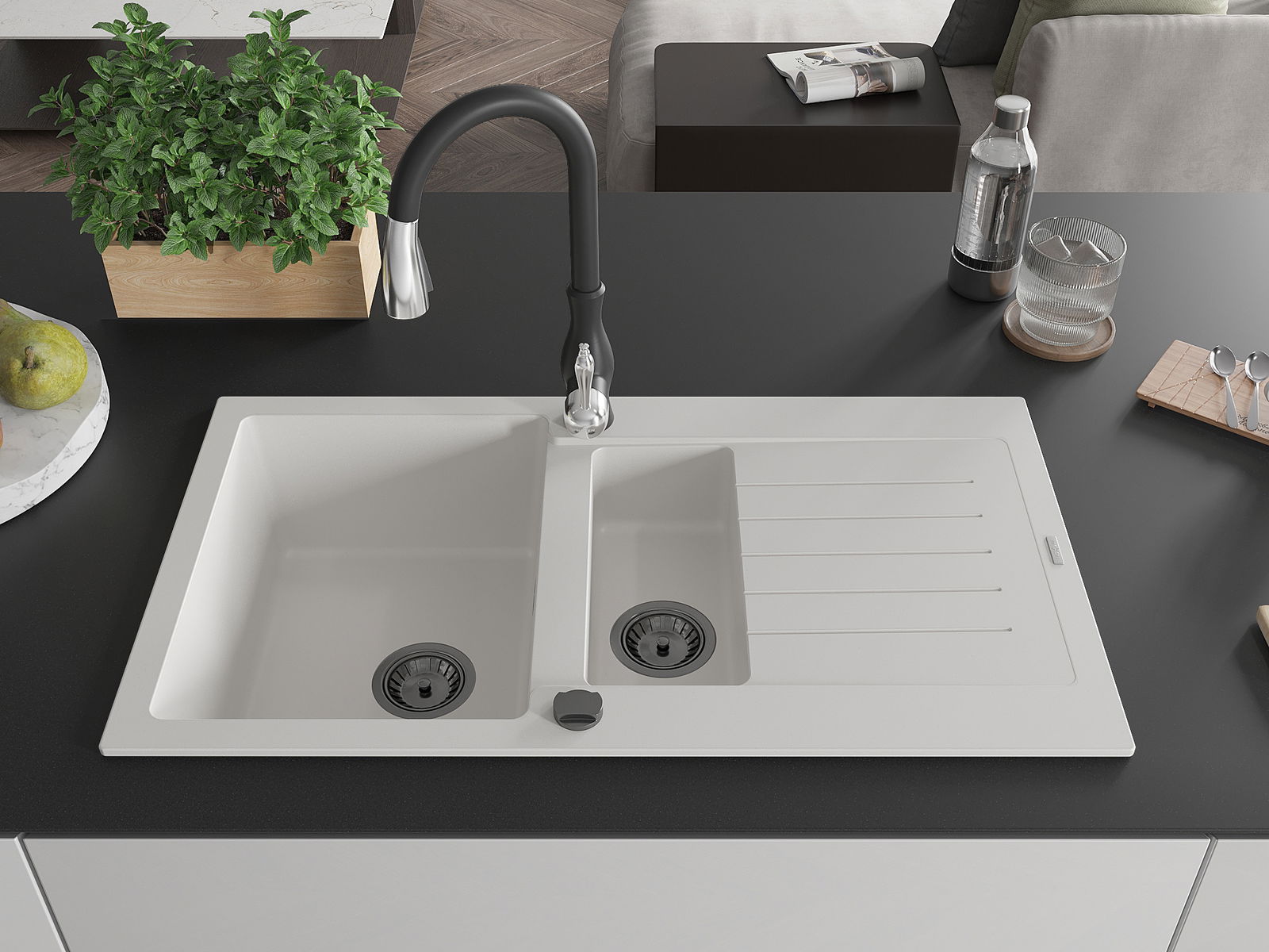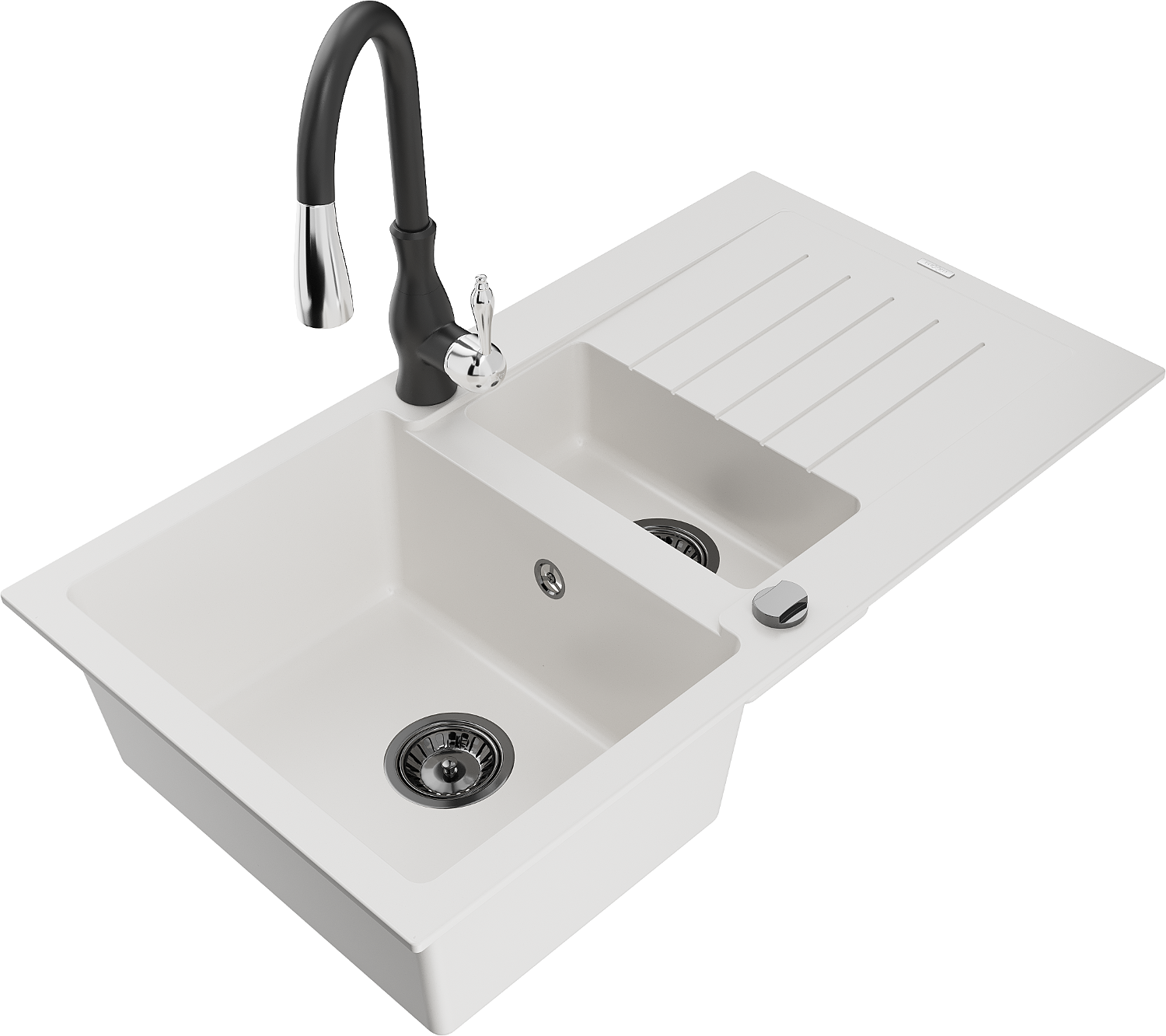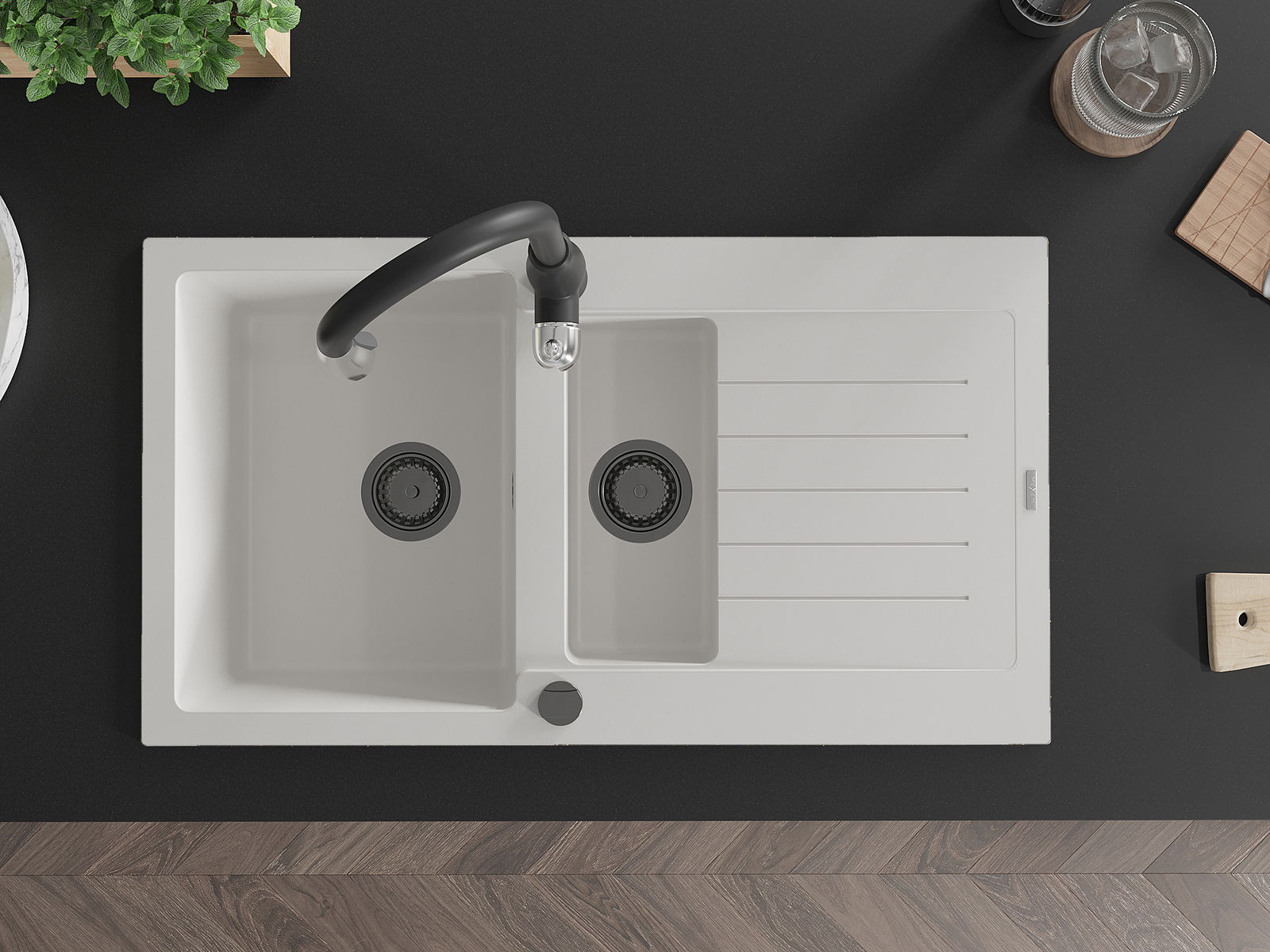 Mexen Matias granitinė plautuvė 1,5 kameros su nusausinimo vieta ir Savita virtuviniu maišytuvu, balta - 6502-20-672601-70