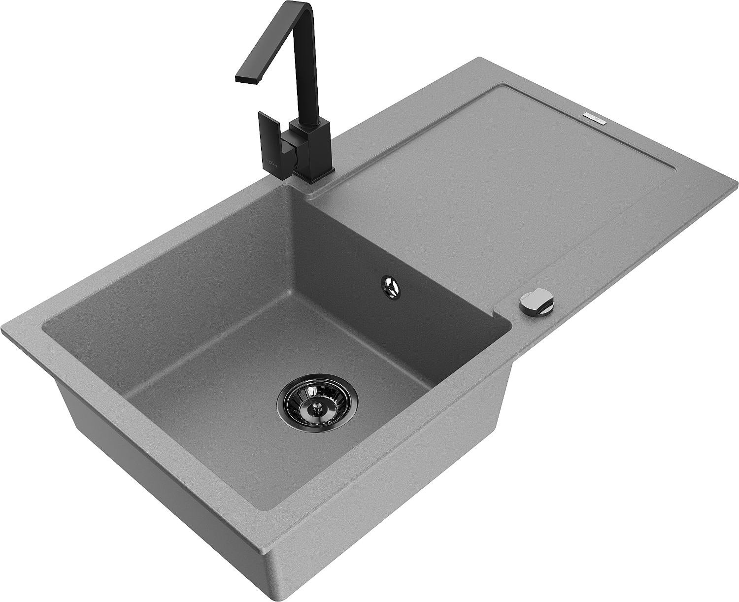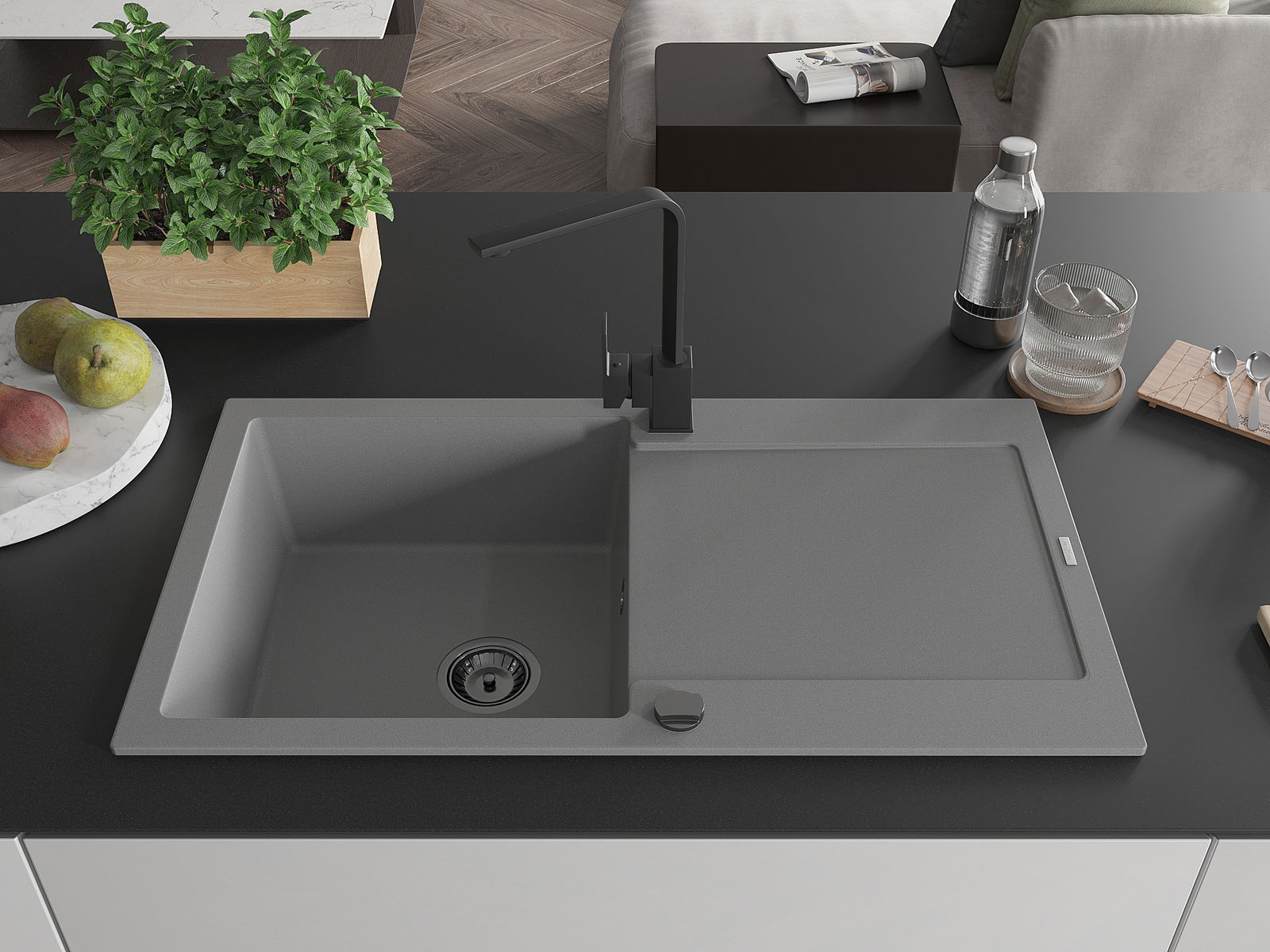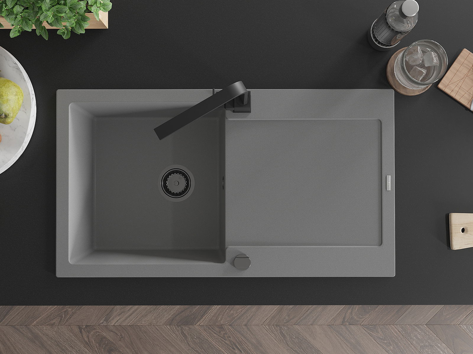 Mexen Leo granito plautuvė vienos kameros su nusausintuvu ir virtuvės maišytuvu Rita, pilka - 6501-71-670300-70-B