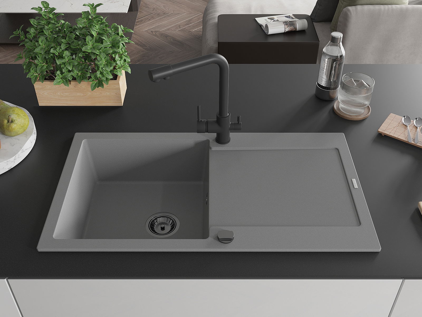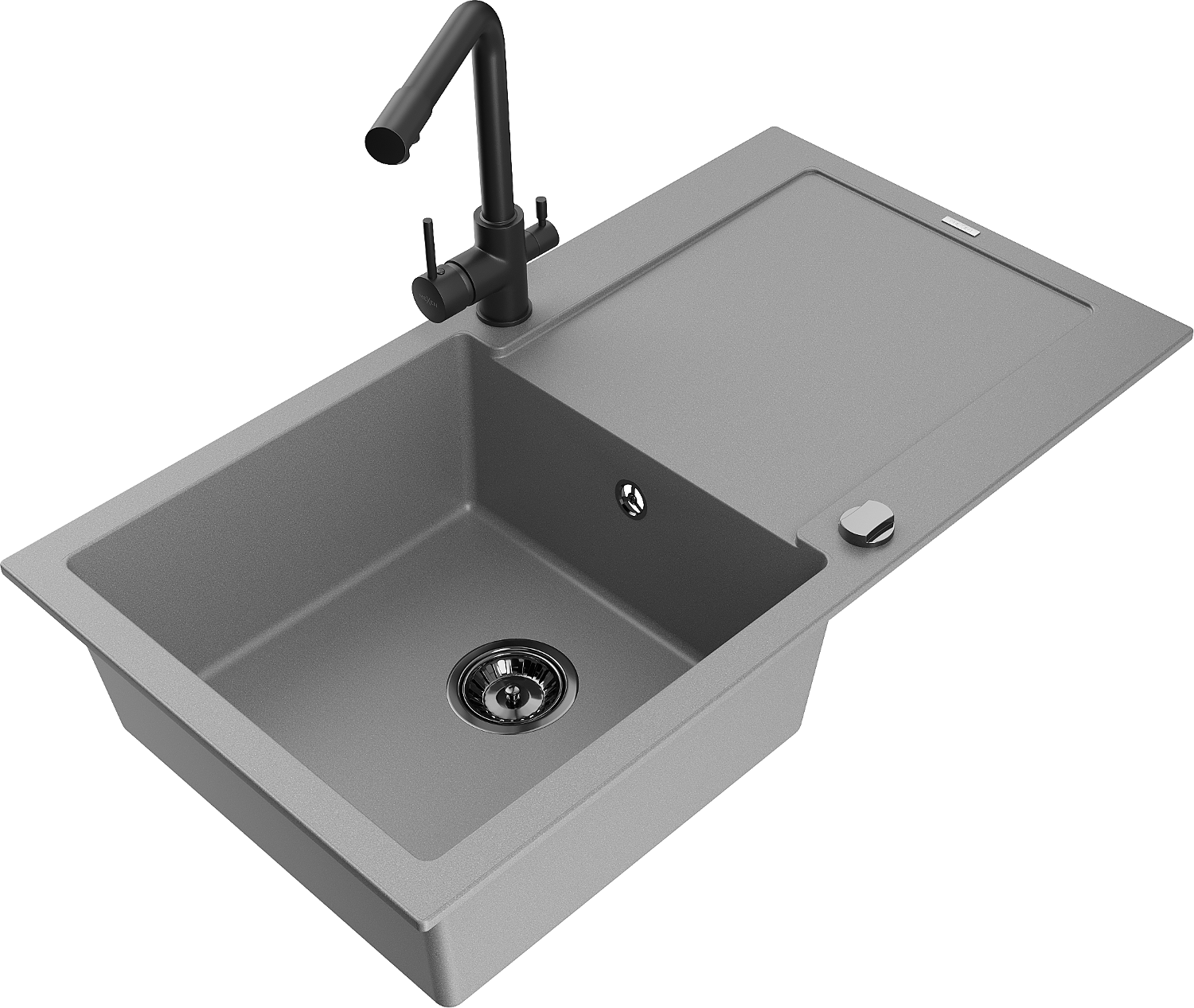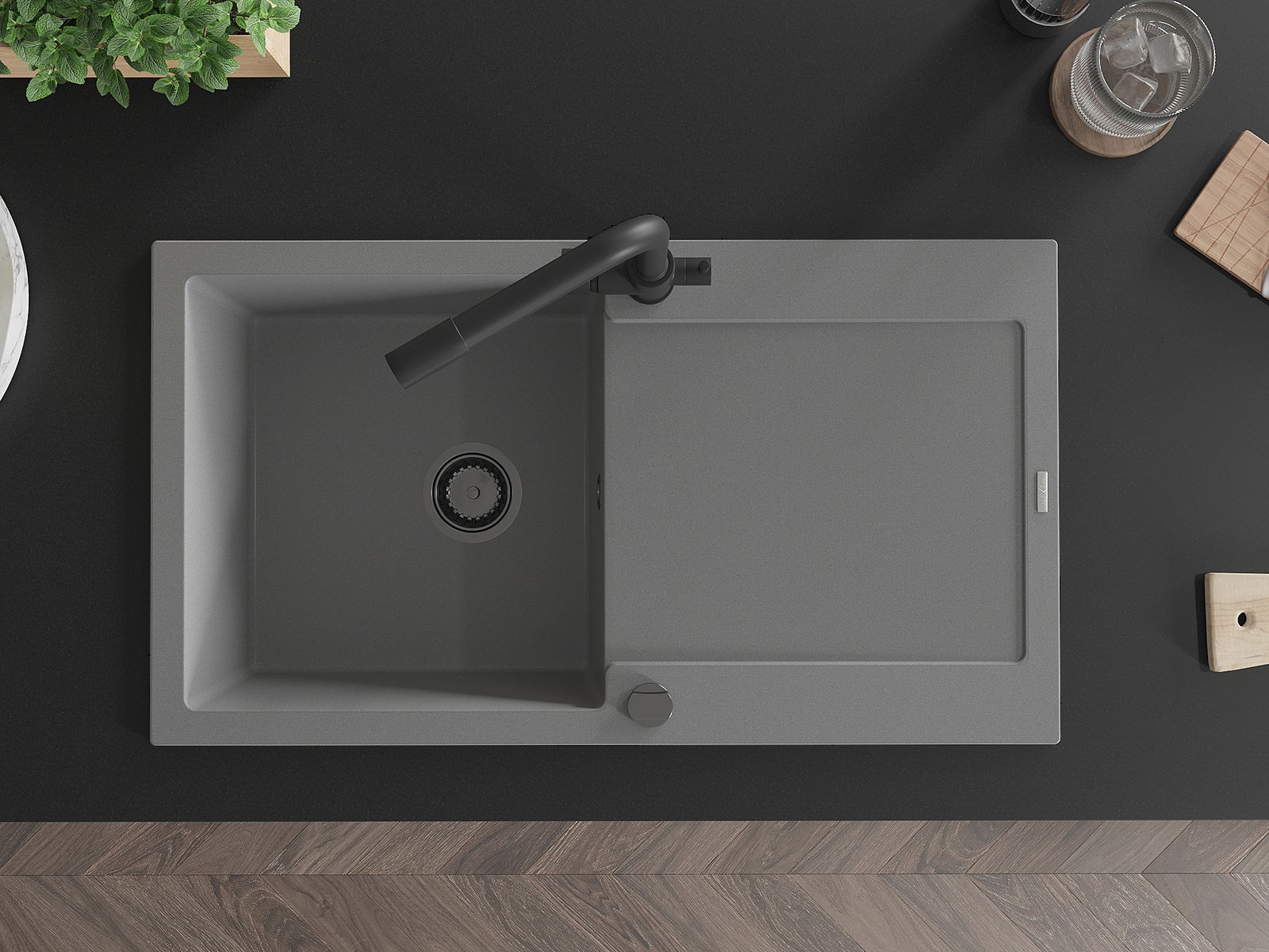 Mexen Leo granitinis vienos kameros plautuvė su nusausintuvu ir virtuviniu maišytuvu Duero, pilka - 6501-71-671600-70-B