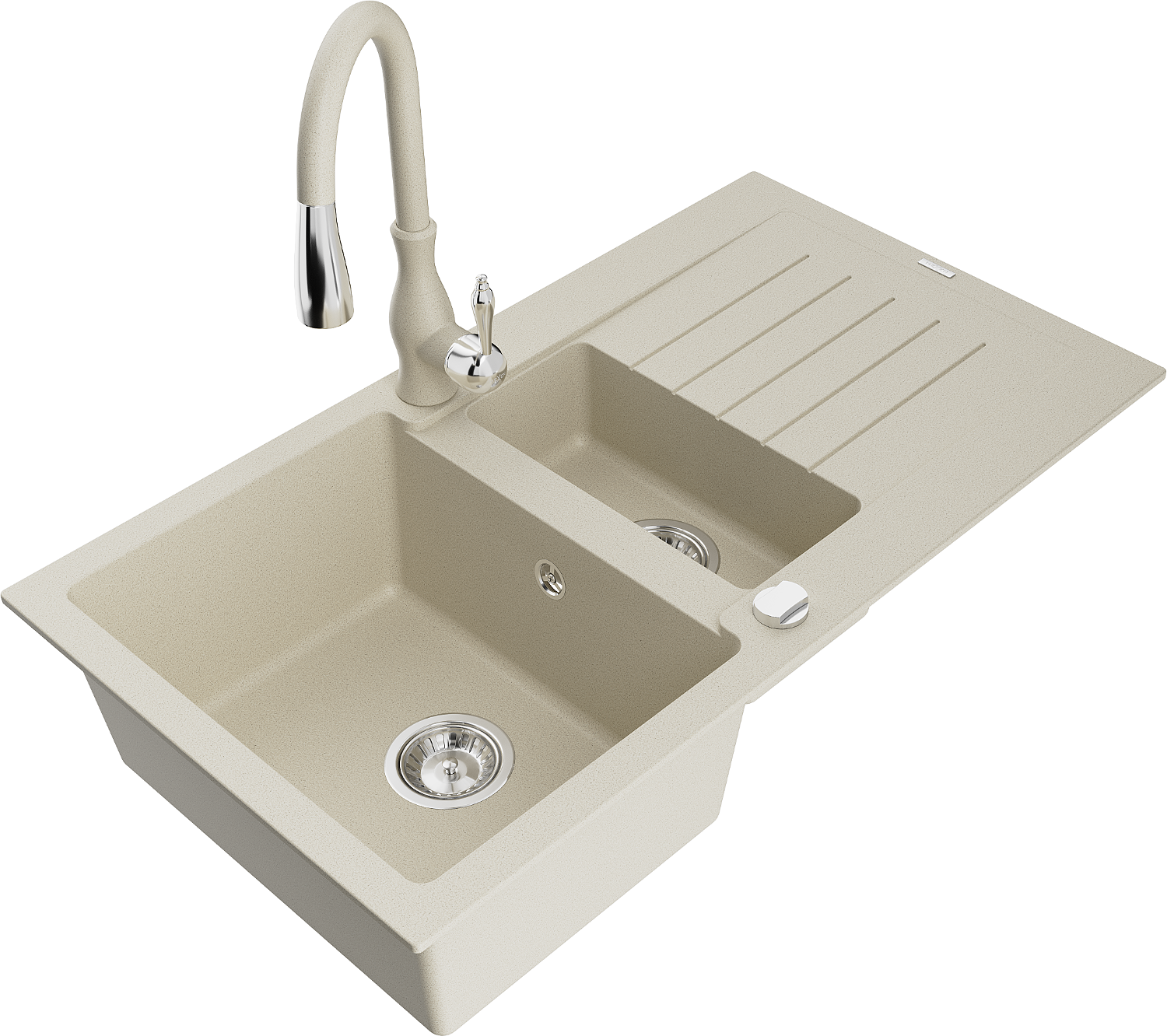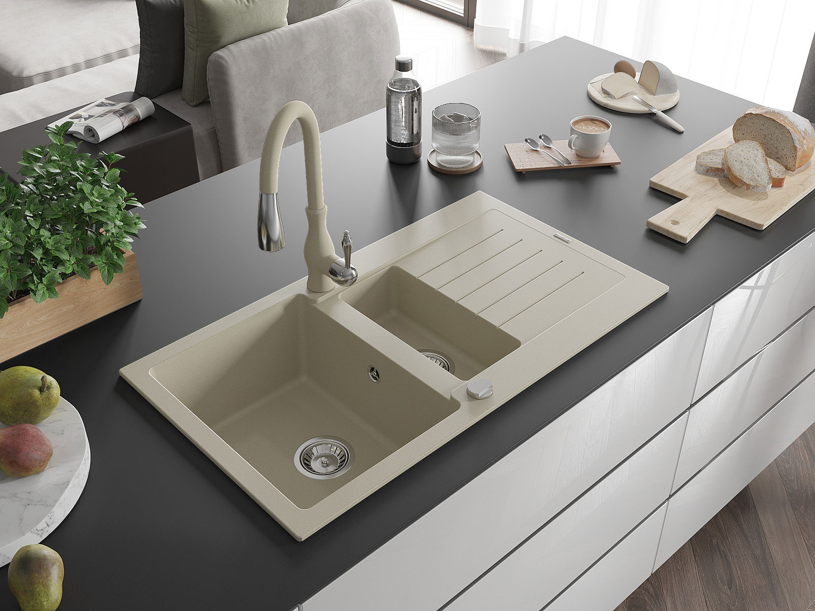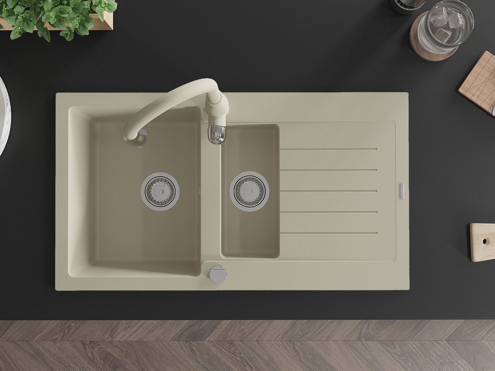 Mexen Matias granito kriauklė 1,5 kamerų su lataku ir virtuviniu maišytuvu Savita, smėlio spalvos - 6502-69-672601-69