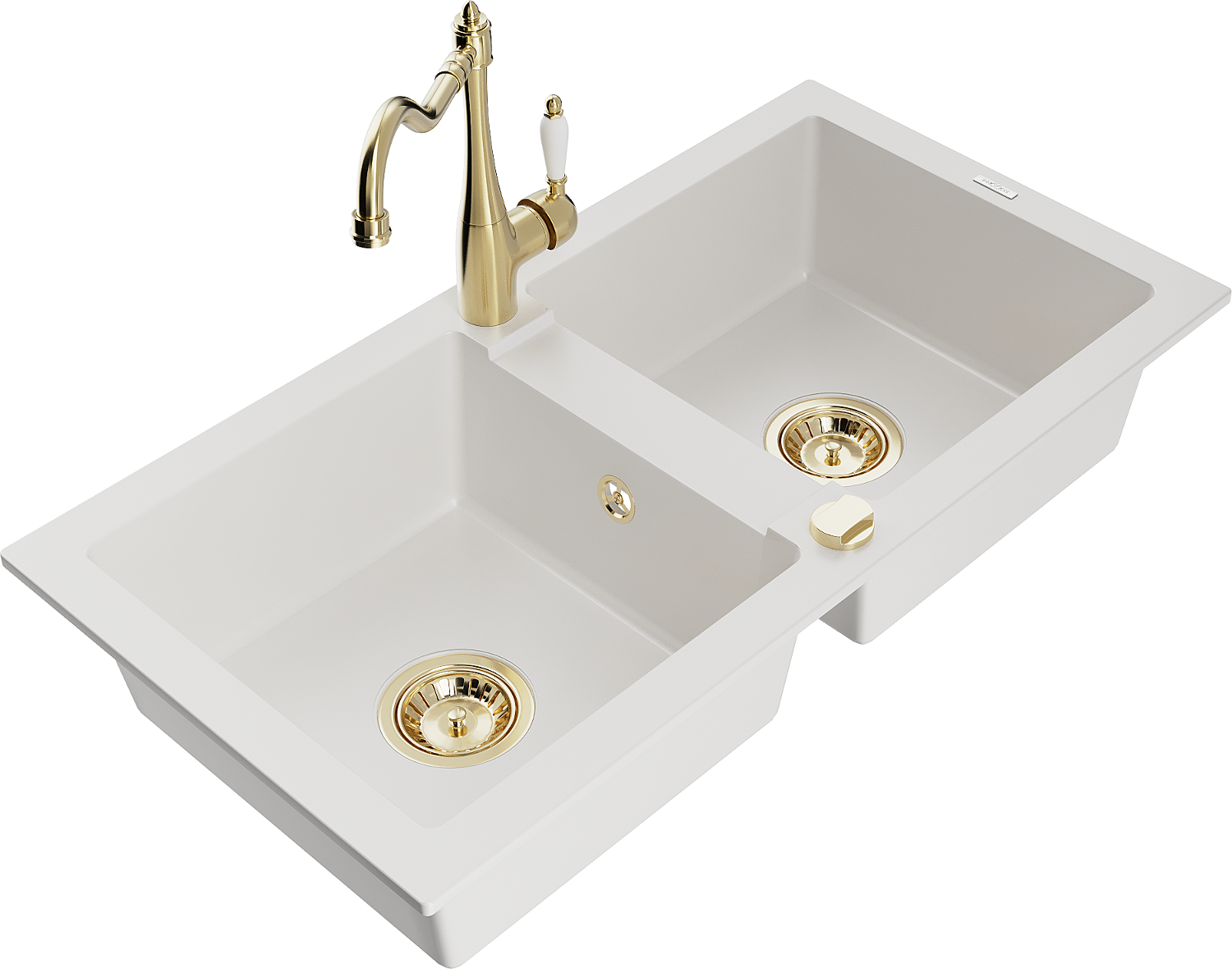Mexen Mario granitinė 2 skyrių plautuvė su virtuviniu maišytuvu Carla, balta - 6504-20-670700-50