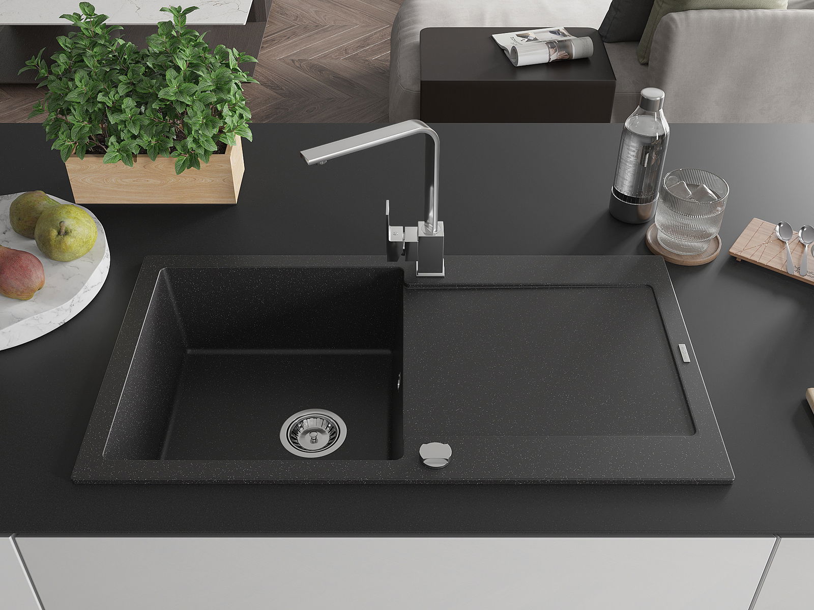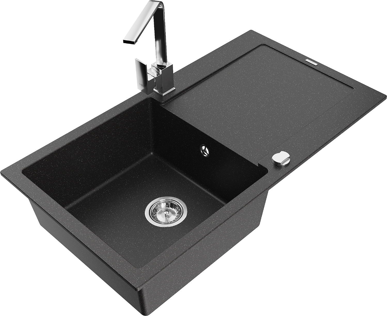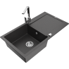Mexen Leo granitinė vienos plautuvės kriauklė su nusausintuvu ir virtuviniu maišytuvu Rita, juodos/sidabrinės metalizacijos