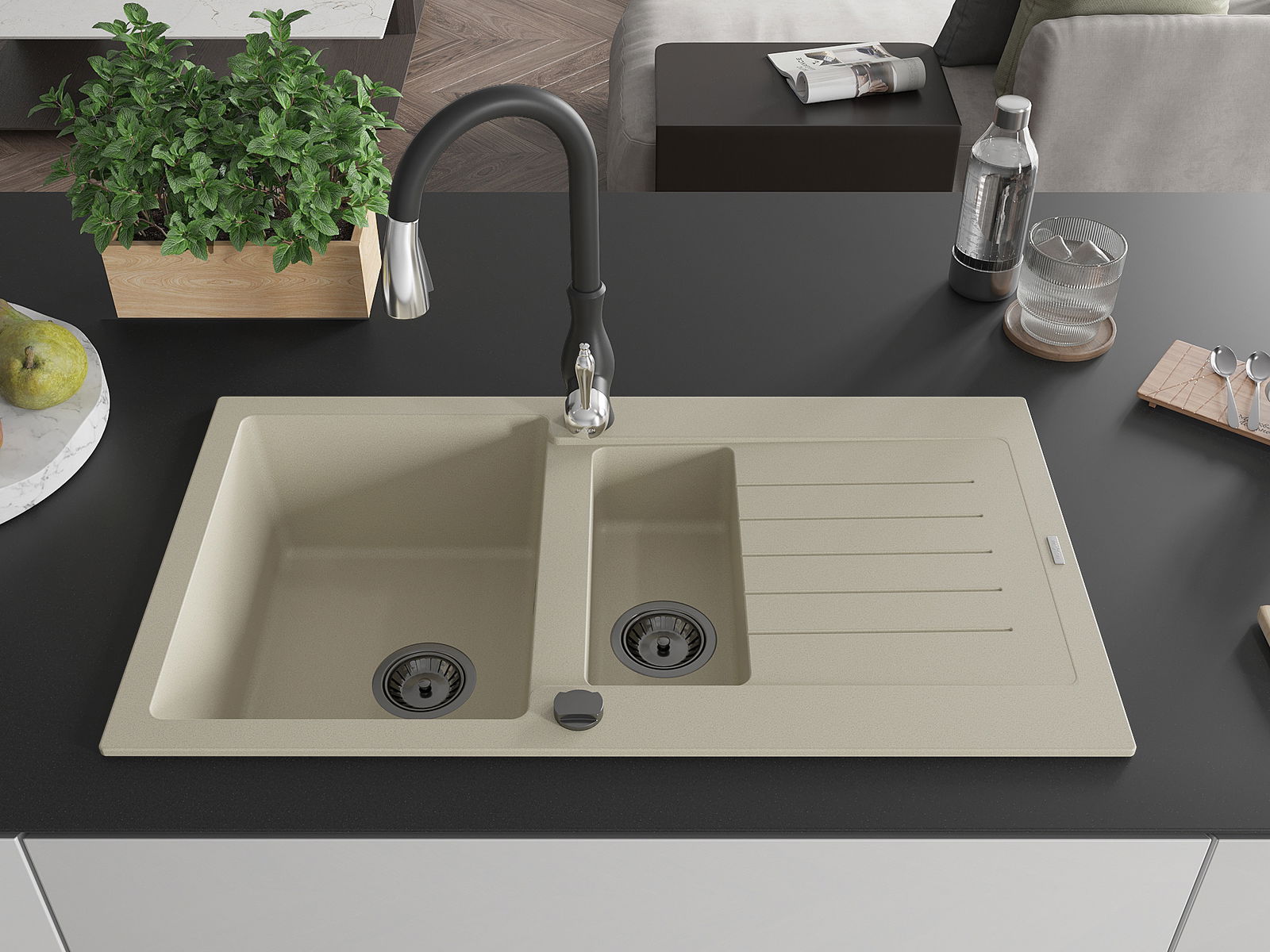 Mexen Matias granito kriauklė 1,5 skylių su drenažu ir virtuviniu maišytuvu Savita, smėlio spalvos - 6502-69-672601-70