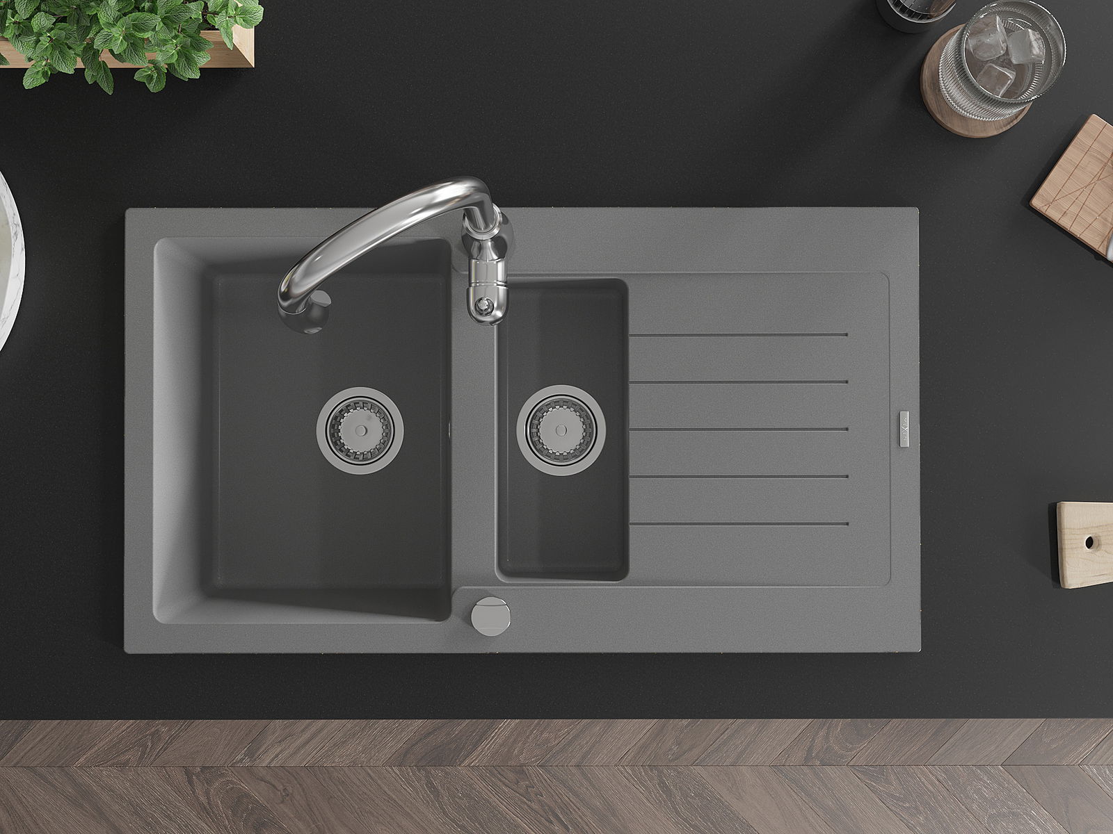Mexen Matias granitinis plautuvė 1,5 kamerų su lašintuvu ir virtuviniu maišytuvu Savita, pilkas - 6502-71-672601-00