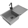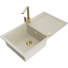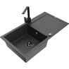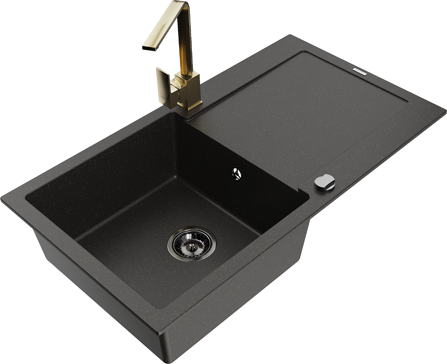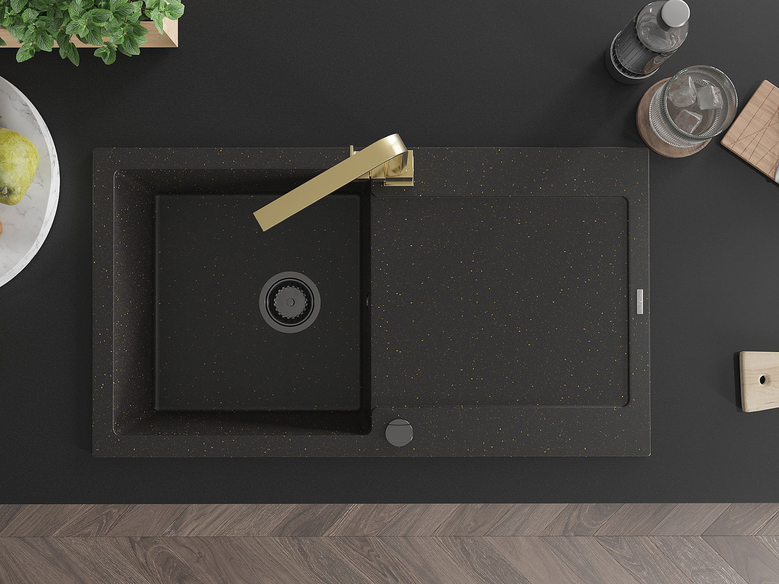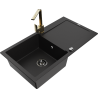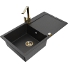 Mexen Leo granitinis vienos kameros plautuvė su drenažu ir virtuviniu maišytuvu Rita, juoda/auksinė metalo spalva