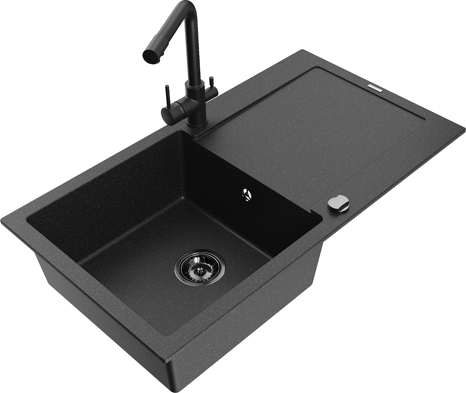 Mexen Leo granitinė plautuvė su viena kampe ir nutekėjimo lentyna bei virtuviniu maišytuvu Duero, juoda/sidabrinis metalikas
