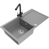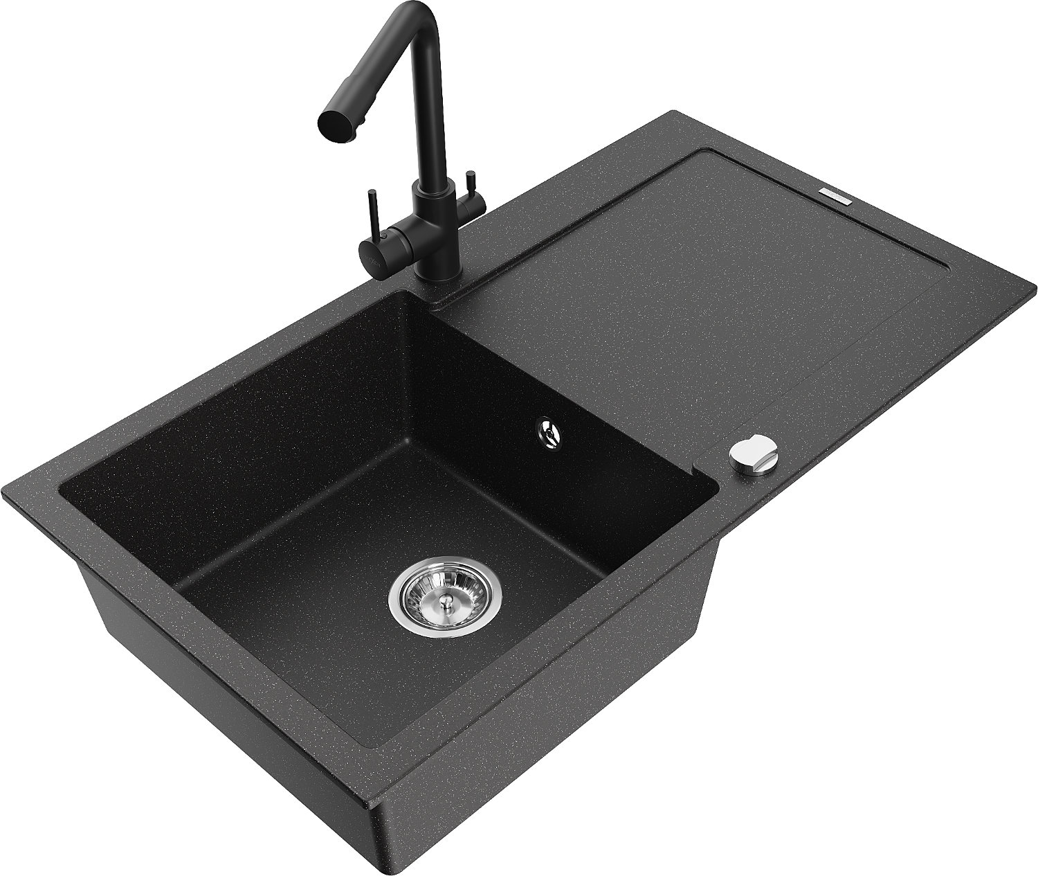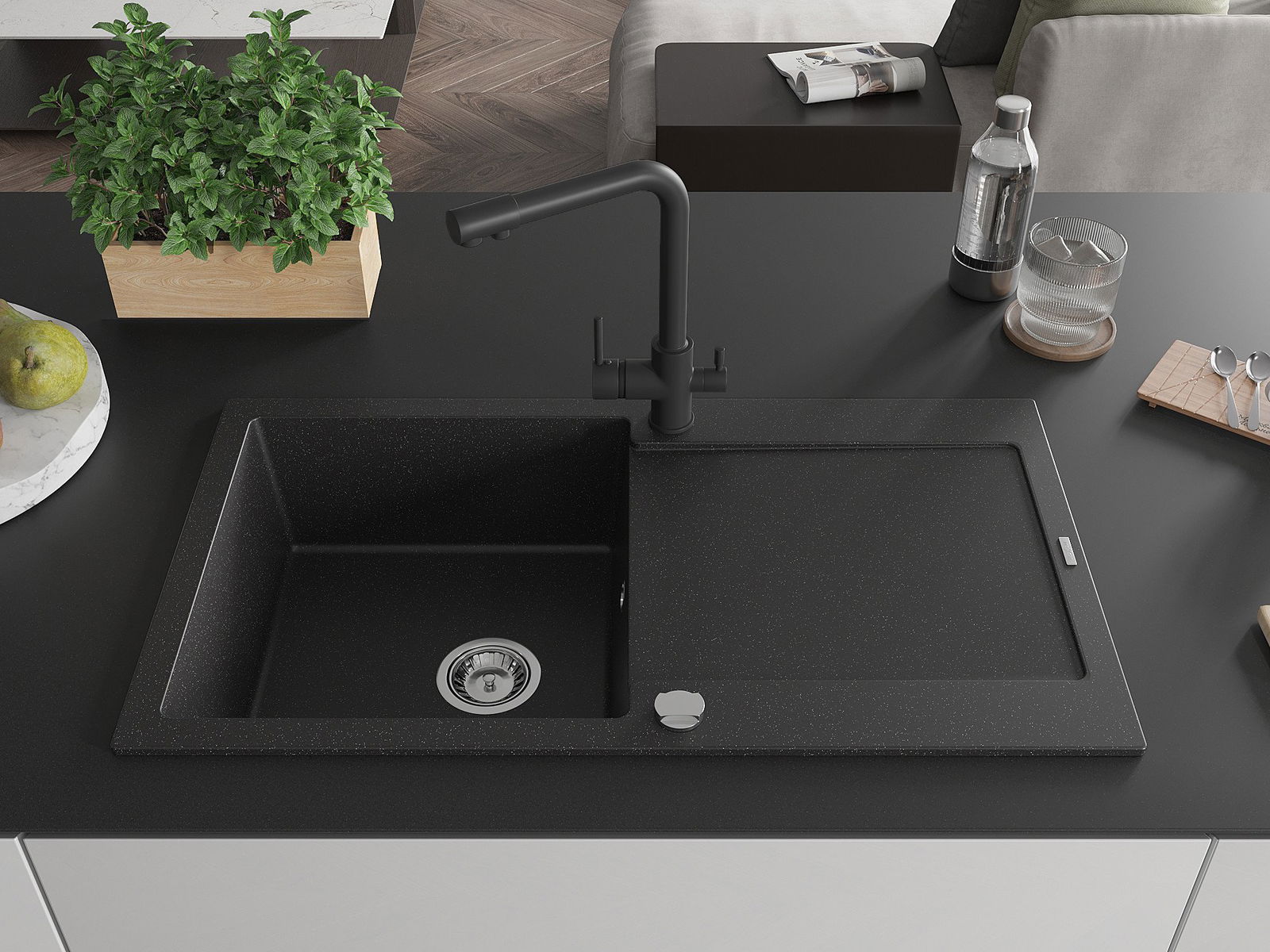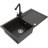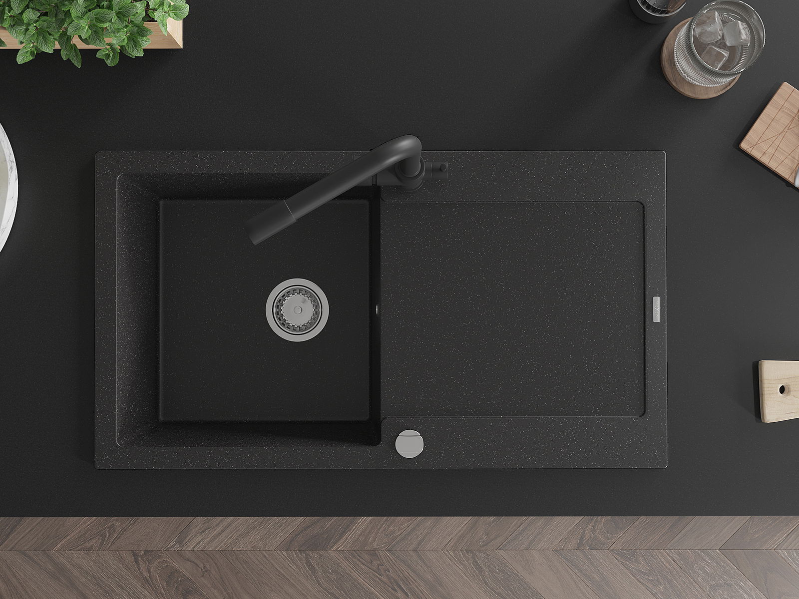 Mexen Leo granitinė vienos plautuvės kriauklė su nusausintuvu ir virtuviniu maišytuvu Duero, juoda/sidabrinis metalikas