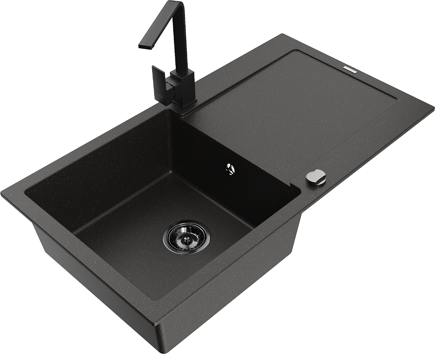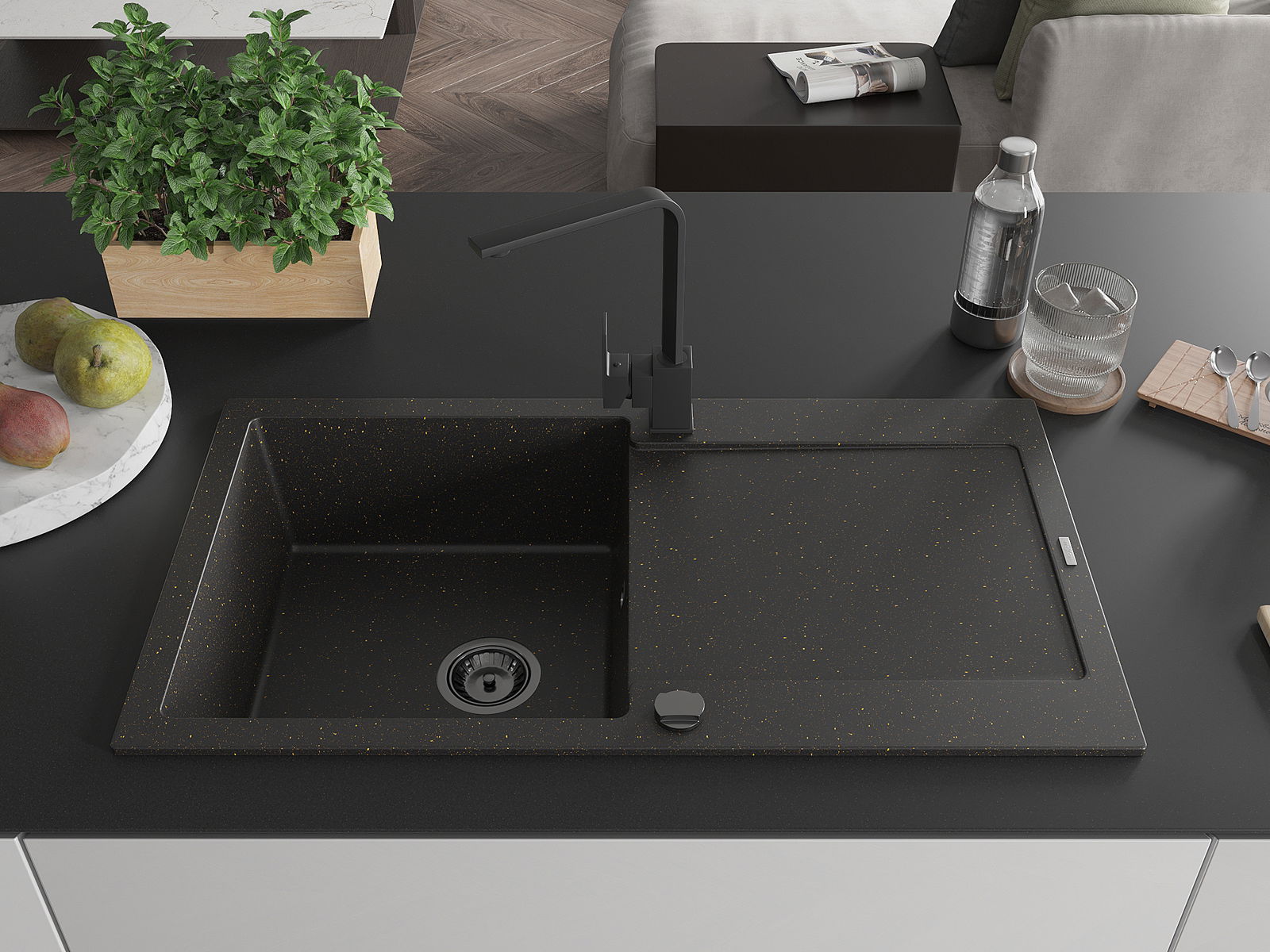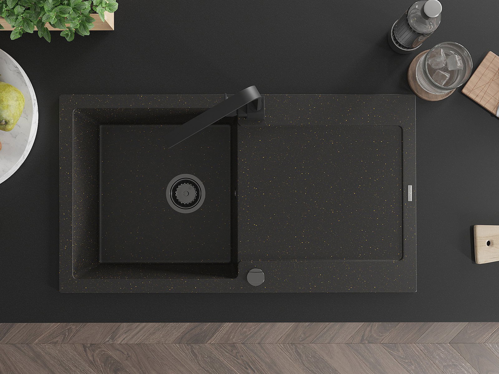 Mexen Leo granitinė vienos kameros plautuvė su nusausintuvu ir virtuviniu maišytuvu Rita, juoda/auksinė metalo spalva