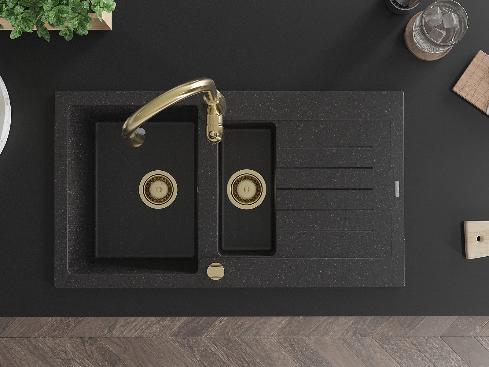 Mexen Matias 1,5 skylių granitinė kriauklė su drenažu ir virtuviniu maišytuvu Savita, juoda/sidabrinė - 6502-73-672601-50