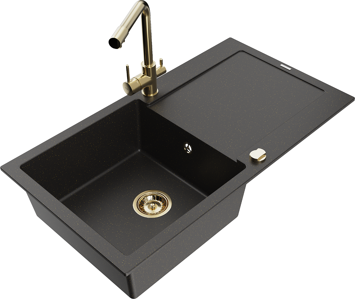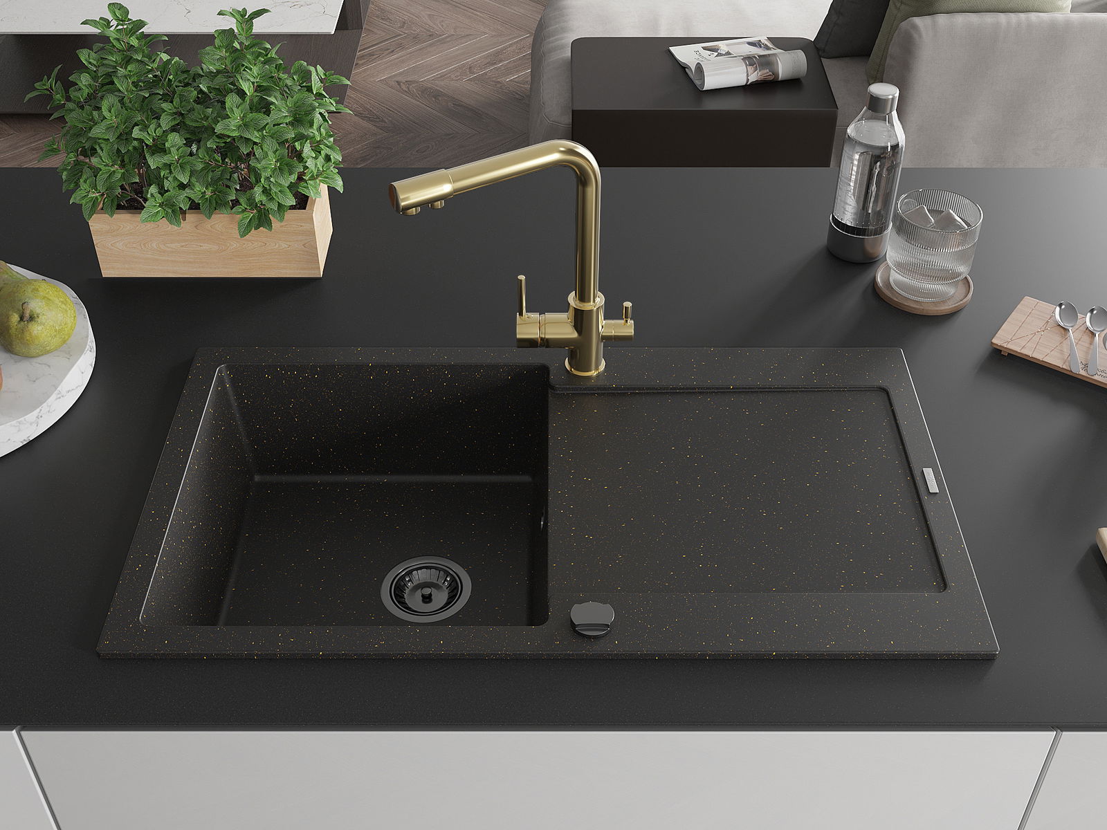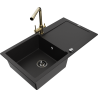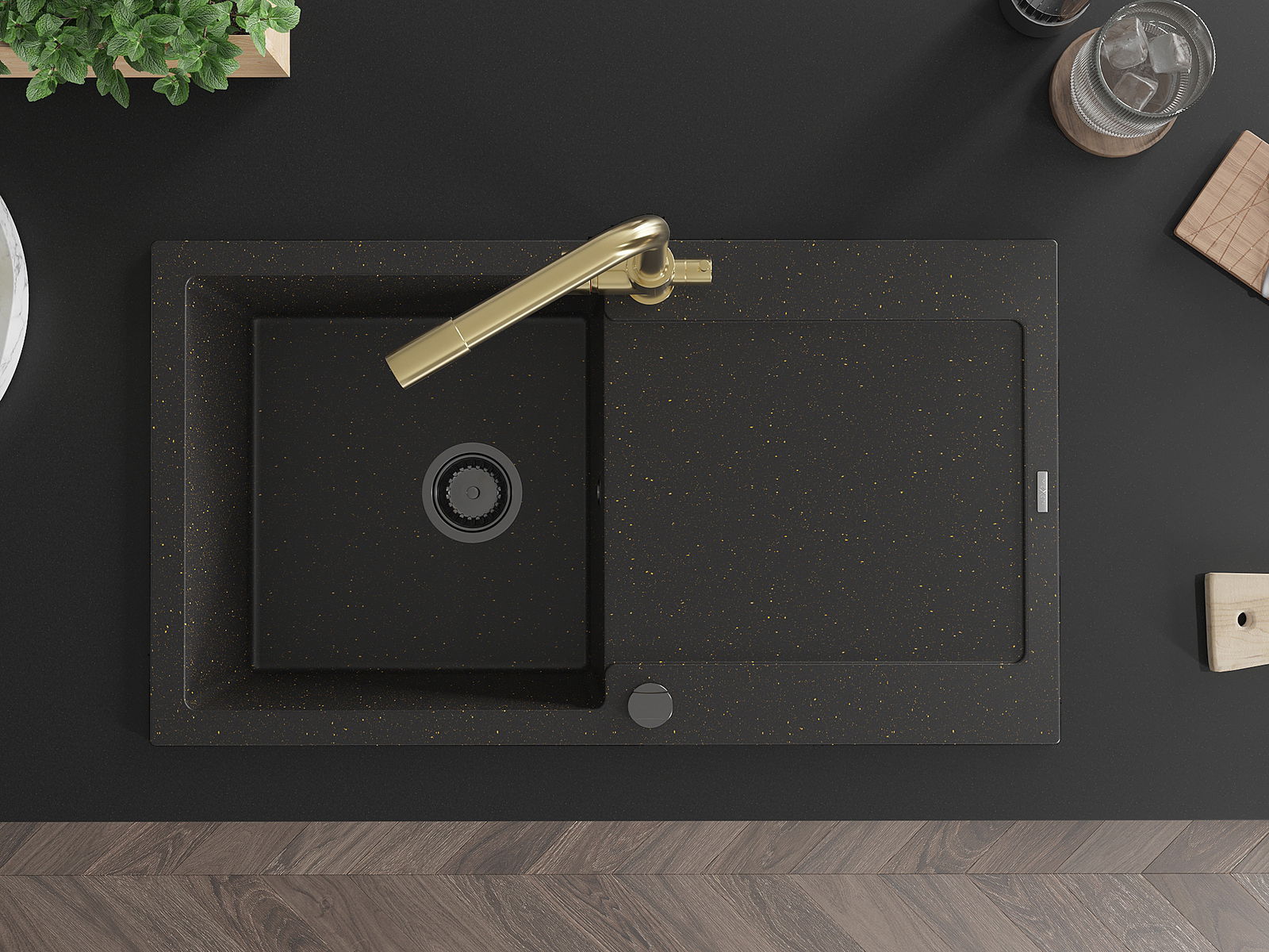 Mexen Leo granitinė vienos kameros kriauklė su nusausintuvu ir virtuviniu maišytuvu Duero, juoda/auksinė metalika