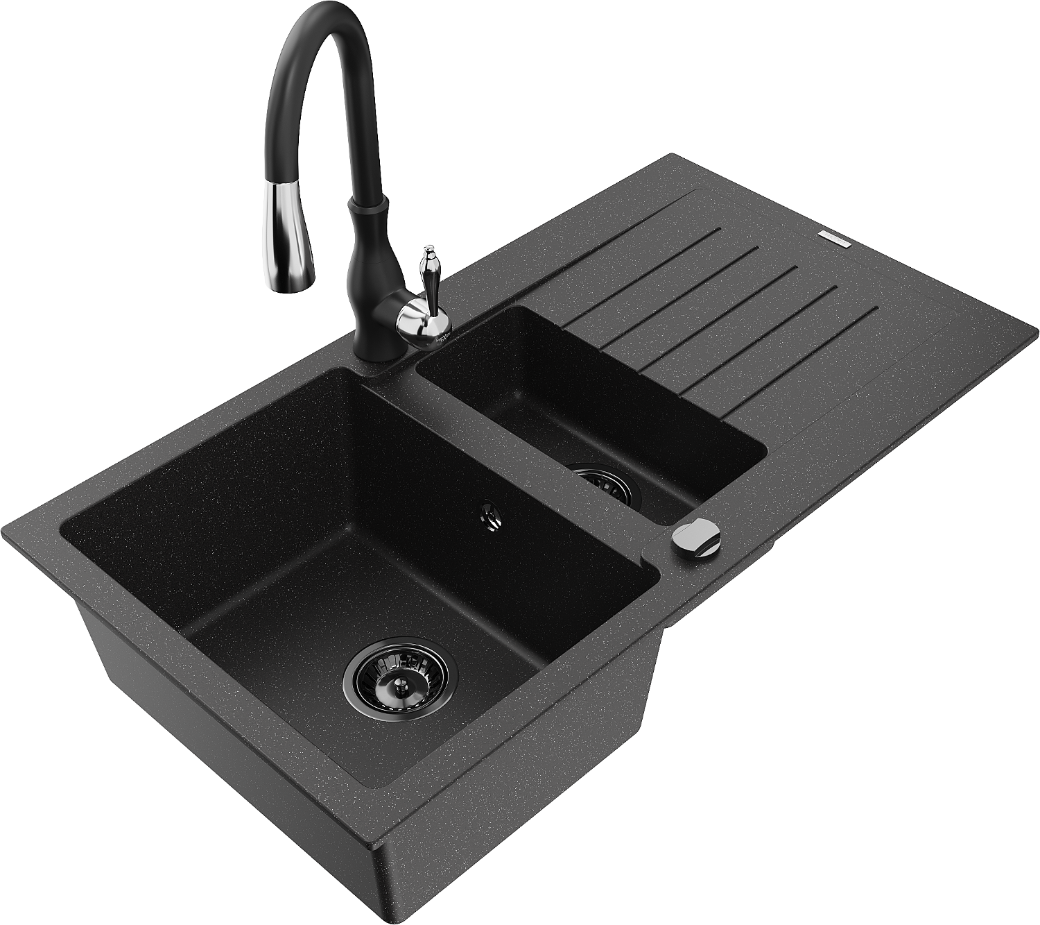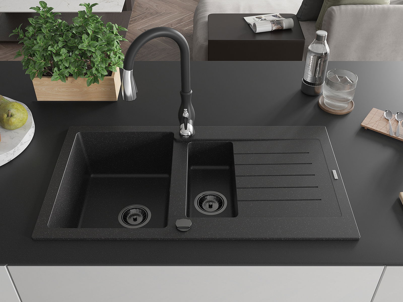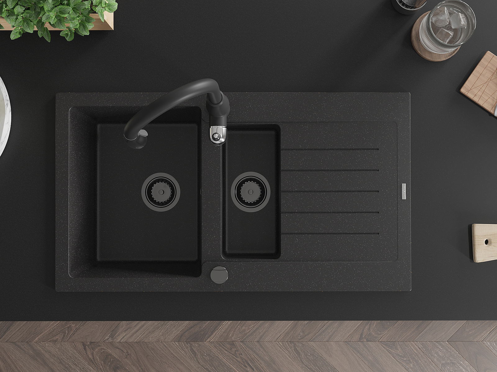 Mexen Matias granitinė 1,5 skyrių kriauklė su nutekėjimu ir virtuvės maišytuvu Savita, juoda/sidabrinė