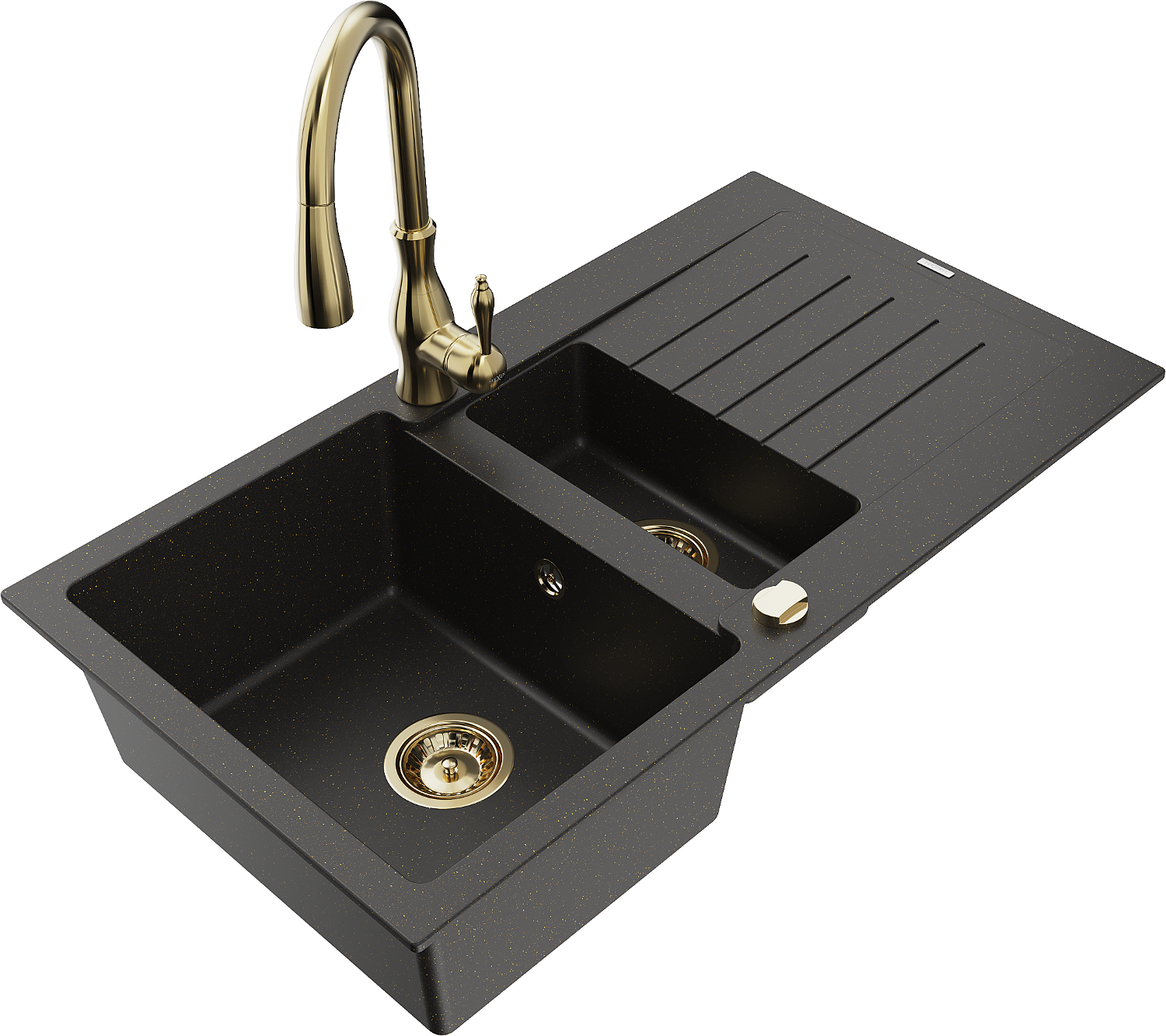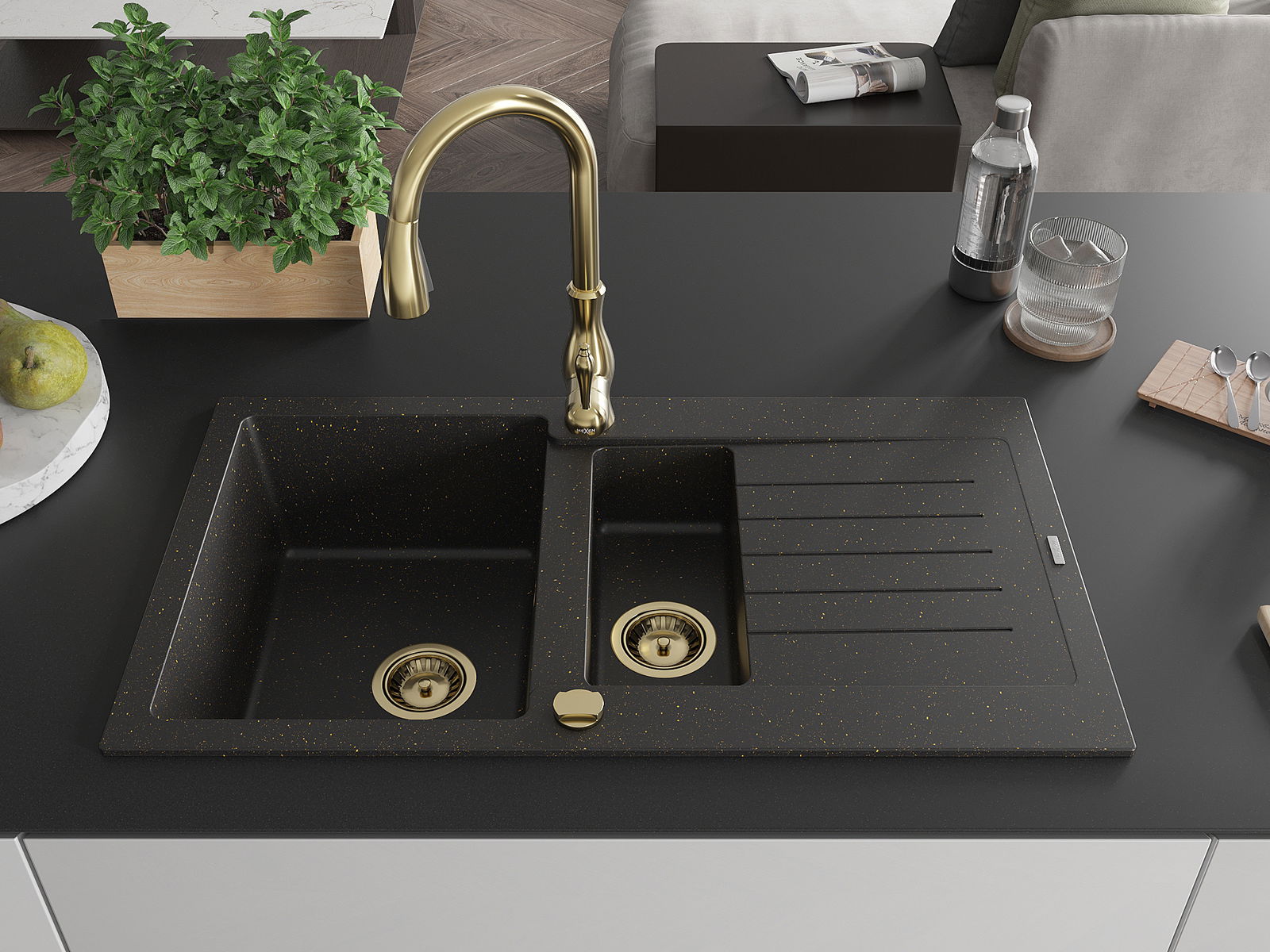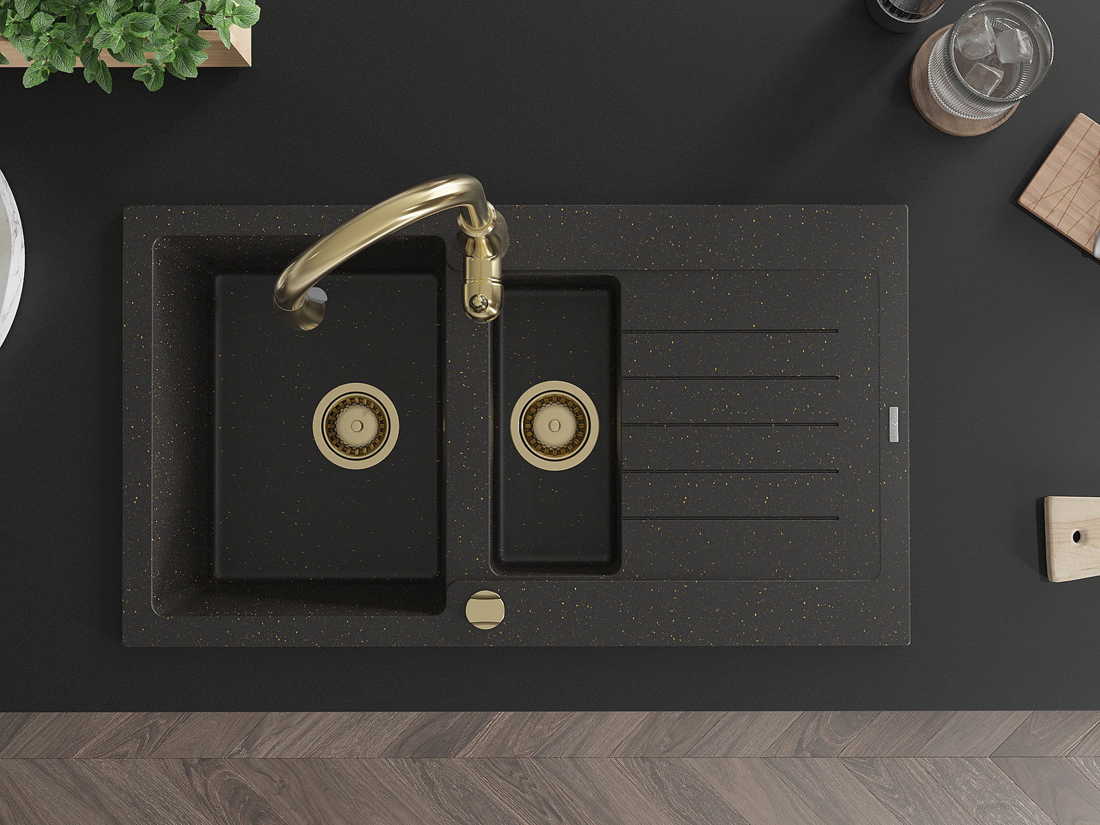 Mexen Matias granitinis 1,5 kamerų kriauklė su kiaurymu ir virtuviniu maišytuvu Savita, juodas/auksinis - 6502-75-672601-50