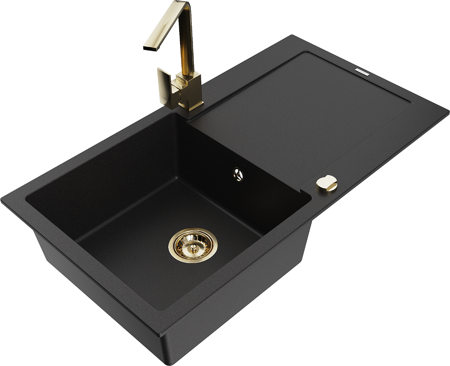 Mexen Leo granito standartinė kriauklė su nutekėjimo lentyna ir virtuviniu maišytuvu Rita, juoda - 6501-77-670300-50