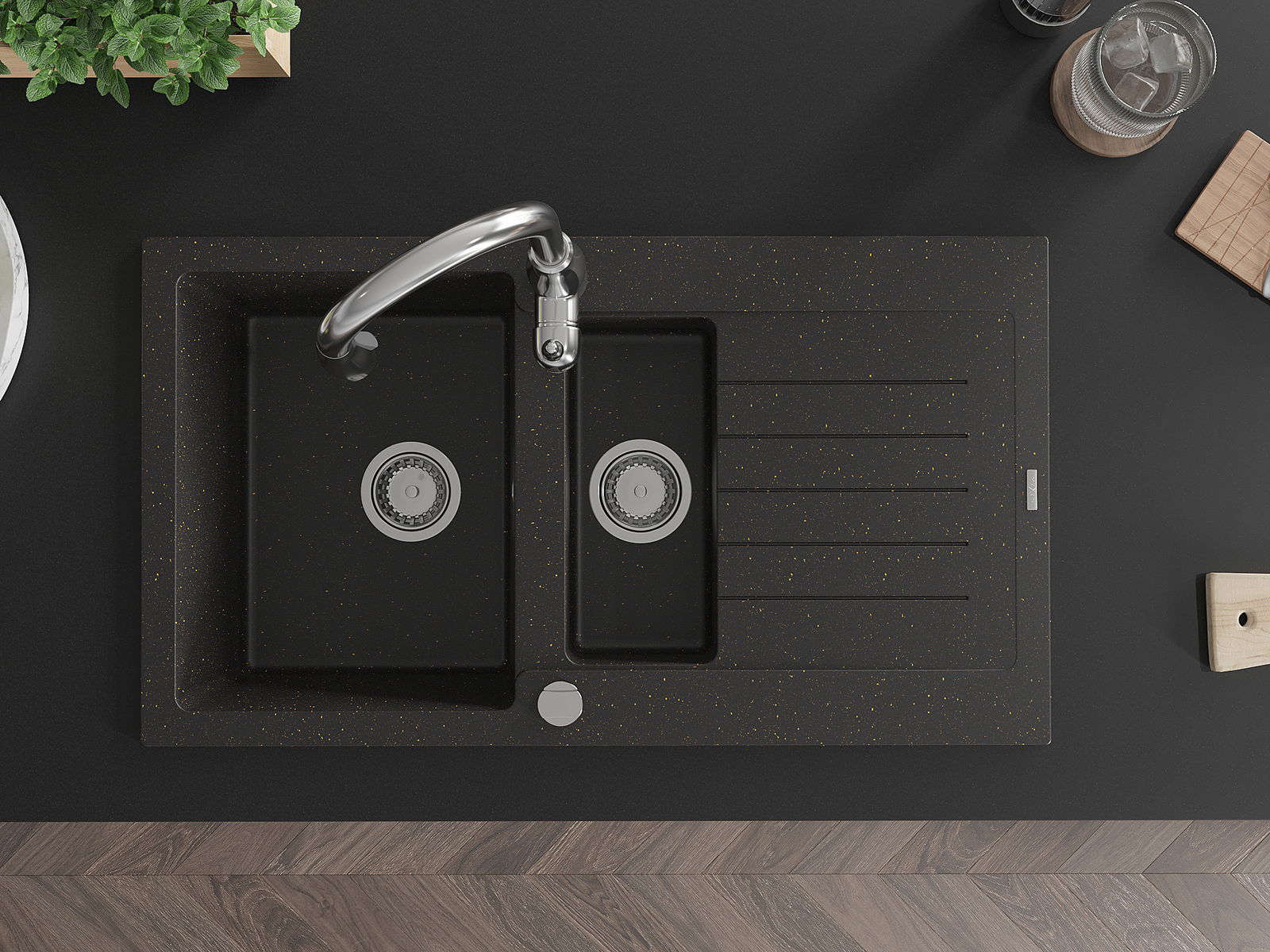 Mexen Matias 1,5 kamerų granito plautuvė su nuvarvėjimo lentyna ir virtuviniu maišytuvu Savita, juoda/auksinė
