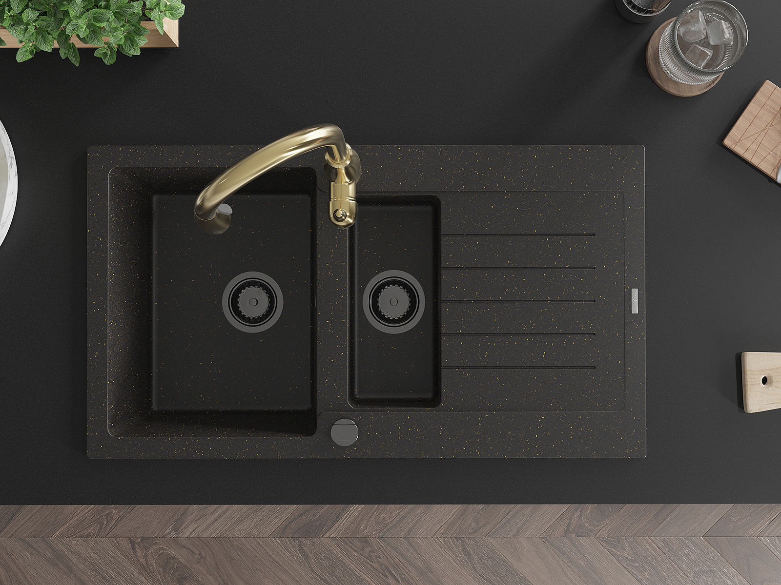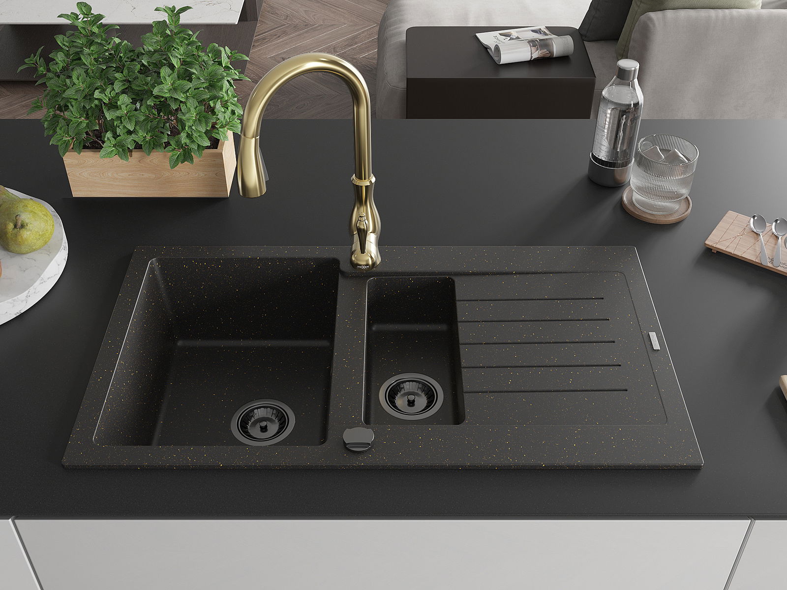 Mexen Matias granito plautuvė 1,5 kamerų su nutekėjimu ir virtuviniu čiaupu Savita, juoda/auksinė - 6502-75-672601-50-B