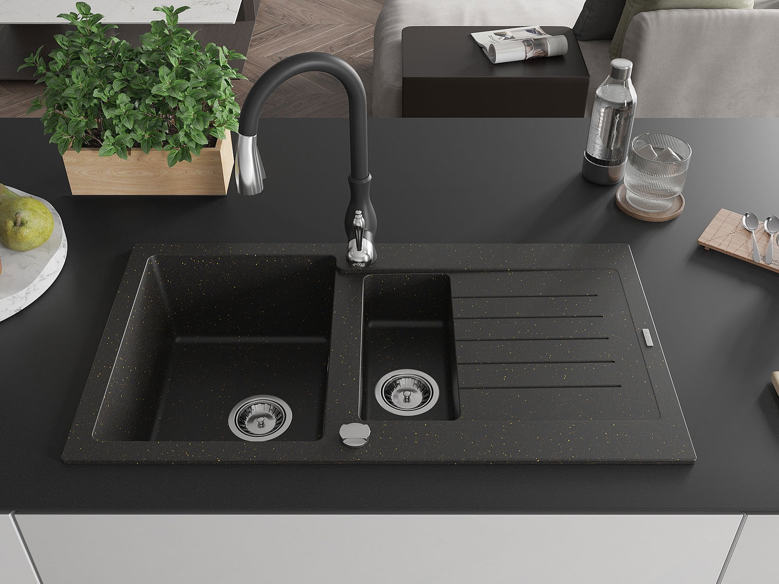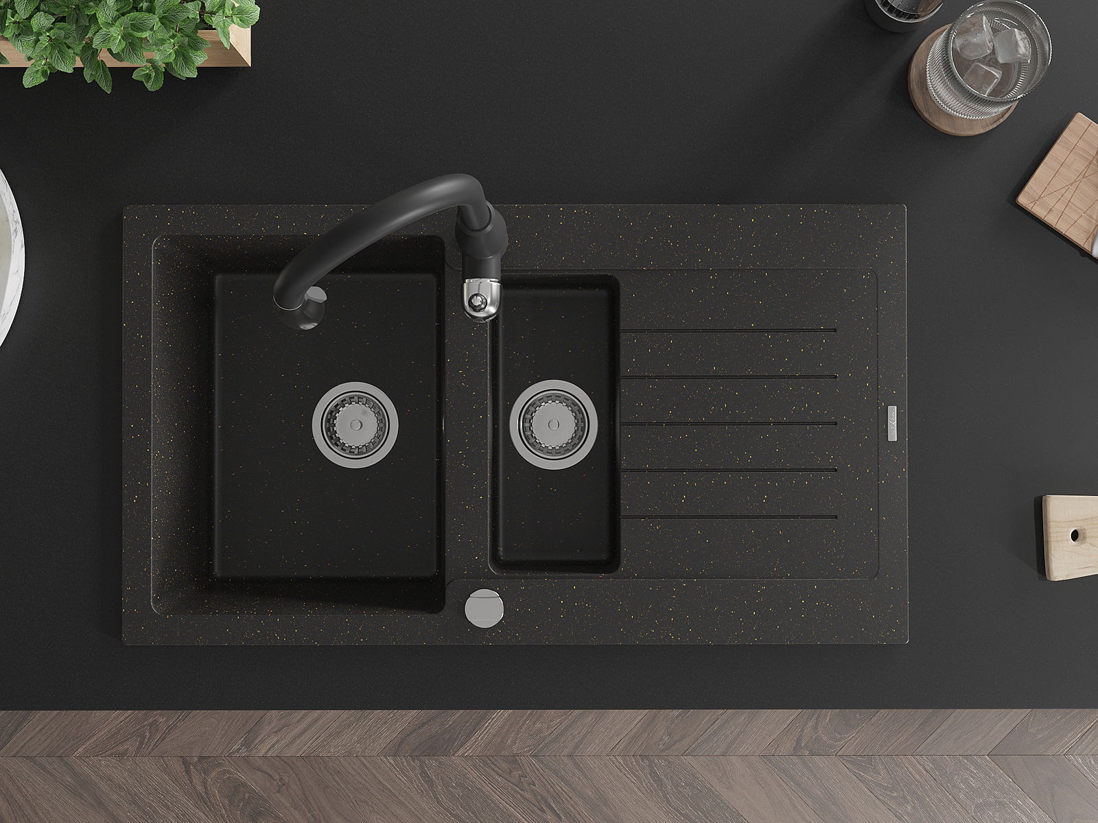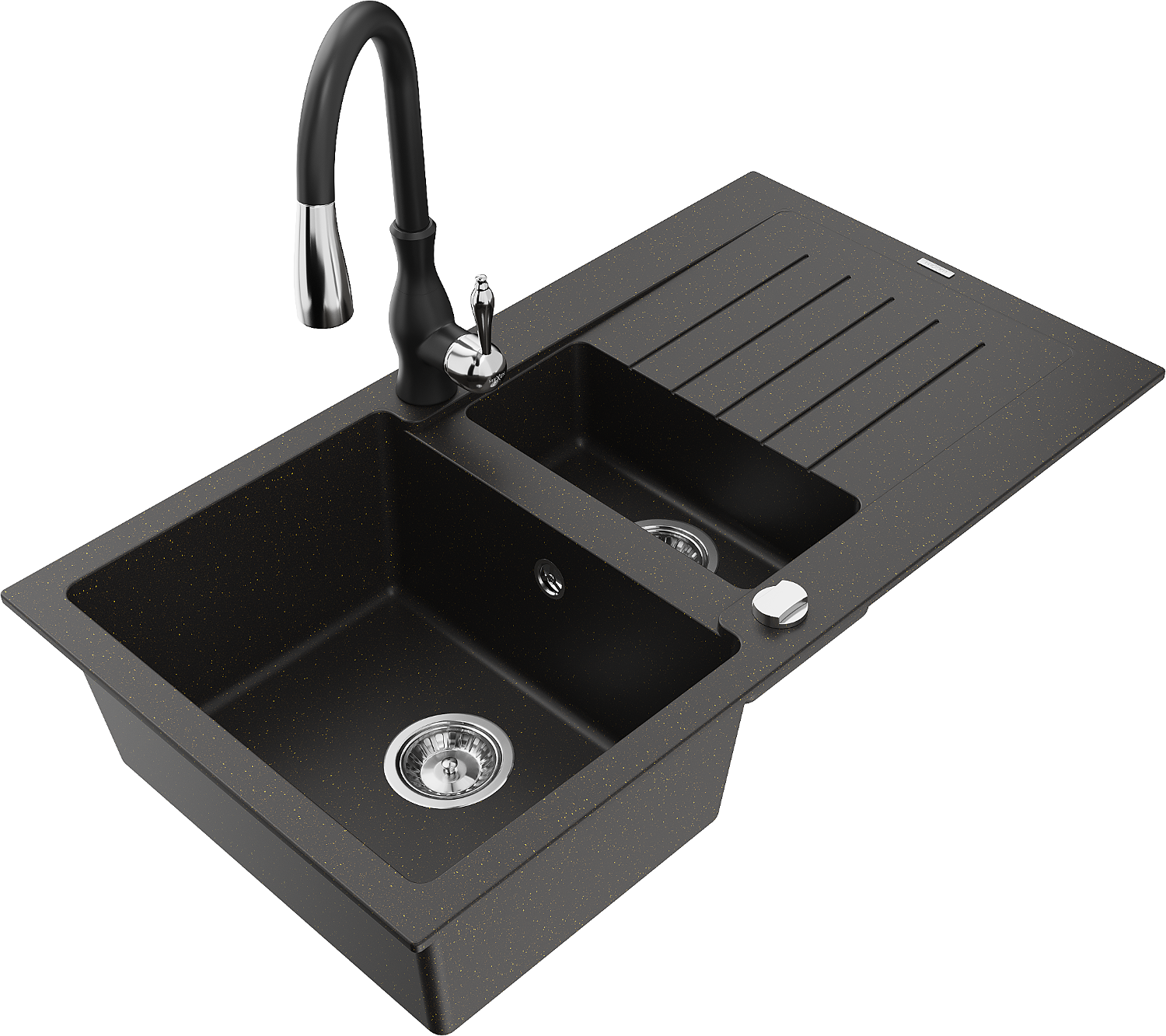 Mexen Matias granitinė 1,5 skylių plautuvė su nutekėjimu ir virtuviniu maišytuvu Savita, juoda/auksinė - 6502-75-672601-70