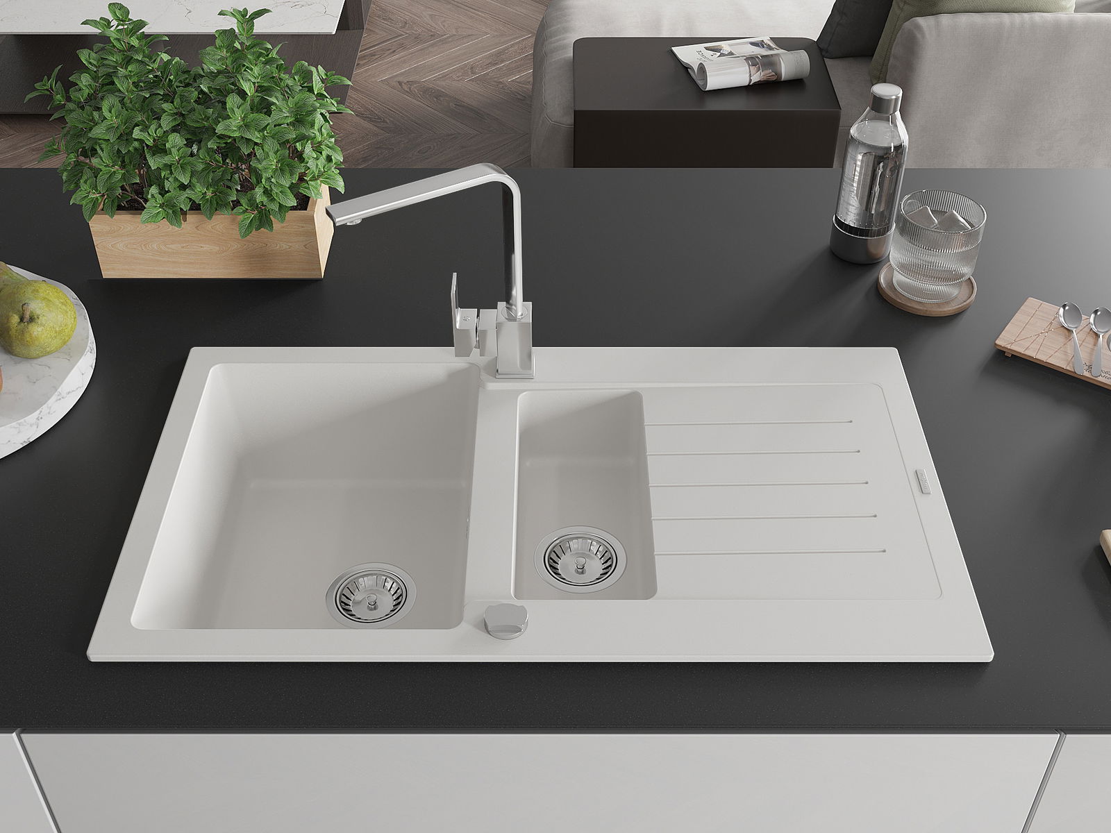 Mexen Matias granito kriauklė 1,5 kambario su nuvarvėjimu ir virtuvės čiaupu Rita, balta - 6502-20-670300-00