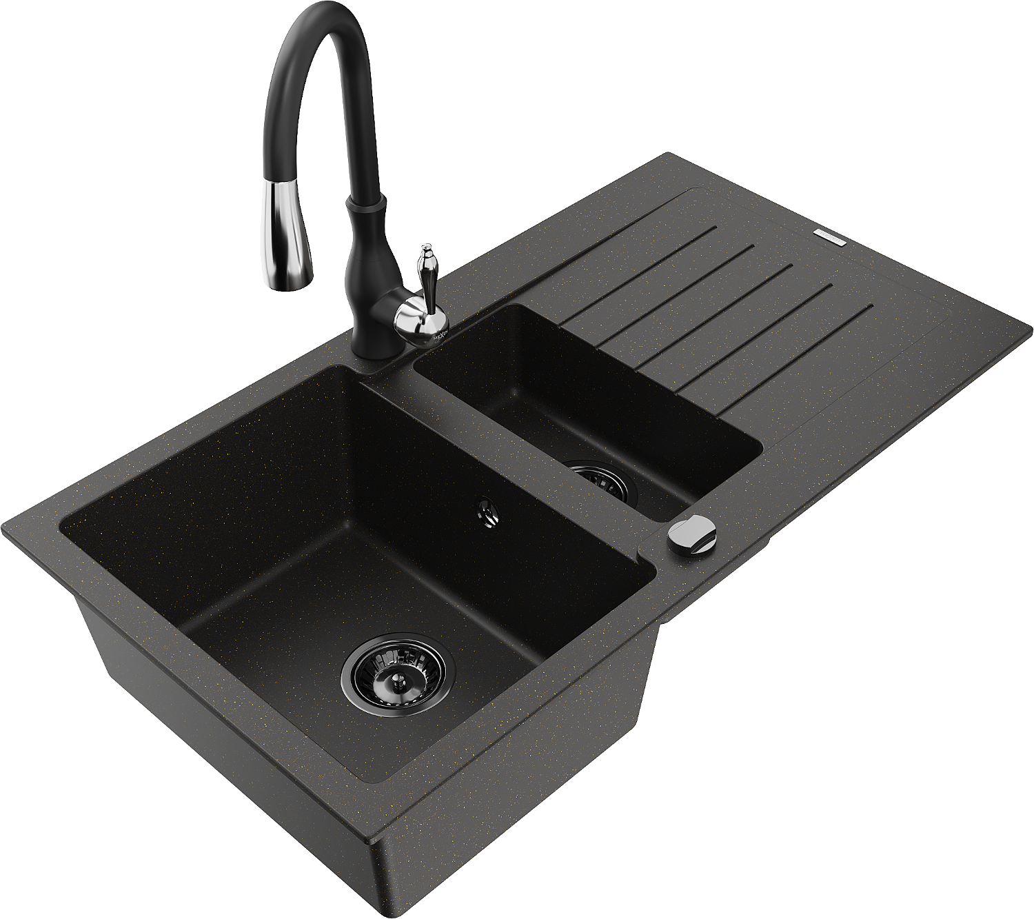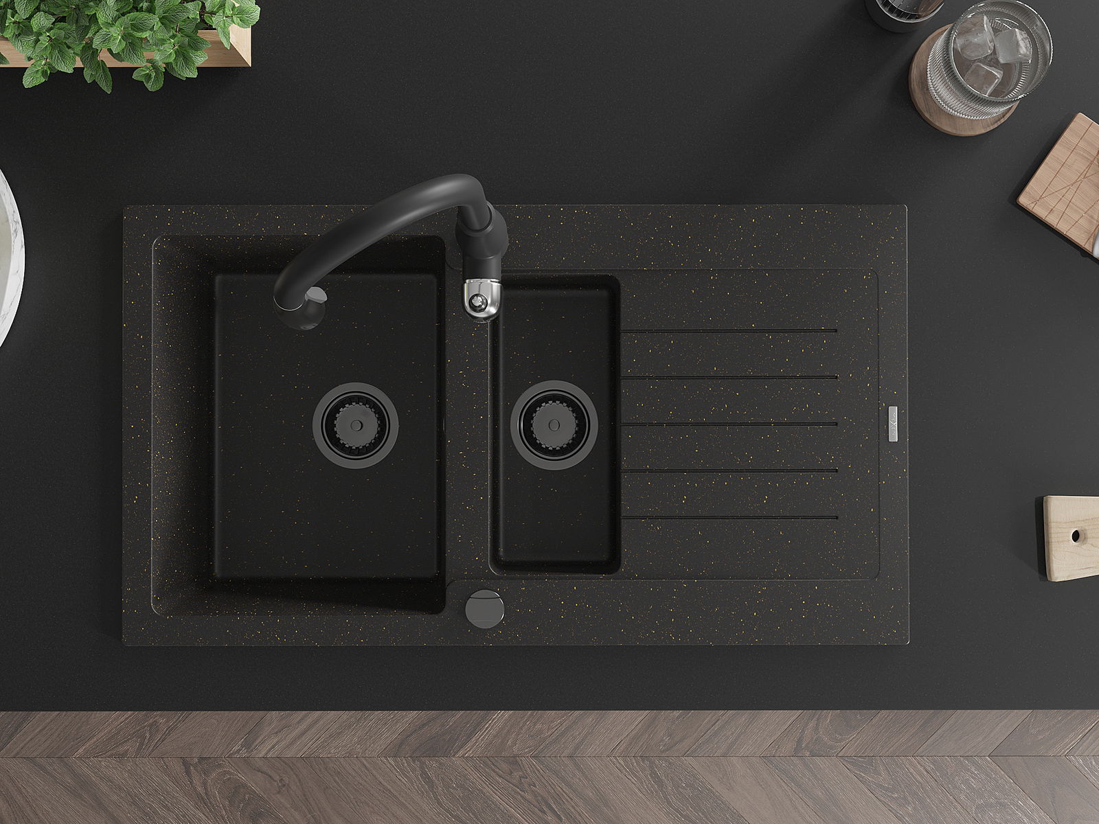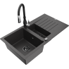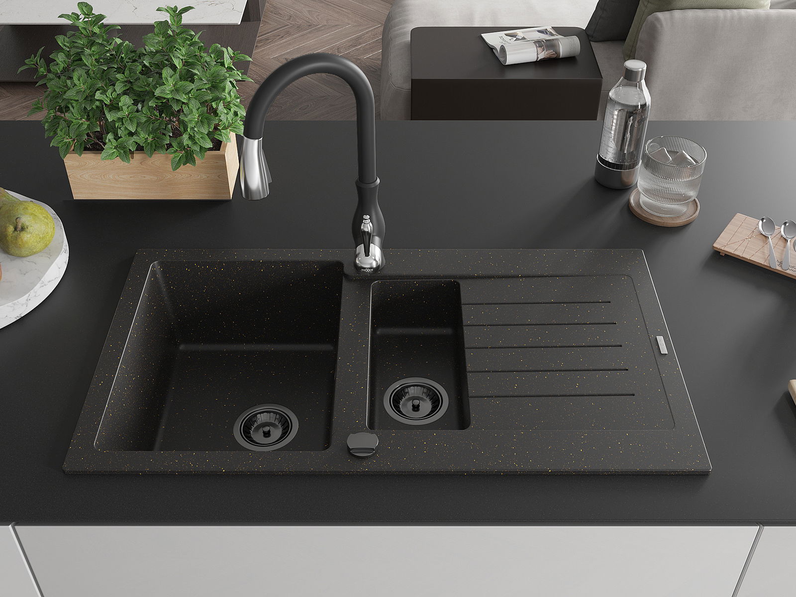 Mexen Matias 1,5 kamerų granitinis plautuvas su nutekėjimo sritimi ir virtuvės čiaupu Savita, juodas/auksinis