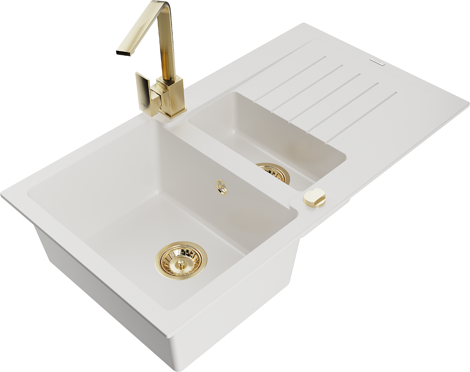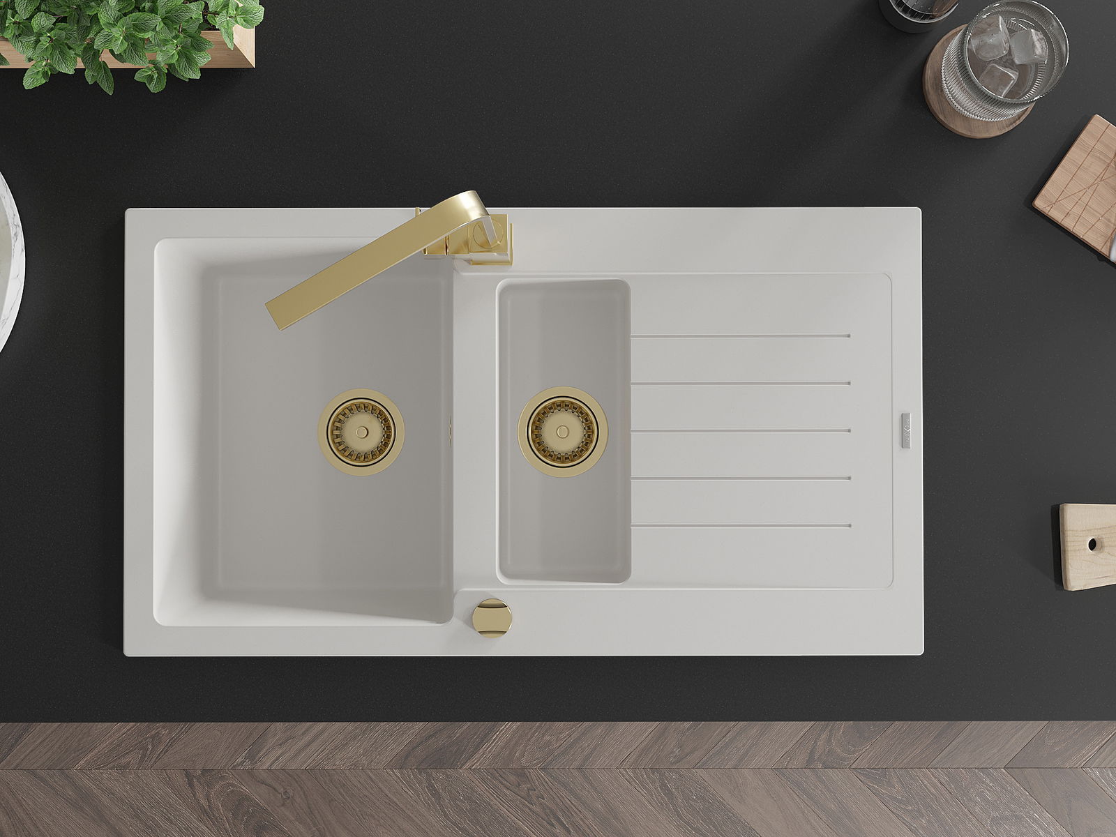 Mexen Matias akmens masės plautuvė 1,5 kamerų su nuvarvėjimo paviršiumi ir virtuvės maišytuvu Rita, balta - 6502-20-670300-50