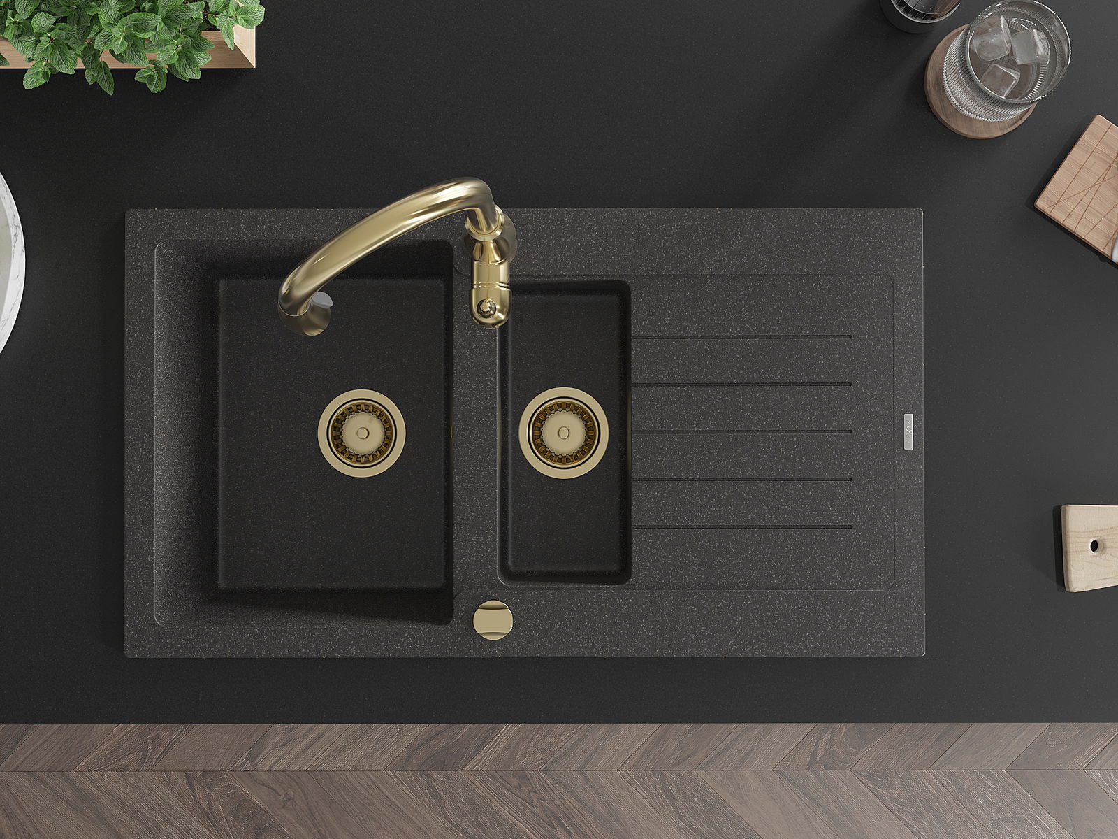 Kriauklė turi 2 iš anksto frezuotas skyles, kurių skersmuo yra 35 mm, skirtas savarankiškam išmušimui. Jas galima naudoti, pavyzdžiui, skysčio dozatoriaus montavimui, kuris pašalins plastikinių butelių buvimą virtuvėje ir suteiks jai elegantišką apdailą.
