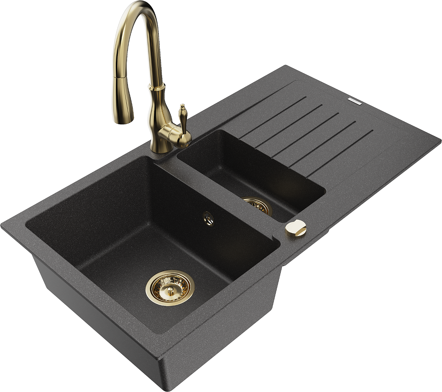 Mexen Matias 1,5 kamerų granitinė virtuvės kriauklė su nuvarvėjimo vieta ir virtuviniu čiaupu Savita, juodas taškuotas