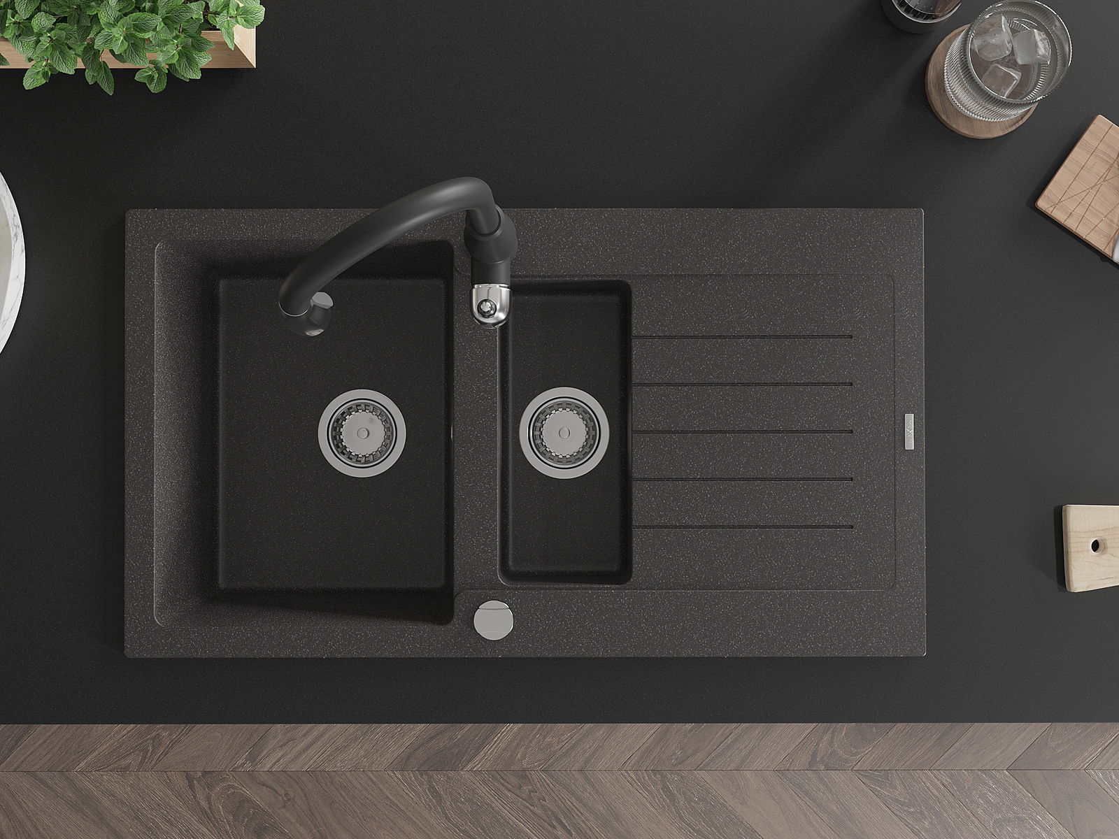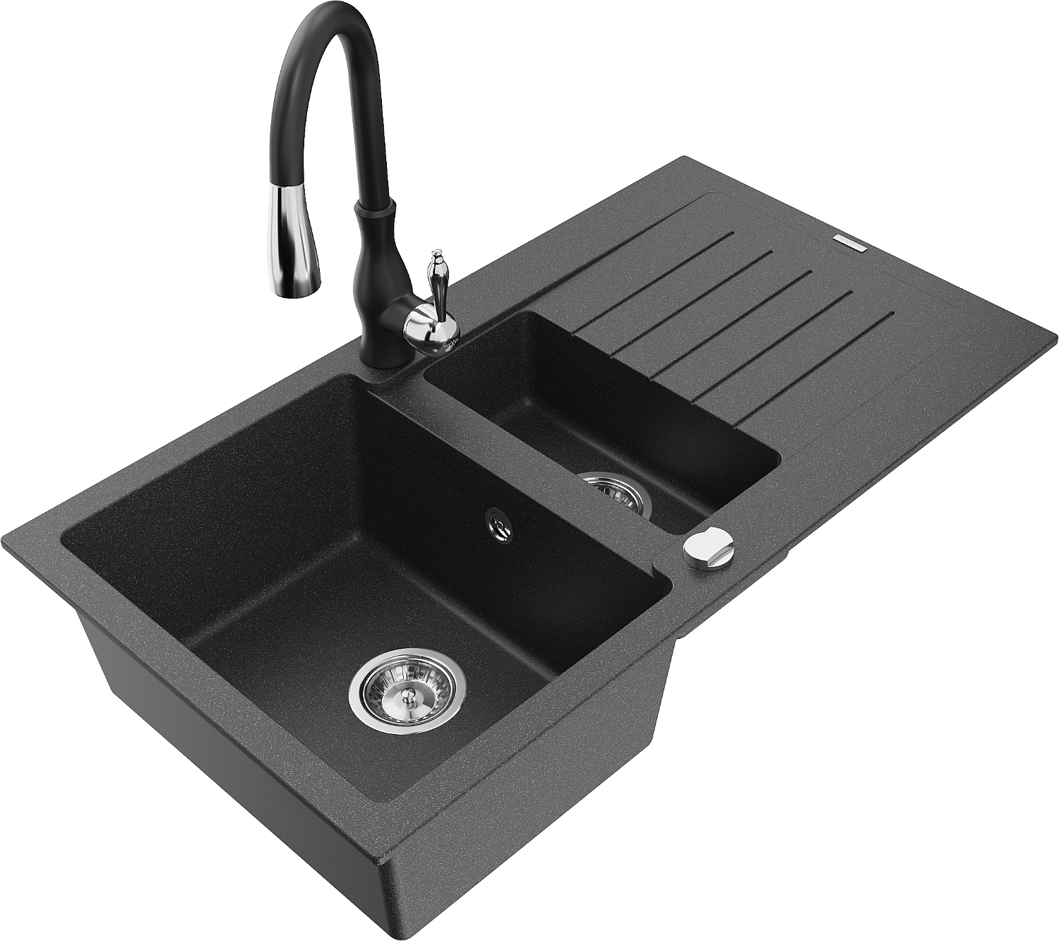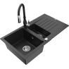 Mexen Matias granitinė 1,5 sekcijos plautuvė su nutekėjimo vieta ir virtuviniu maišytuvu Savita, juoda su taškeliais