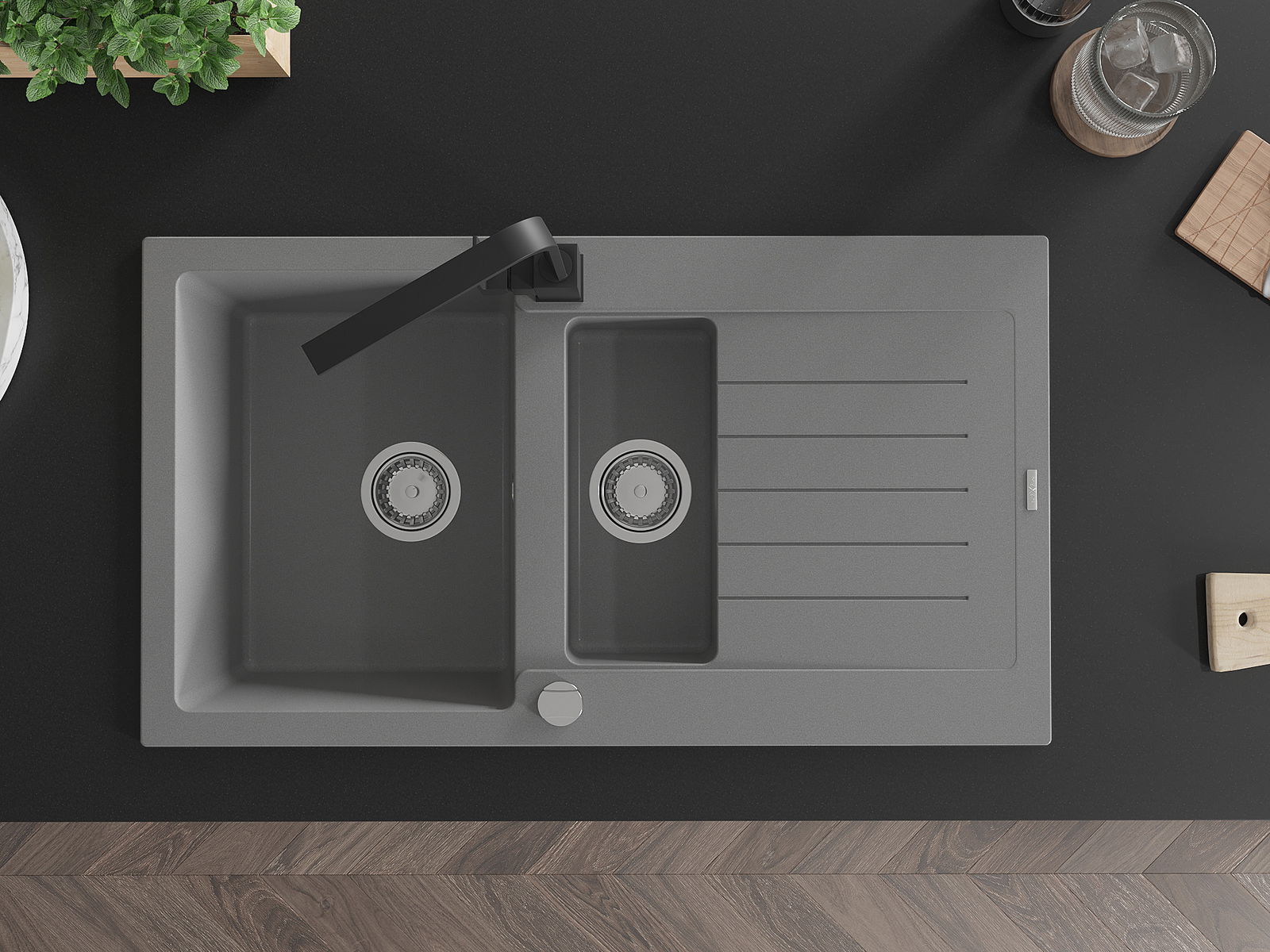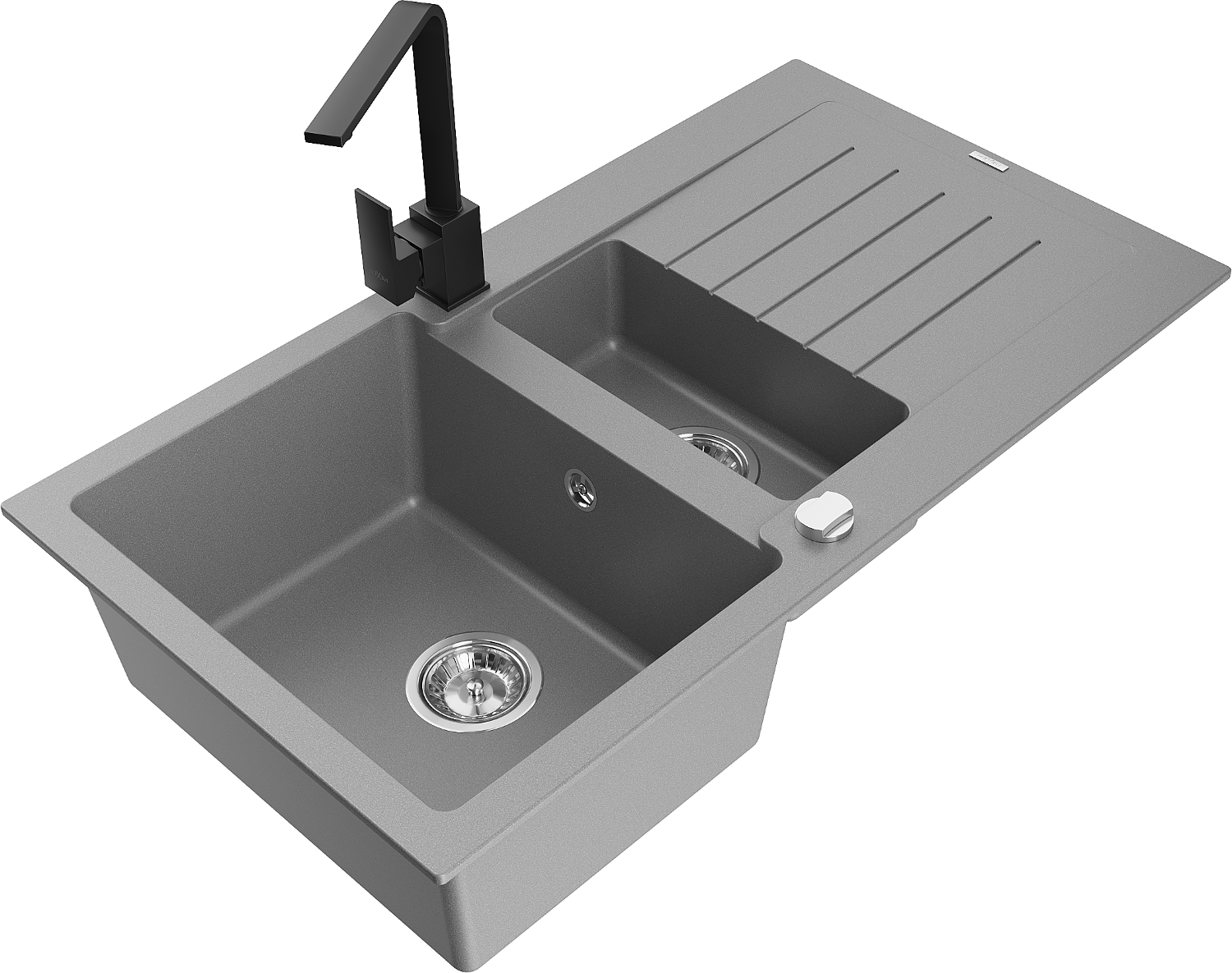 Mexen Matias granitinis 1,5 kamerų plautuvė su nutekamuoju padėklu ir virtuviniu maišytuvu Rita, pilka - 6502-71-670300-70