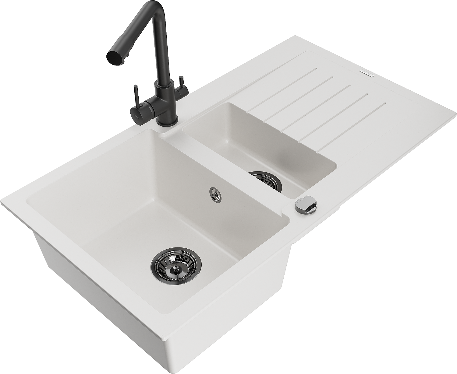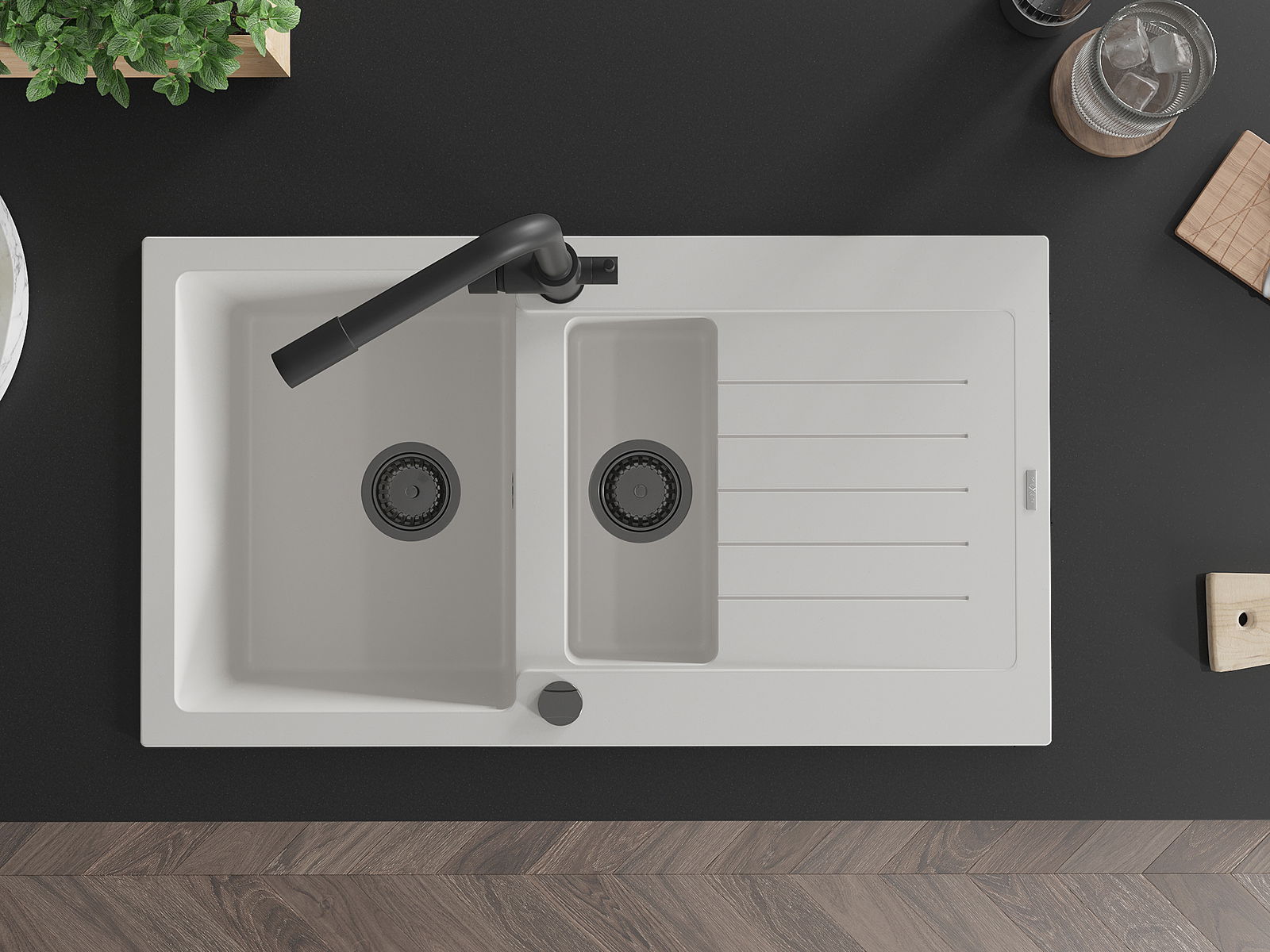Mexen Matias granito plautuvė, 1,5 dubens su nutekėjimo vieta ir virtuviniu maišytuvu Duero, balta - 6502-20-671600-70