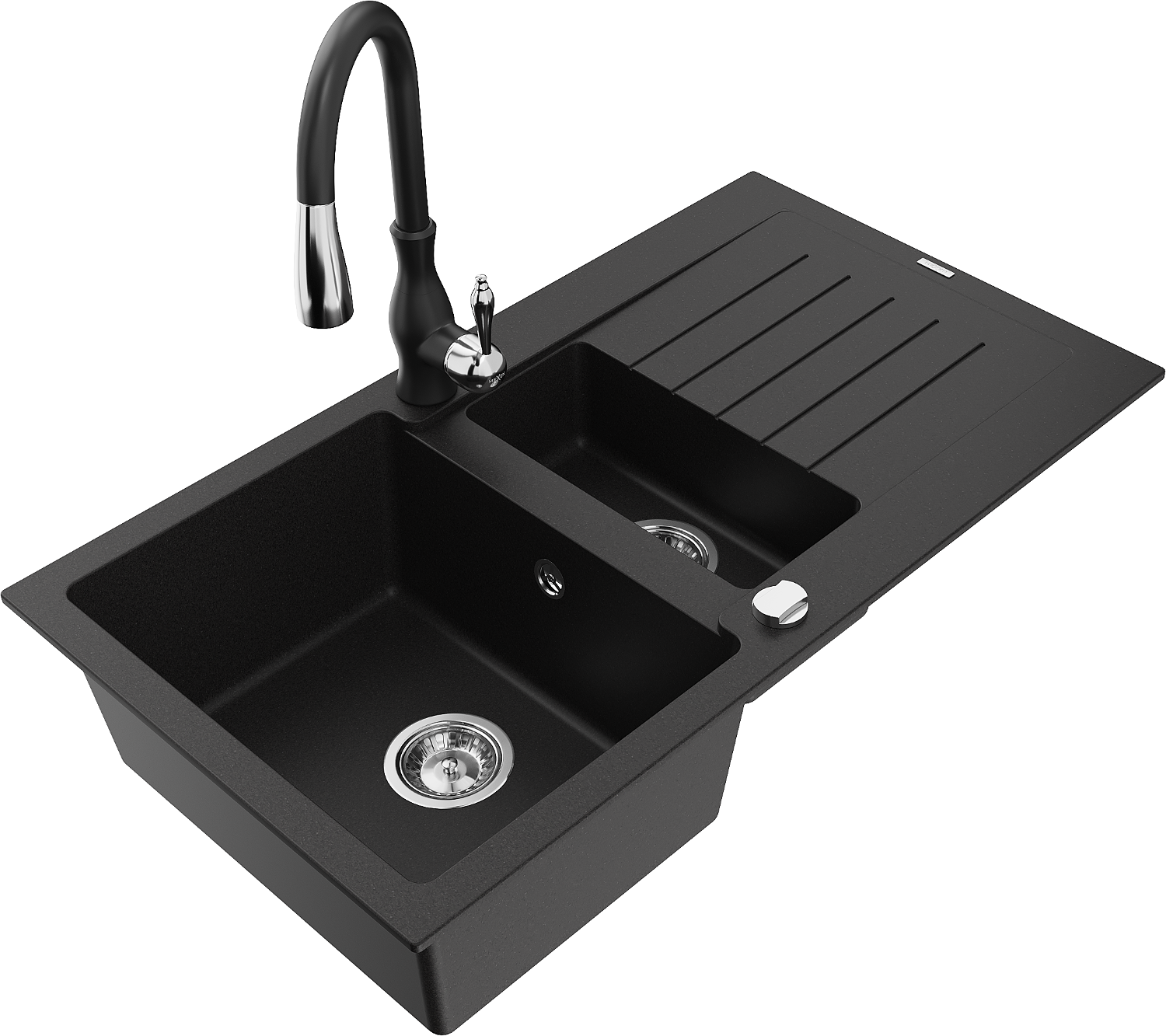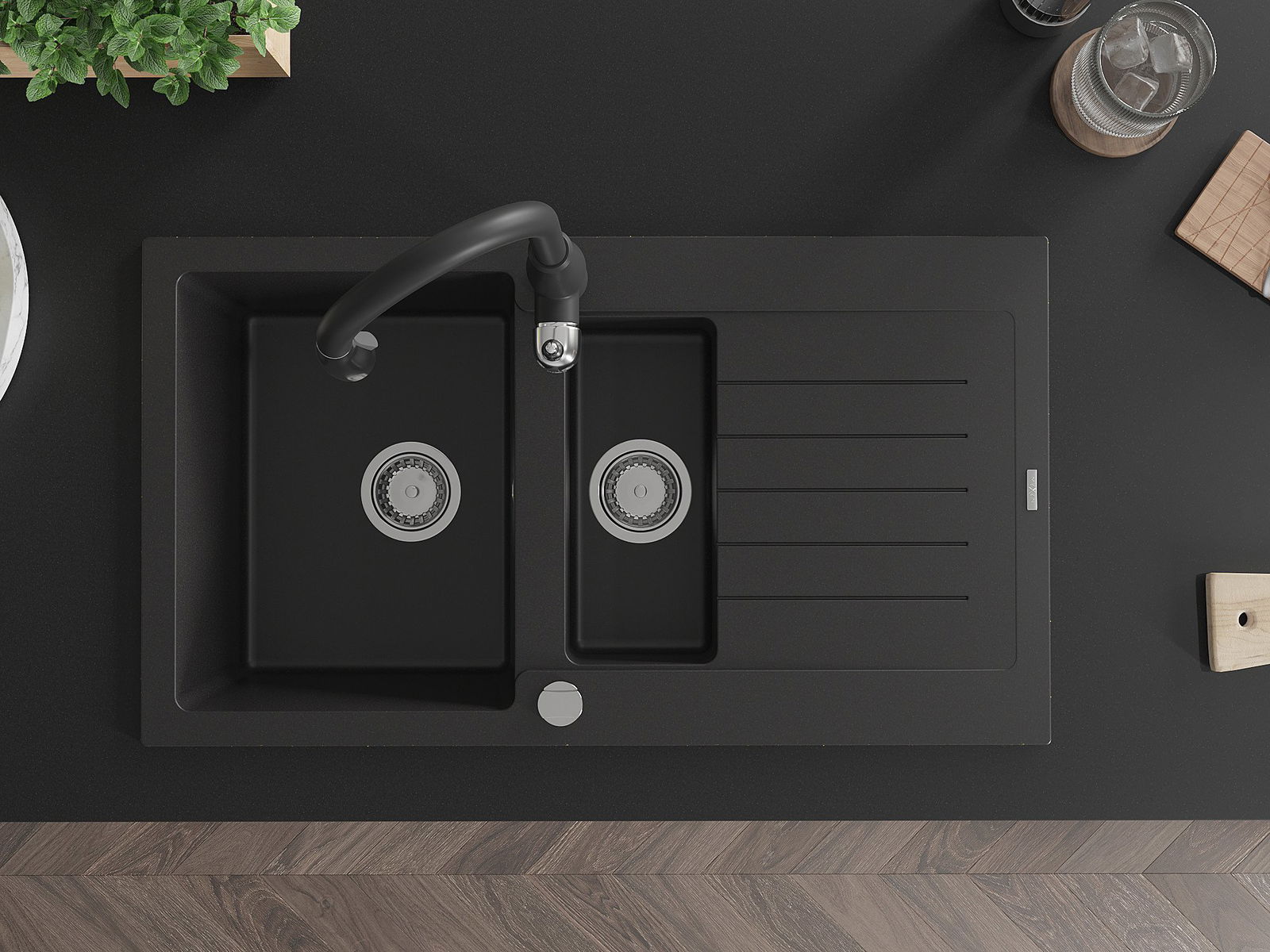 Mexen Matias granitinis plautuvė 1,5 skylių su lašeliu ir virtuvės maišytuvu Savita, juodas - 6502-77-672601-70