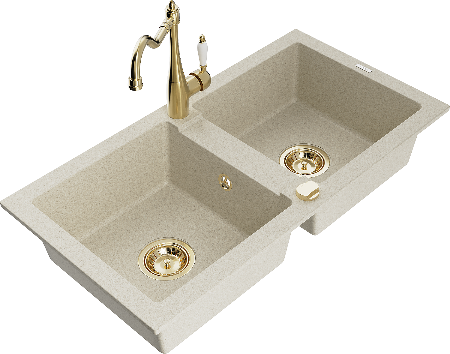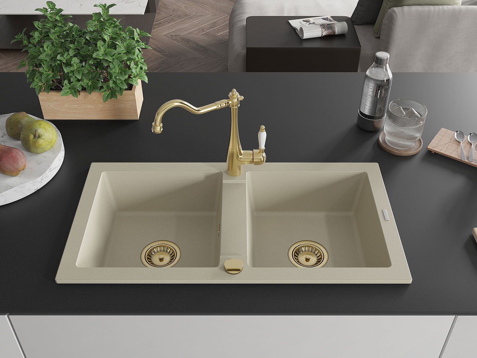 Mexen Mario granito plautuvė su dviguba kriaukle ir virtuviniu maišytuvu Carla, smėlio spalvos - 6504-69-670700-50