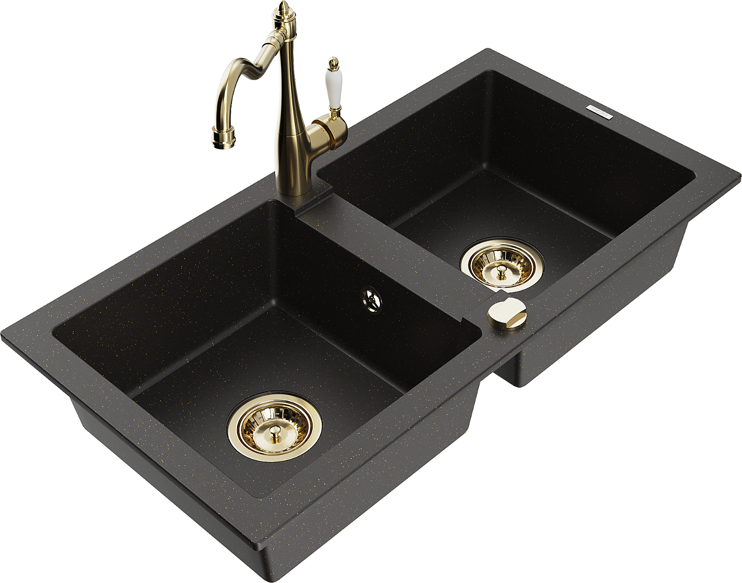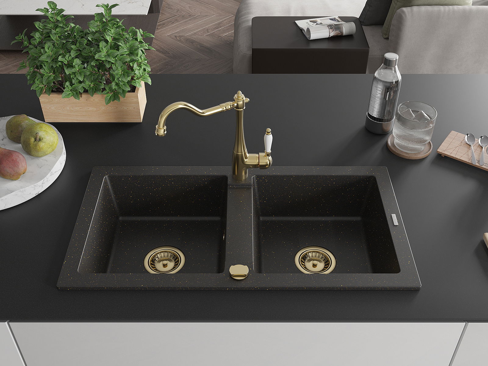 Mexen Mario granitinė dviejų skylių virtuvės plautuvė su maišytuvu Carla, juoda/aukso metalikas - 6504-75-670700-50