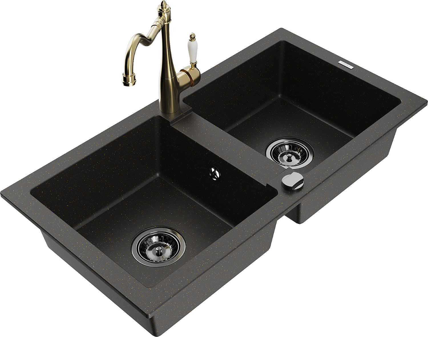 Mexen Mario granitinė dviejų skyrių plautuvė su virtuviniu maišytuvu Carla, juoda/auksinis metalikas - 6504-75-670700-50-B