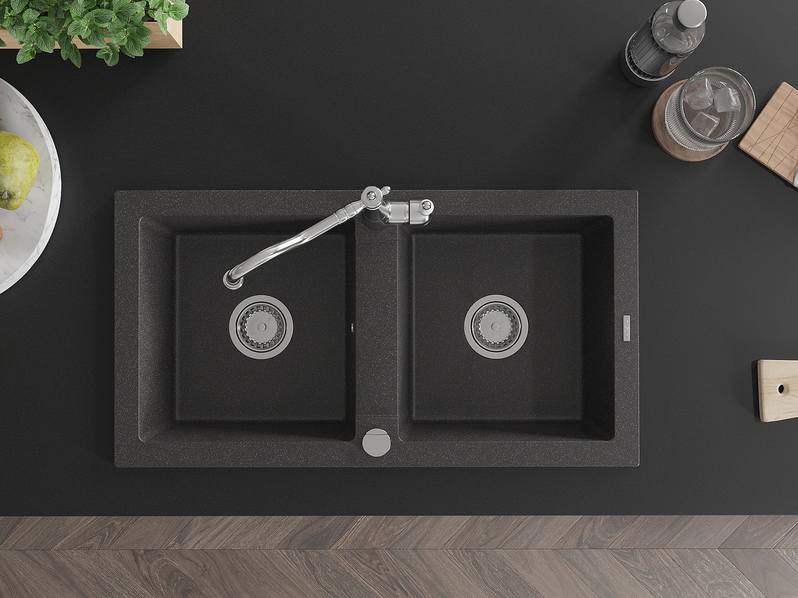 Mexen Mario granitinė dviejų skyrių plautuvė su virtuviniu maišytuvu Carla, juoda su dėmelėmis - 6504-76-670700-00