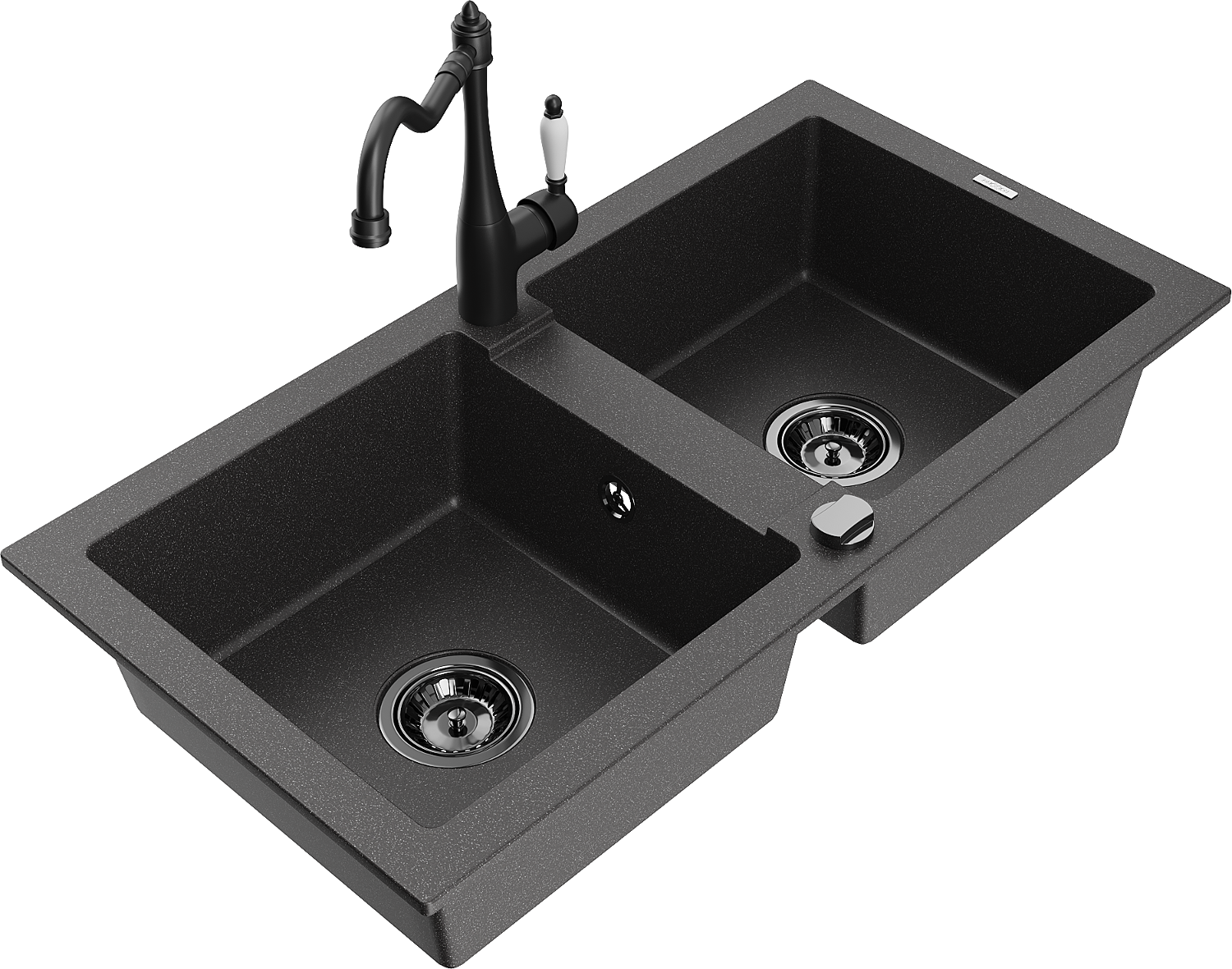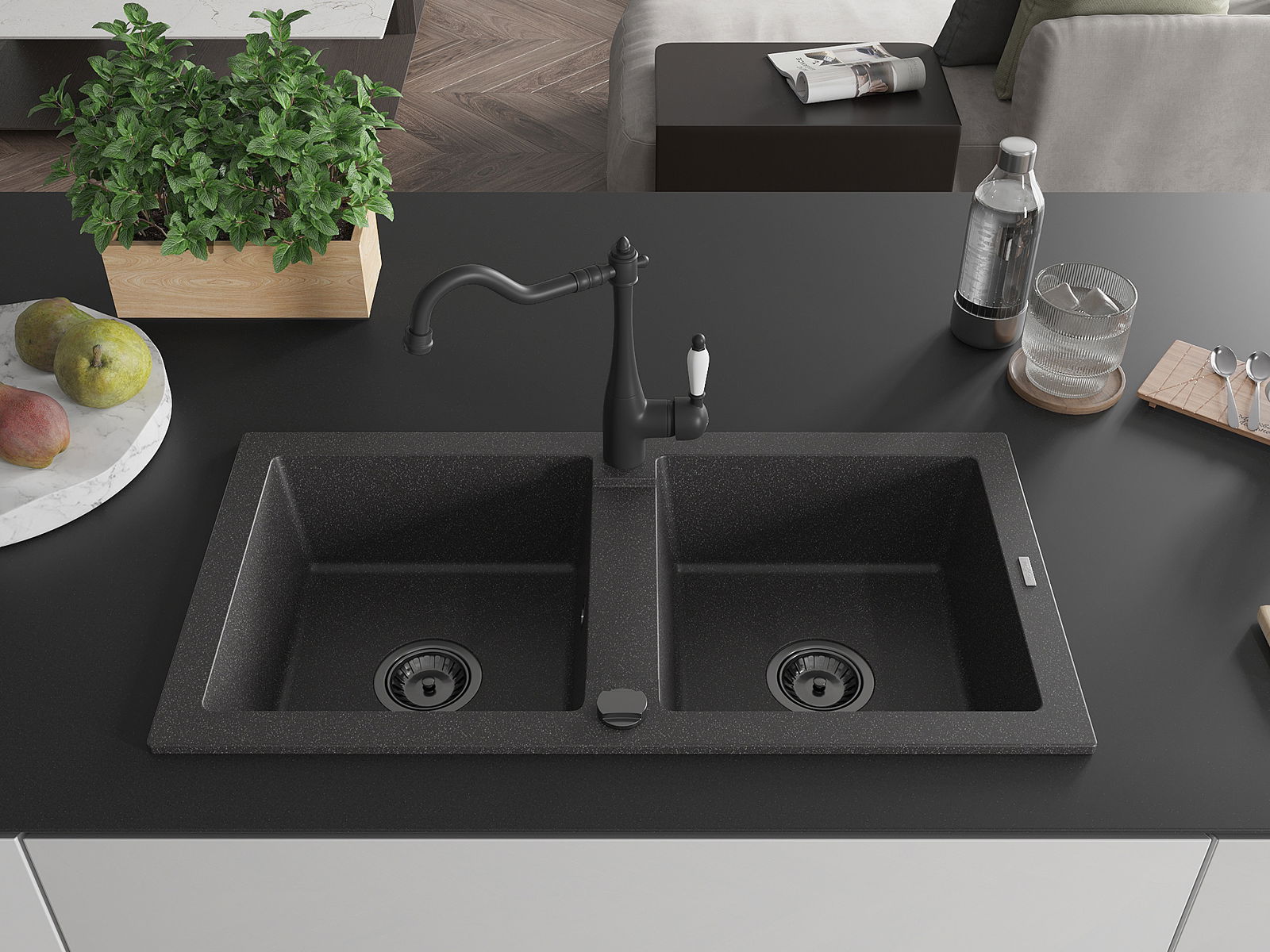 Mexen Mario granitinė 2 skyrių virtuvės plautuvė su Carla maišytuvu, juoda su taškeliais - 6504-76-670700-70-B